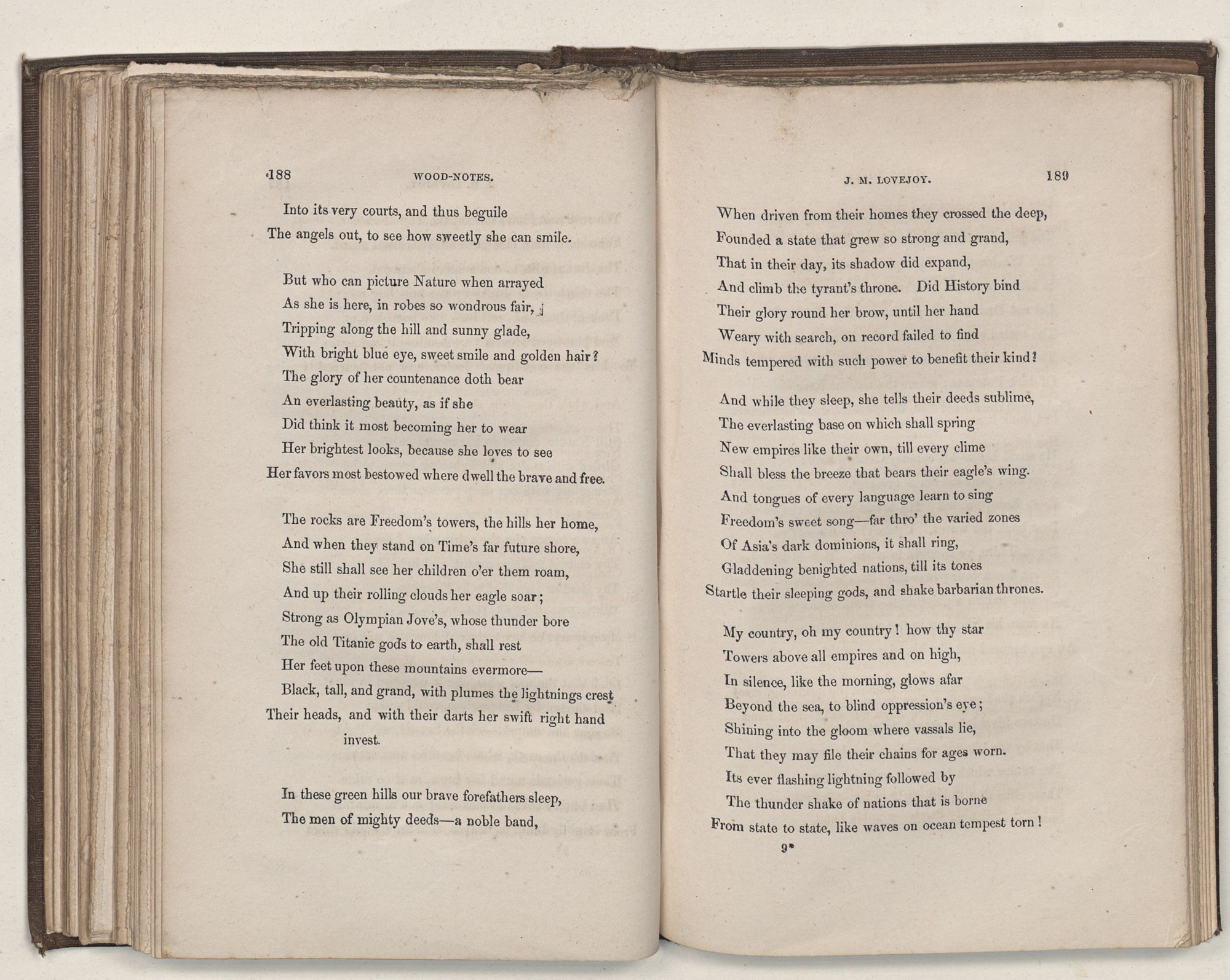Into its very courts, and thus beguileThe angels out, to see how sweetly she can smile.But who can picture Nature when arrayedAs she is here, in robes so wondrous fair,Tripping along the hill and sunny glade,With bright blue eye, sweet smile and golden hair?The glory of her countenance doth bearAn everlasting beauty, as if sheDid think it most becoming her to wearHer brightest looks, because she loves to seeHer favors most bestowed where dwell the brave and free.The rocks are Freedom's towers, the hills her home,And when they stand on Time's far future shore,She still shall see her children o'er them roam,And up their rolling clouds her eagle soar;Strong as Olympian Jove's, whose thunder boreThe old Titanic gods to earth, shall restHer feet upon these mountains evermore—Black, tall, and grand, with plumes the lightnings crestTheir heads, and with their darts her swift right hand invest.In these green hills our brave forefathers sleep,The men of mighty deeds—a noble band,When driven from their homes they crossed the deep,Founded a state that grew so strong and grand,That in their day, its shadow did expand,And climb the tyrant's throne. Did History bindTheir glory round her brow, until her handWeary with search, on record failed to findMinds tempered with such power to benefit their kind?And while they sleep, she tells their deeds sublime,The everlasting base on which shall springNew empires like their own, till every climeShall bless the breeze that bears their eagle's wing.And tongues of every language learn to singFreedom's sweet song—far thro’ the varied zonesOf Asia's dark dominions, it shall ring,Gladdening benighted nations, till its tonesStartle their sleeping gods, and shake barbarian thrones.My country, oh my country! how thy starTowers above all empires and on high,In silence, like the morning, glows afarBeyond the sea, to blind oppression's eye;Shining into the gloom where vassals lie,That they may file their chains for ages worn.Its ever flashing lightning followed byThe thunder shake of nations that is borneFrom state to state, like waves on ocean tempest torn!