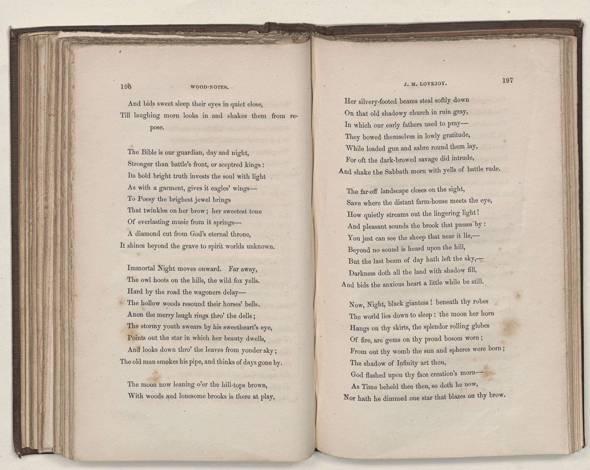 And bids sweet sleep their eyes in quiet close,Till laughing morn looks in and shakes them from repose.The Bible is our guardian, day and night,Stronger than battle's front, or sceptred kings:Its bold bright truth invests the soul with lightAs with a garment, gives it eagles’ wings—To Poesy the brighest jewel bringsThat twinkles on her brow; her sweetest toneOf everlasting music from it springs—A diamond cut from God's eternal throne,It shines beyond the grave to spirit worlds unknown.Immortal Night moves onward. Far away,The owl hoots on the hills, the wild fox yells.Hard by the road the wagoners delay—The hollow woods resound their horses’ bells.Anon the merry laugh rings thro’ the dells;The stormy youth swears by his sweetheart's eye,Points out the star in which her beauty dwells,And looks down thro’ the leaves from yonder sky;The old man smokes his pipe, and thinks of days gone by.The moon now leaning o'er the hill-tops brown,With woods and lonesome brooks is there at play,Her silvery-footed beams steal softly downOn that old shadowy church in ruin gray,In which our early fathers used to pray—They bowed themselves in lowly gratitude,While loaded gun and sabre round them lay,For oft the dark-browed savage did intrude,And shake the Sabbath morn with yells of battle rude.The far-off landscape closes on the sight,Save where the distant farm-house meets the eye,How quietly streams out the lingering light!And pleasant sounds the brook that passes by:You just can see the sheep that near it lie,—Beyond no sound is heard upon the hill,But the last beam of day hath left the sky,—Darkness doth all the land with shadow fill,And bids the anxious heart a little while be still.Now, Night, black giantess! beneath thy robesThe world lies down to sleep: the moon her hornHangs on thy skirts, the splendor rolling globesOf fire, are gems on thy proud bosom worn;From out thy womb the sun and spheres were born;The shadow of Infinity art thou,God flashed upon thy face creation's morn—As Time beheld thee then, so doth he now,Nor hath he dimmed one star that blazes on thy brow.