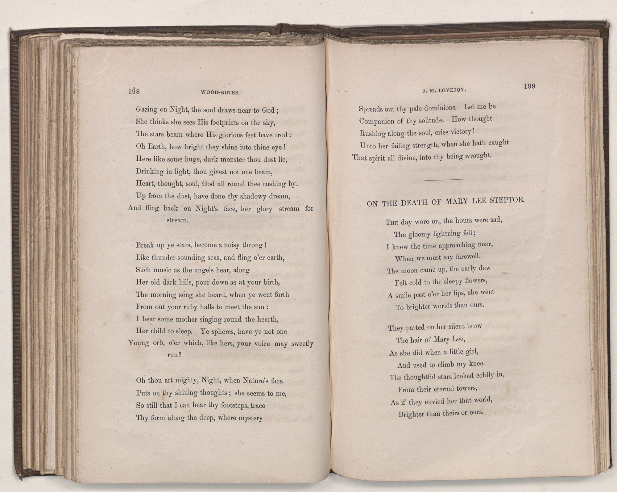 Gazing on Night, the soul draws near to God;She thinks she sees His footprints on the sky,The stars beam where His glorious feet have trod:Oh Earth, how bright they shine into thine eye!Here like some huge, dark monster thou dost lie,Drinking in light, thou givest not one beam,Heart, thought, soul, God all round thee rushing by.Up from the dust, have done thy shadowy dream,And fling back on Night's face, her glory stream for stream.Break up ye stars, become a noisy throng!Like thunder-sounding seas, and fling o'er earth,Such music as the angels hear, alongHer old dark hills, pour down as at your birth,The morning song she heard, when ye went forthFrom out your ruby halls to meet the sun:I hear some mother singing round the hearth,Her child to sleep. Ye spheres, have ye not oneYoung orb, o'er which, like hers, your voice may sweetly run?Oh thou art mighty, Night, when Nature's facePuts on thy shining thoughts; she seems to me,So still that I can hear thy footsteps, traceThy form along the deep, where mysterySpreads out thy pale dominions. Let me beCompanion of thy solitude. How thoughtRushing along the soul, cries victory!Unto her failing strength, when she hath caughtThat spirit all divine, into thy being wrought.ON THE DEATH OF MARY LEE STEPTOE.