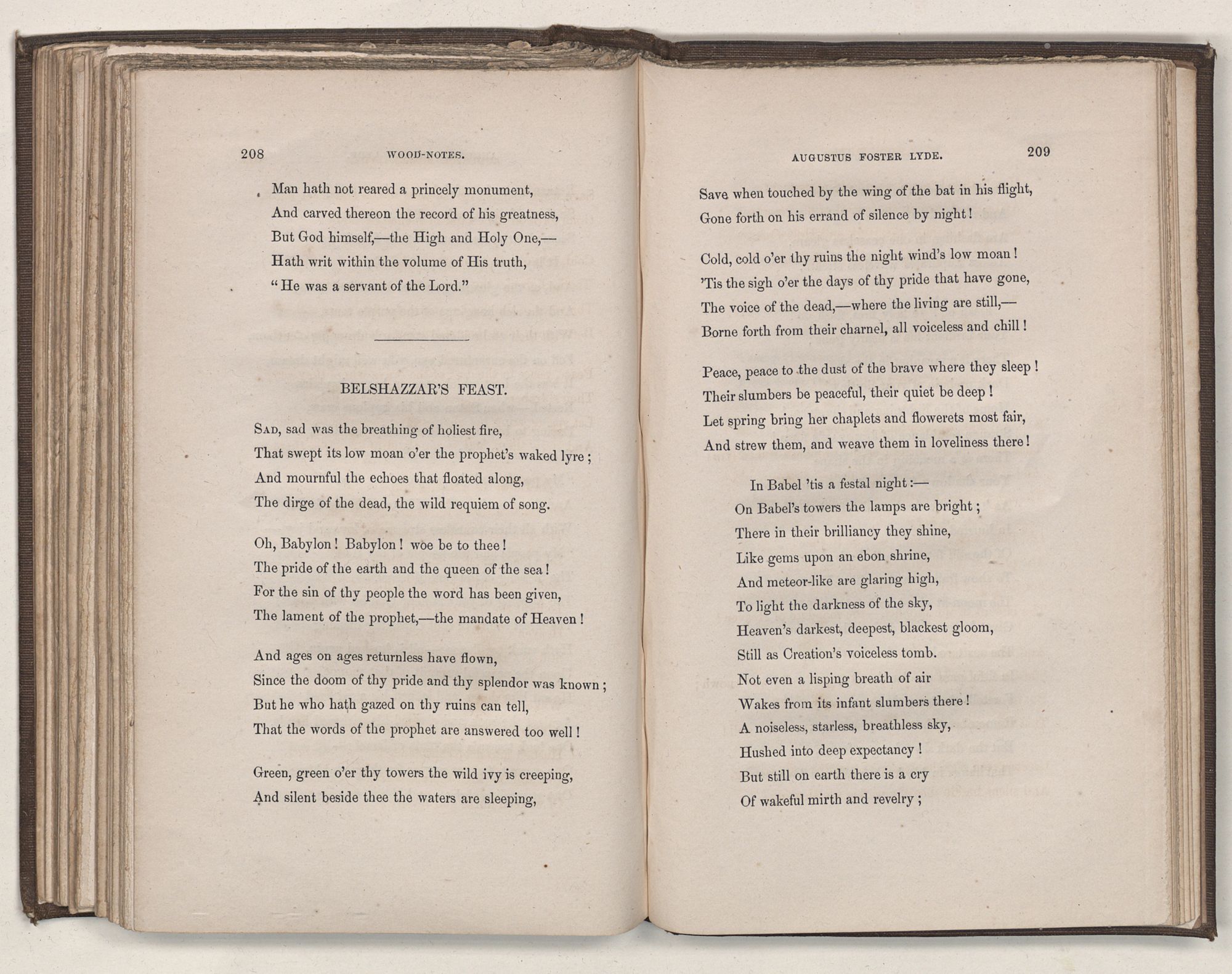 For Babel keeps her festal night,And all her lamps of holy lightAre flashing, in one ceaseless gleam,Across Euphrates’ waveless stream.Flash on! ye holy fires, flash on!Your brilliant life is nearly gone;There is a meaning in the sky,Dark prelude of your destiny!Home of the lightning and the storm!Strange semblance of JEHOVAH'S form!There is a meaning in the shapeYour shadowy forms will sometimes take;As ’twere the marks which feelings trace,In hurried outline on the faceOf the still future;—all that's given,To show frail man the will of Heaven.The moon-lit cloud, so bright, so fair,Gives hopes of joy and gladness near;The scattered mist that hurries byIn fitful passage o'er the sky,Foretells the tears that pass away,Remembered but with yesterday;But the dark sky of angry frown,That hangs in blackening stillness down,Tells of the deepest saddest woe,That mortal man may taste or know.And Babel's king was on his throne,And Babel's princes round him shone;And Babel's youth and beauty allAre gathered in that glittering hall:Young Hope and Love are beaming nowFrom every fair and noble brow,Where pomp and pageant move along,To the rich melody of song;The clanging horn, the melting flute,And sweetly pensive, plaintive lute,Wake the hushed echoes of that pile,And swell along each vaulted aisle,Then touching on some softer strain,Sink to their holy rest again.Circassia's lovely ones are there,And Arab maid of raven hair,That floats, in playful tresses, downA neck of loveliest, richest brown,With laughing eyes that brightly flash,Beneath the long and dark eye-lash,Like India's pearls in ocean-cave,That sparkle thro’ the sleeping wave;—