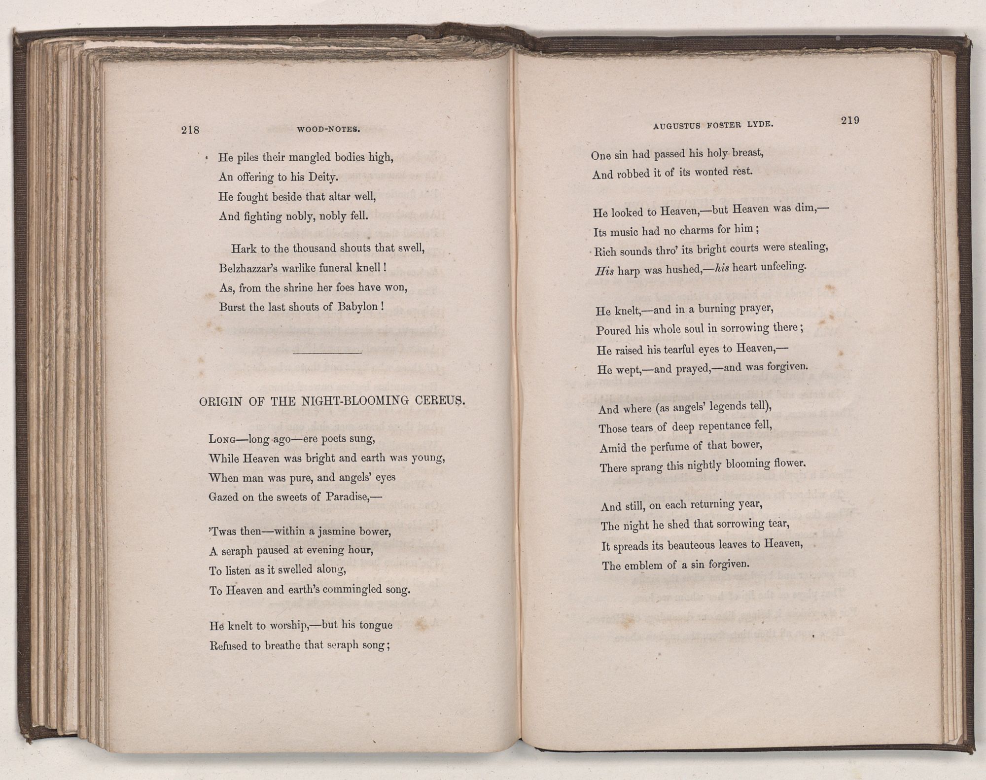 LONG—long ago—ere poets sung,While Heaven was bright and earth was young,When man was pure, and angels’ eyesGazed on the sweets of Paradise,—’Twas then—within a jasmine bower,A seraph paused at evening hour,To listen as it swelled along,To Heaven and earth's commingled song.He knelt to worship,—but his tongueRefused to breathe that seraph song;One sin had passed his holy breast,And robbed it of its wonted rest.He looked to Heaven,—but Heaven was dim,—Its music had no charms for him;Rich sounds thro’ its bright courts were stealing,His harp was hushed,—his heart unfeeling.He knelt,—and in a burning prayer,Poured his whole soul in sorrowing there;He raised his tearful eyes to Heaven,—He wept,—and prayed,—and was forgiven.And where (as angels’ legends tell),Those tears of deep repentance fell,Amid the perfume of that bower,There sprang this nightly blooming flower.And still, on each returning year,The night he shed that sorrowing tear,It spreads its beauteous leaves to Heaven,The emblem of a sin forgiven.
