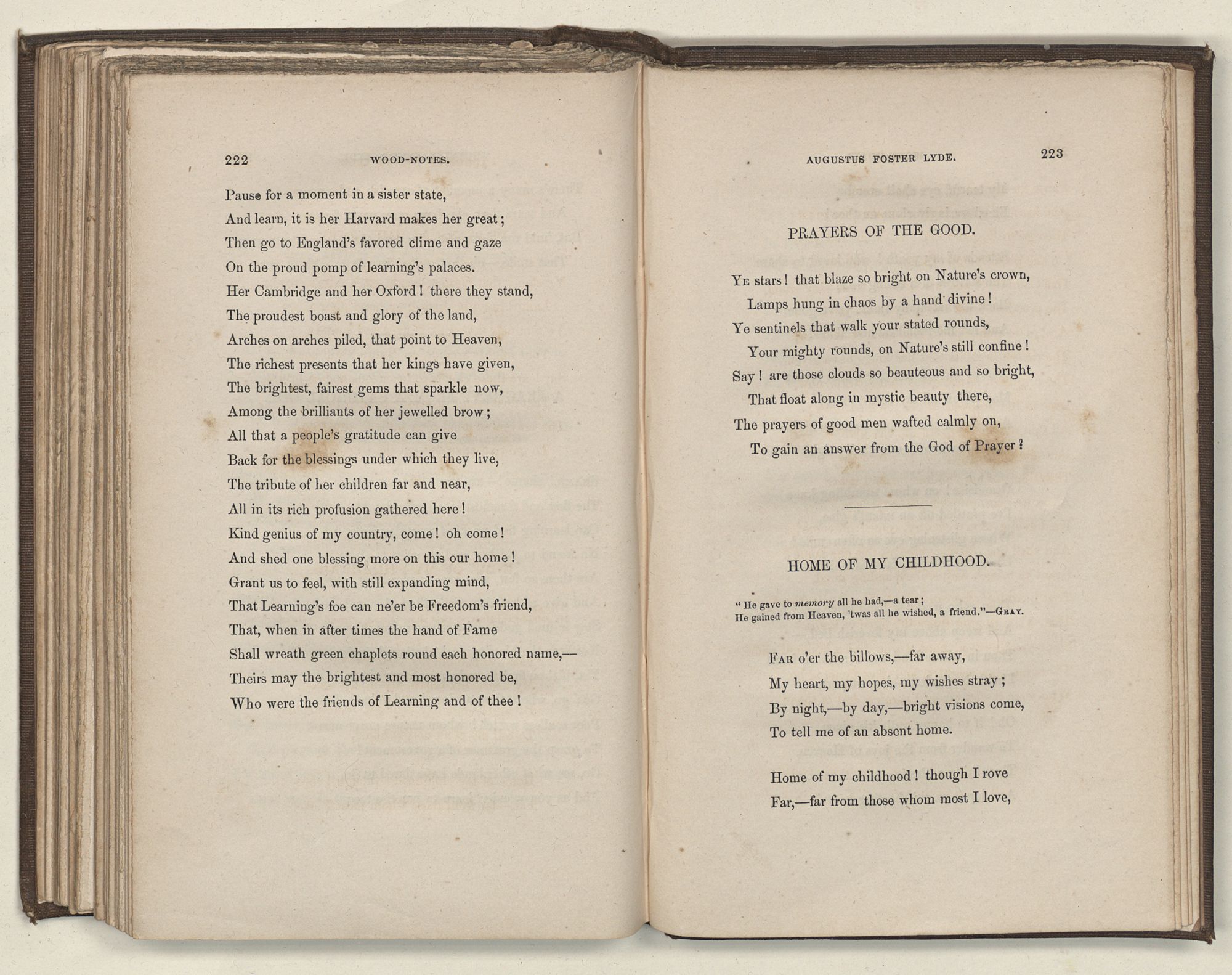 SHAME shame!—are these the men who are called to standThe first and foremost in a happy land?Can learning find no kind reception here,No friend to aid her, and no voice to cheer?Are there so few, who care to plead her cause,And give us learning while they give us laws?Stay injured goddess! yet one moment stay,Nor bear the blessings, which thou bring'st, away!Yet, if thou find no welcome on our shore,Go; go, where thou art loved and valued more.Poor soulless wretch! whom nature never meantTo grasp the greatness of a government!Go, see what other lands have dared to do,And as you wonder, learn to practise too;Pause for a moment in a sister state,And learn, it is her Harvard makes her great;Then go to England's favored clime and gazeOn the proud pomp of learning's palaces.Her Cambridge and her Oxford! there they stand,The proudest boast and glory of the land,Arches on arches piled, that point to Heaven,The richest presents that her kings have given,The brightest, fairest gems that sparkle now,Among the brilliants of her jewelled brow;All that a people's gratitude can giveBack for the blessings under which they live,The tribute of her children far and near,All in its rich profusion gathered here!Kind genius of my country, come! oh come!And shed one blessing more on this our home!Grant us to feel, with still expanding mind,That Learning's foe can ne'er be Freedom's friend,That, when in after times the hand of FameShall wreath green chaplets round each honored name,—Theirs may the brightest and most honored be,Who were the friends of Learning and of thee!PRAYERS OF THE GOOD.