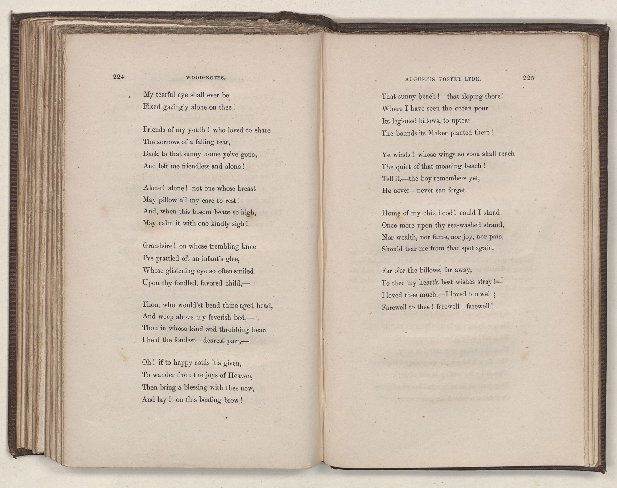 My tearful eye shall ever beFixed gazingly alone on thee!Friends of my youth! who loved to shareThe sorrows of a falling tear,Back to that sunny home ye've gone,And left me friendless and alone!Alone! alone! not one whose breastMay pillow all my care to rest!And, when this bosom beats so high,May calm it with one kindly sigh!Grandsire! on whose trembling kneeI've prattled oft an infant's glee,Whose glistening eye so often smiledUpon thy fondled, favored child,—Thou, who would'st bend thine aged head,And weep above my feverish bed,—Thou in whose kind and throbbing heartI held the fondest—dearest part,—Oh! if to happy souls ’tis given,To wander from the joys of Heaven,Then bring a blessing with thee now,And lay it on this beating brow!That sunny beach!—that sloping shore!Where I have seen the ocean pourIts legioned billows, to uptearThe bounds its Maker planted there!Ye winds! whose wings so soon shall reachThe quiet of that moaning beach!Tell it,—the boy remembers yet,He never—never can forget.Home of my childhood! could I standOnce more upon thy sea-washed strand,Nor wealth, nor fame, nor joy, nor pain,Should tear me from that spot again.Far o'er the billows, far away,To thee my heart's best wishes stray!—I loved thee much,—I loved too well;Farewell to thee! farewell! farewell!