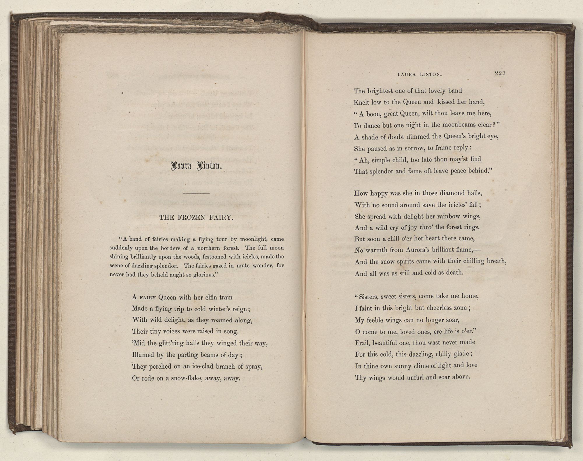 A FAIRY Queen with her elfin trainMade a flying trip to cold winter's reign;With wild delight, as they roamed along,Their tiny voices were raised in song.’Mid the glitt'ring halls they winged their way,Illumed by the parting beams of day;They perched on an ice-clad branch of spray,Or rode on a snow-flake, away, away.The brightest one of that lovely bandKnelt low to the Queen and kissed her hand,“A boon, great Queen, wilt thou leave me here,To dance but one night in the moonbeams clear?”A shade of doubt dimmed the Queen's bright eye,She paused as in sorrow, to frame reply:“Ah, simple child, too late thou may'st findThat splendor and fame oft leave peace behind.”How happy was she in those diamond halls,With no sound around save the icicles’ fall;She spread with delight her rainbow wings,And a wild cry of joy thro’ the forest rings.But soon a chill o'er her heart there came,No warmth from Aurora's brilliant flame,—And the snow spirits came with their chilling breath.And all was as still and cold as death.“Sisters, sweet sisters, come take me home,I faint in this bright but cheerless zone;My feeble wings can no longer soar,O come to me, loved ones, ere life is o'er.”Frail, beautiful one, thou wast never madeFor this cold, this dazzling, chilly glade;In thine own sunny clime of light and loveThy wings would unfurl and soar above.“Gifted, yet humble one,” sigh not to roamFrom the simple delight of thy own lowly home:Hope not to find in a loftier sphere,The peace and content which await thee here.Ah! many have sought, mid the world's cold glare,To rest their warm hopes and affections there;And too late have they found that tho’ fair and bright,The dream of fame ends in death and night.THE FROZEN CRYSTAL DROP.