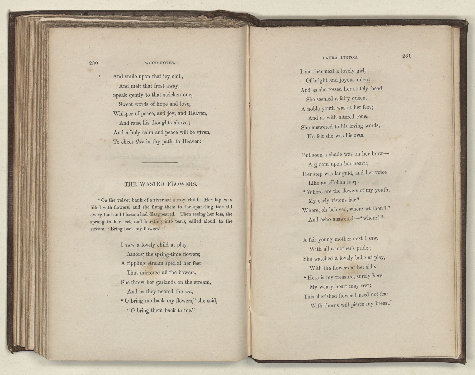 “On the velvet bank of a river sat a rosy child. Her lap was filled with flowers, and she flung them to the sparkling tide till every bud and blossom had disappeared. Then seeing her loss, she sprang to her feet, and bursting into tears, called aloud to the stream, ‘Bring back my flowers!’ ”