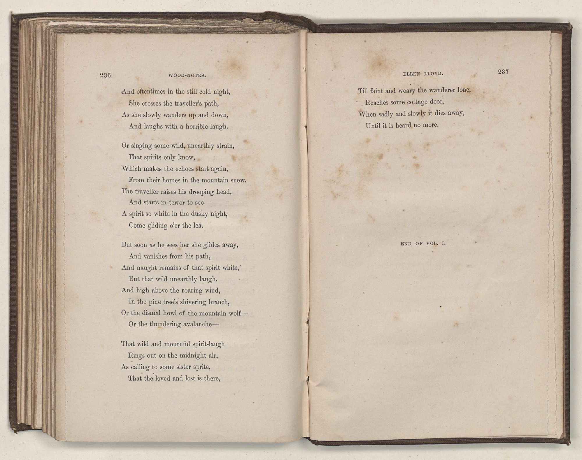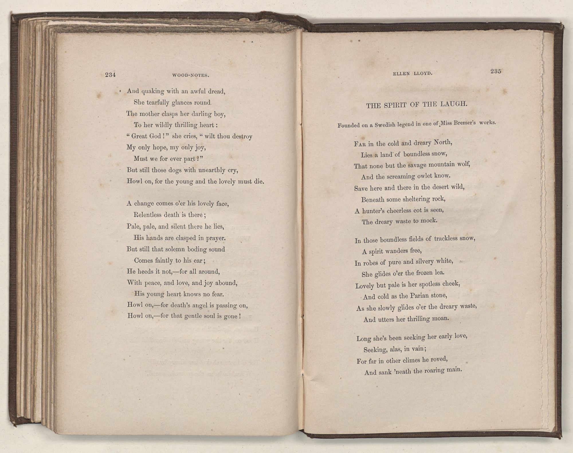 FAR in the cold and dreary North,Lies a land of boundless snow,That none but the savage mountain wolf,And the screaming owlet know.Save here and there in the desert wild,Beneath some sheltering rock,A hunter's cheerless cot is seen,The dreary waste to mock.In those boundless fields of trackless snow,A spirit wanders free,In robes of pure and silvery white,She glides o'er the frozen lea.Lovely but pale is her spotless cheek,And cold as the Parian stone,As she slowly glides o'er the dreary waste,And utters her thrilling moan.Long she's been seeking her early love,Seeking, alas, in vain;For far in other climes he roved,And sank ’neath the roaring main.And oftentimes in the still cold night,She crosses the traveller's path,As she slowly wanders up and down,And laughs with a horrible laugh.Or singing some wild, unearthly strain,That spirits only know,Which makes the echoes start again,From their homes in the mountain snow.The traveller raises his drooping head,And starts in terror to seeA spirit so white in the dusky night,Come gliding o'er the lea.But soon as he sees her she glides away,And vanishes from his path,And naught remains of that spirit white,But that wild unearthly laugh.And high above the roaring wind,In the pine tree's shivering branch,Or the dismal howl of the mountain wolf—Or the thundering avalanche—That wild and mournful spirit-laughRings out on the midnight air,As calling to some sister sprite,That the loved and lost is there,Till faint and weary the wanderer lone,Reaches some cottage door,When sadly and slowly it dies away,Until it is heard no more.END OF VOL. I.