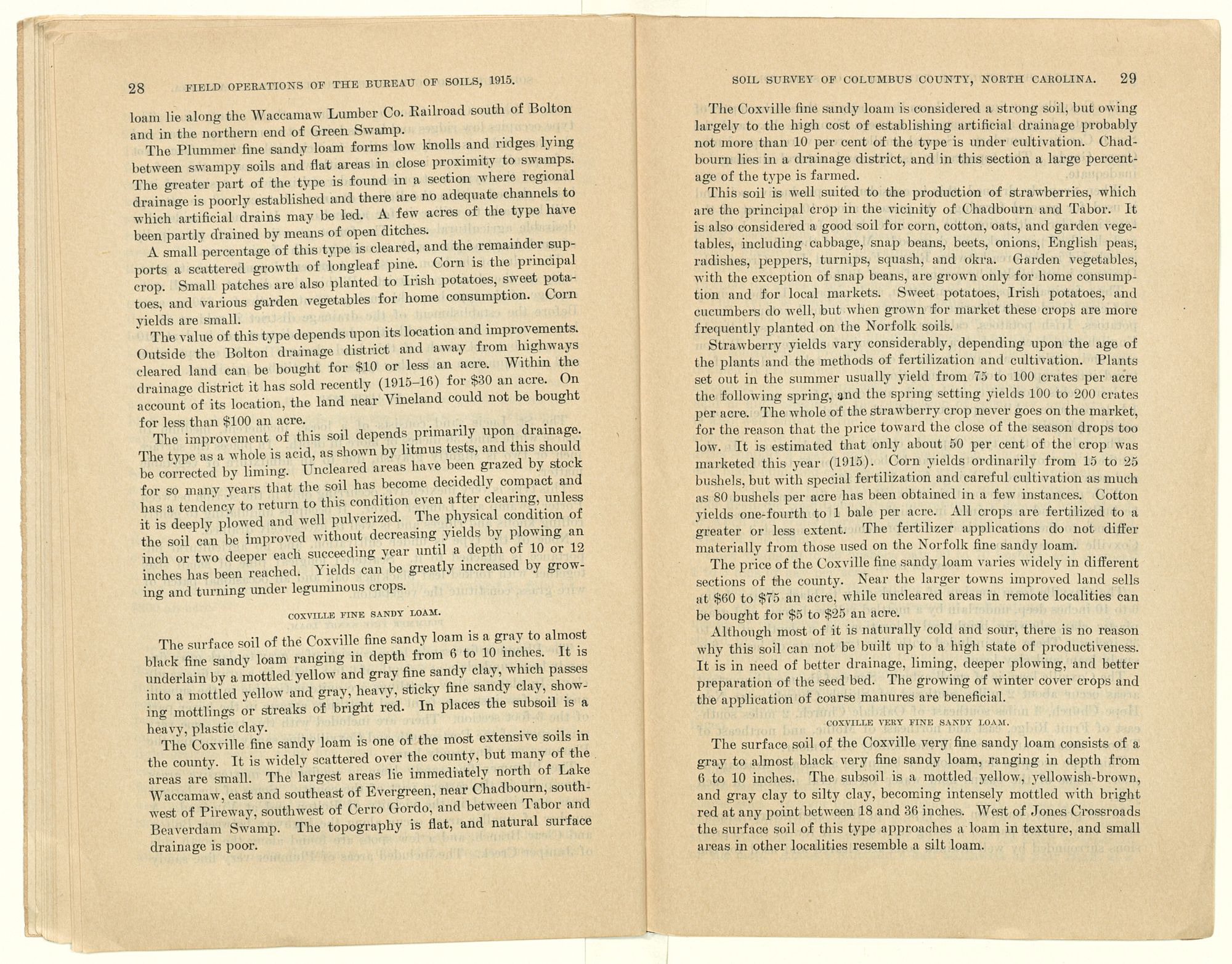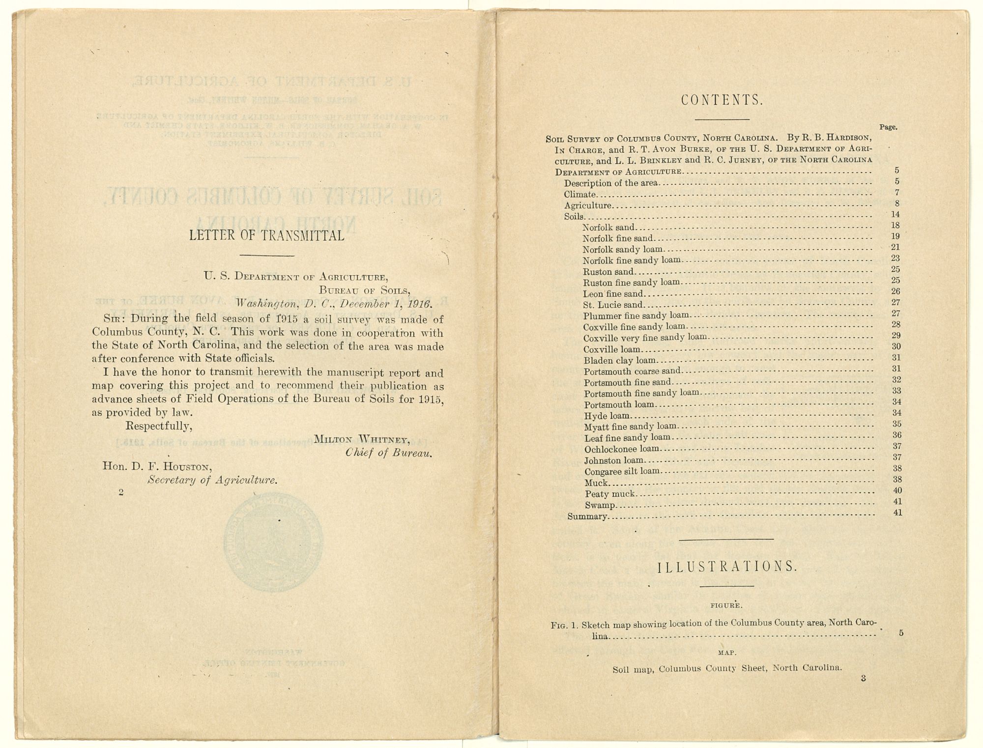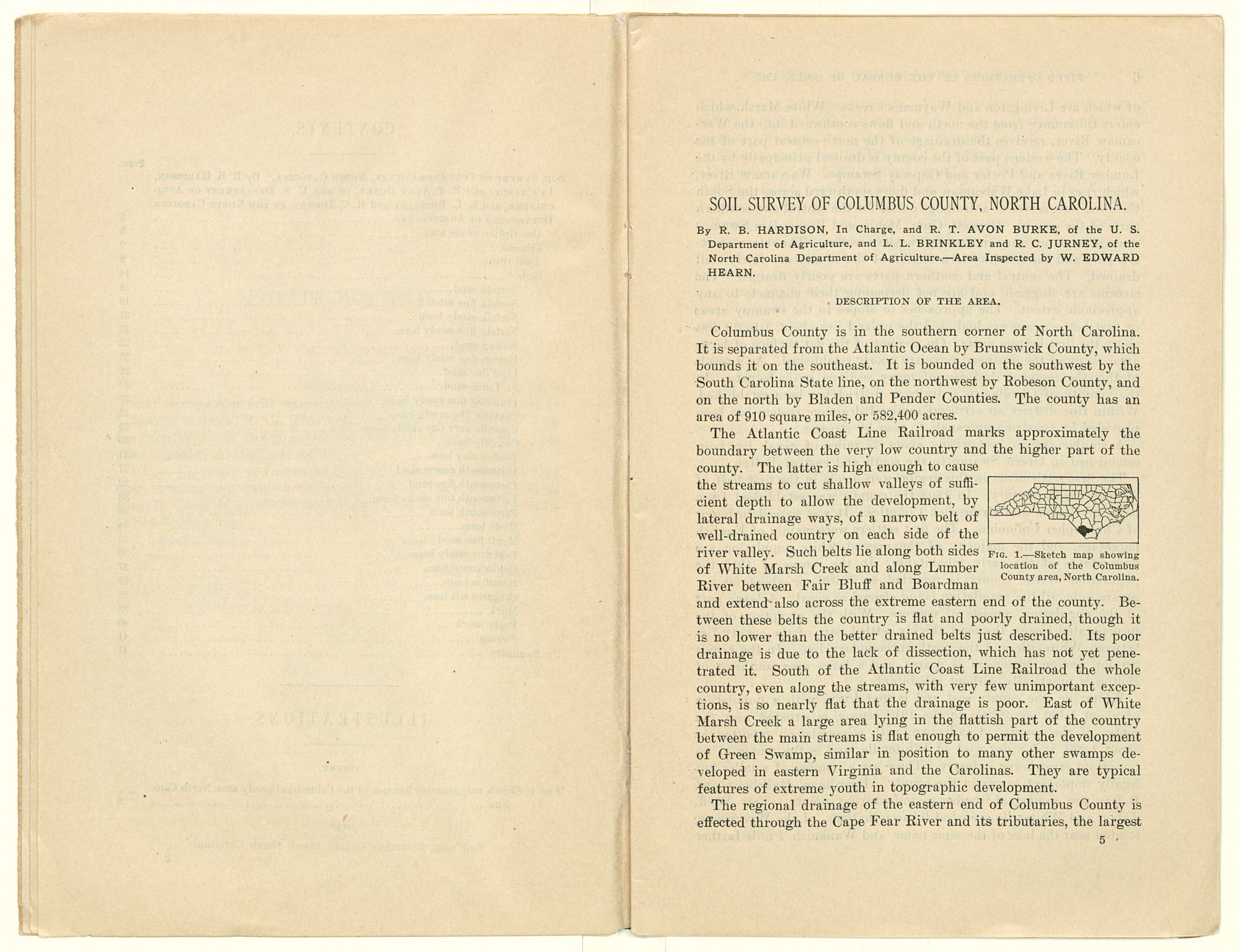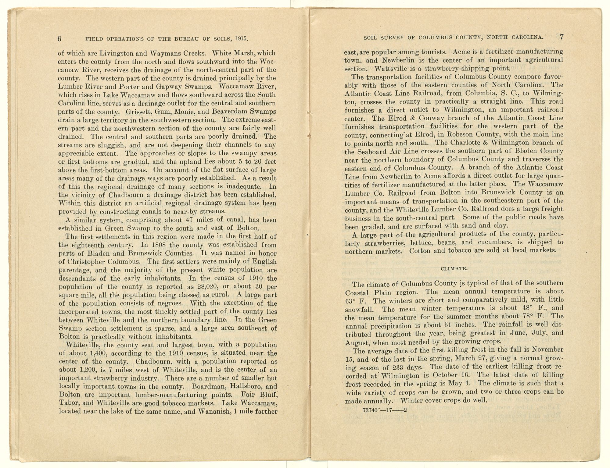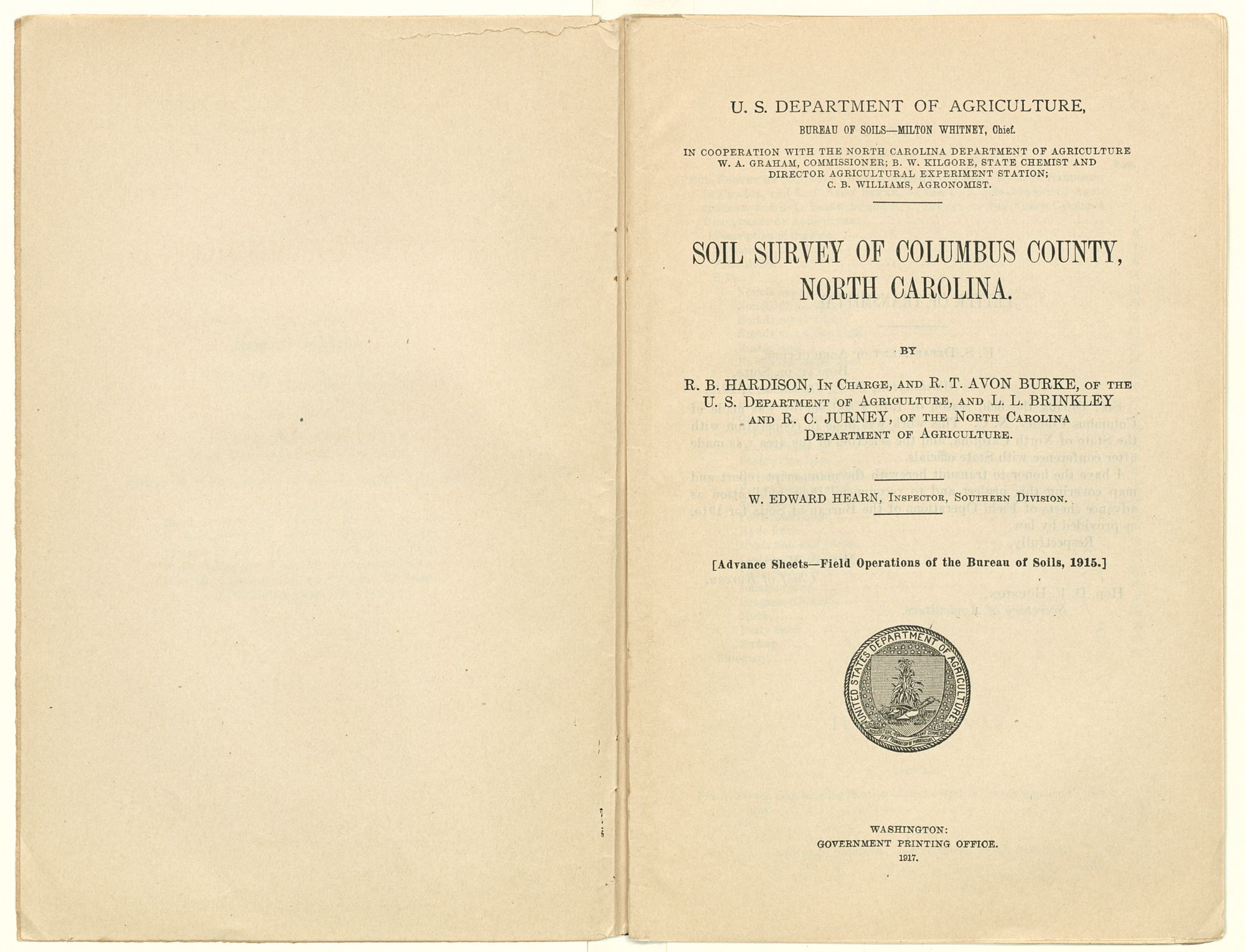 U. S. DEPARTMENT OF AGRICULTURE, BUREAU OF SOILS—MILTON WHITNEY, Chief. IN COOPERATION WITH THE NORTH CAROLINA DEPARTMENT OF AGRICULTURE W. A. GRAHAM, COMMISSIONER; B. W. KILGORE, STATE CHEMIST AND DIRECTOR AGRICULTURAL EXPERIMENT STATION; C. B. WILLIAMS, AGRONOMIST.SOIL SURVEY OF COLUMBUS COUNTY, NORTH CAROLINA.BY R. B. HARDISON, IN CHARGE, AND R. T. AVON BURKE, OF THE U. S. DEPARTMENT OF AGRICULTURE, AND L. L. BRINKLEY AND R. C. JURNEY, OF THE NORTH CAROLINA DEPARTMENT OF AGRICULTURE.W. EDWARD HEARN, INSPECTOR, SOUTHERN DIVISION. [Advance Sheets—Field Operations of the Bureau of Soils, 1915.]United States Department of Agriculture 1862 Agriculture is the Foundation of Manufacture and Commerce 1889