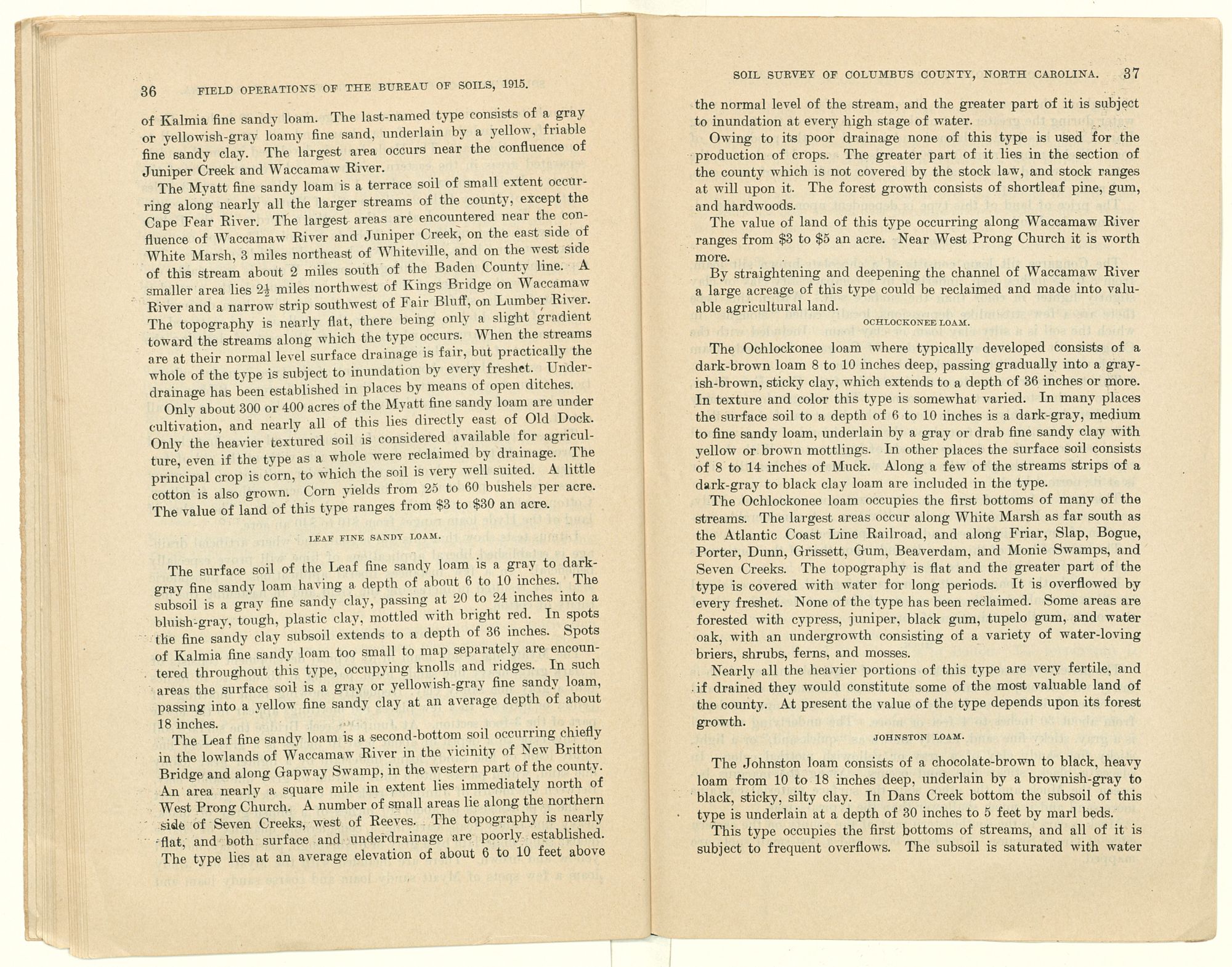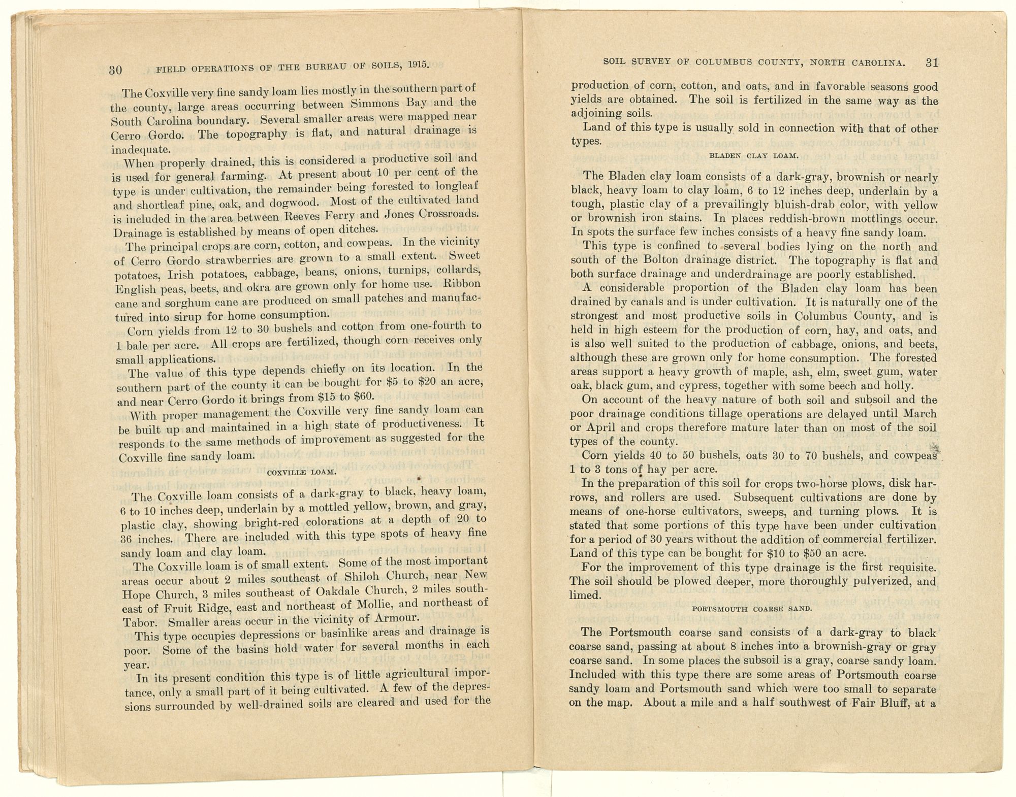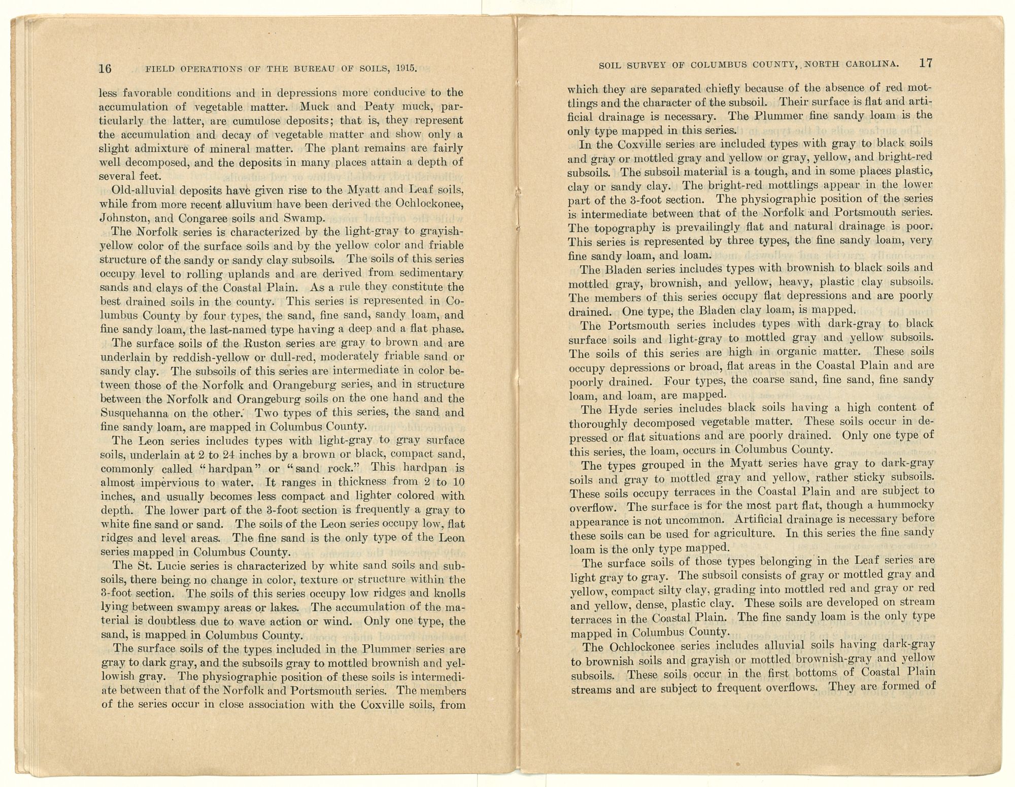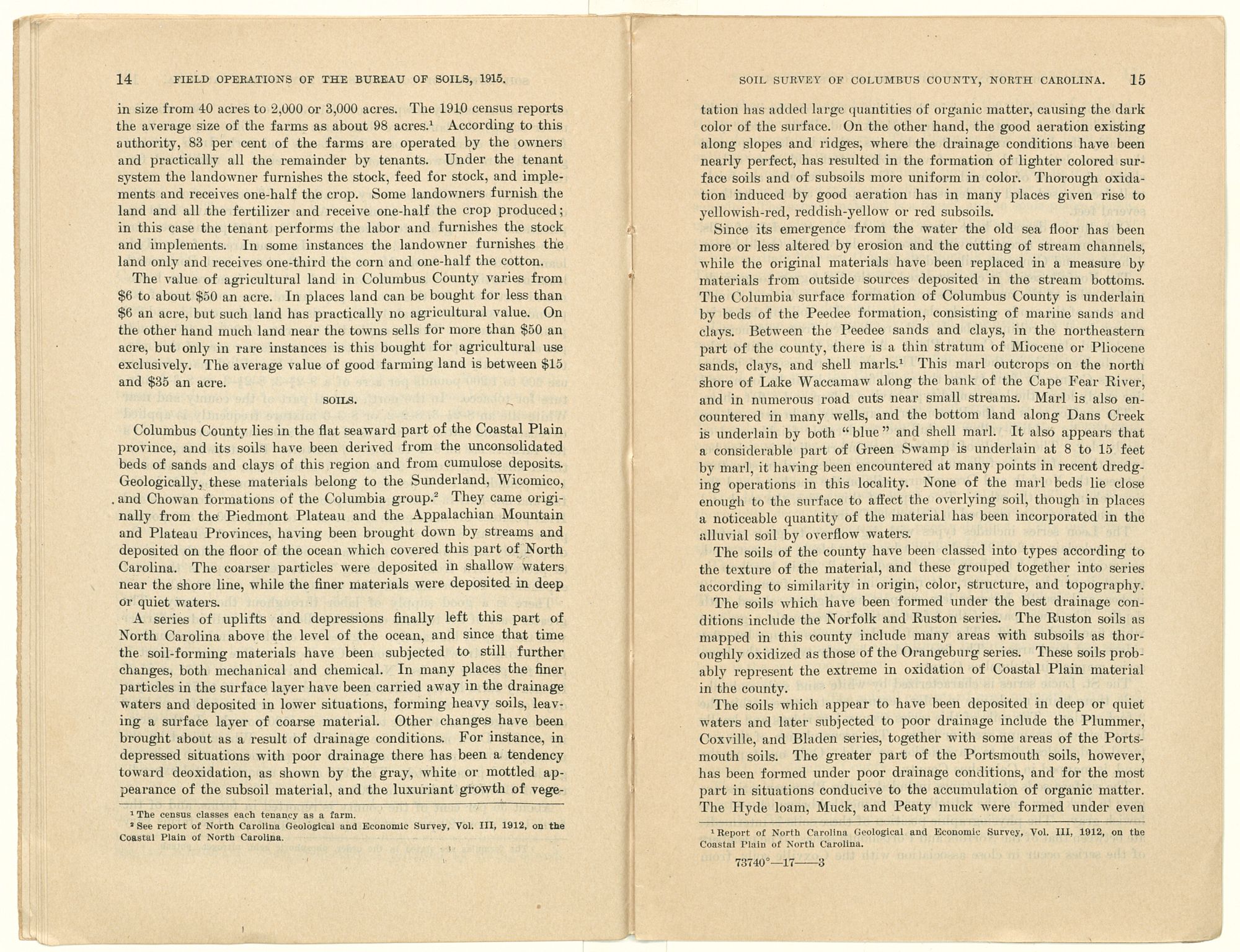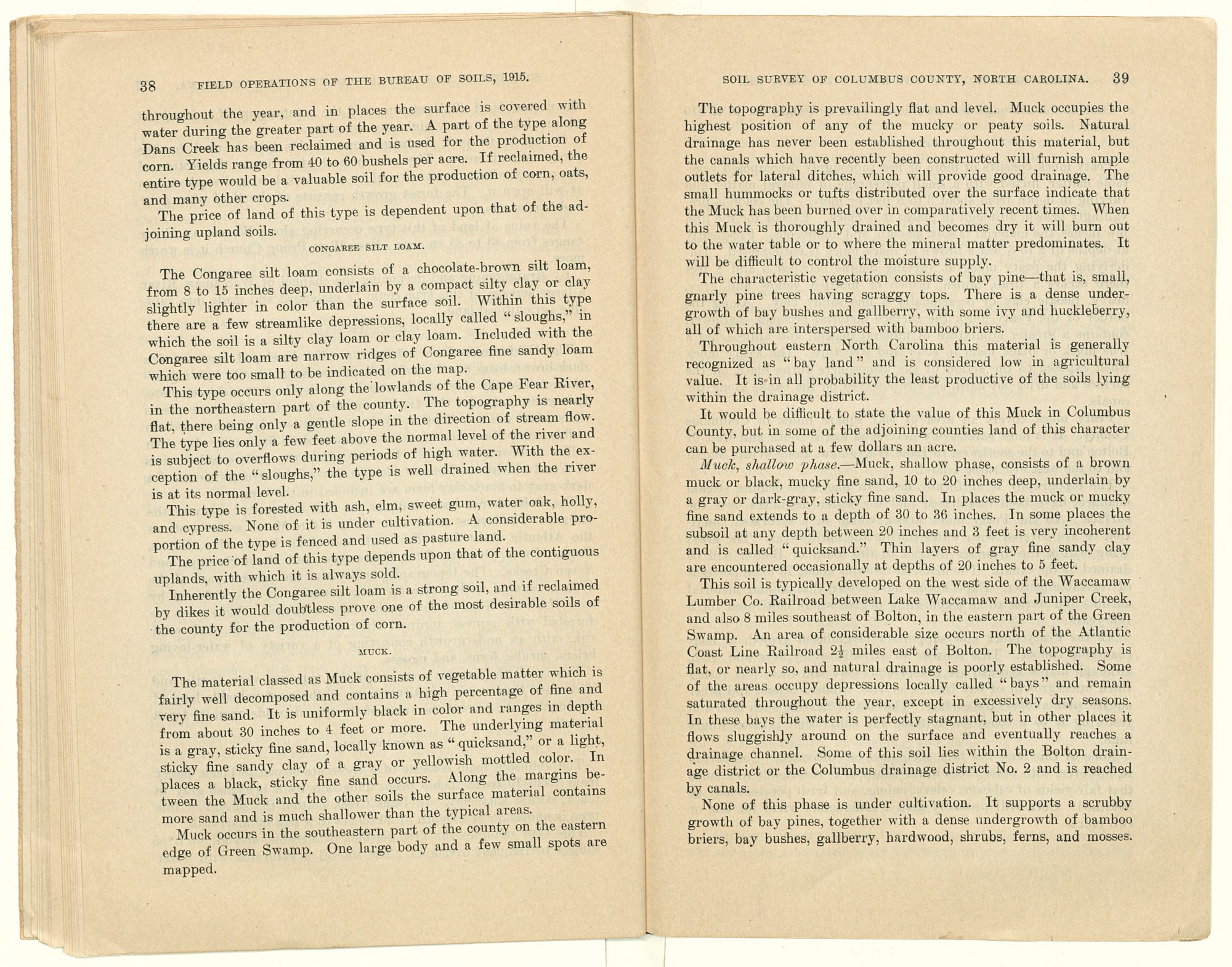 U. S. DEPARTMENT OF AGRICULTURE, BUREAU OF SOILS—MILTON WHITNEY, Chief. IN COOPERATION WITH THE NORTH CAROLINA DEPARTMENT OF AGRICULTURE W. A. GRAHAM, COMMISSIONER; B. W. KILGORE, STATE CHEMIST AND DIRECTOR AGRICULTURAL EXPERIMENT STATION; C. B. WILLIAMS, AGRONOMIST.SOIL SURVEY OF COLUMBUS COUNTY, NORTH CAROLINA.BY R. B. HARDISON, IN CHARGE, AND R. T. AVON BURKE, OF THE U. S. DEPARTMENT OF AGRICULTURE, AND L. L. BRINKLEY AND R. C. JURNEY, OF THE NORTH CAROLINA DEPARTMENT OF AGRICULTURE.W. EDWARD HEARN, INSPECTOR, SOUTHERN DIVISION. [Advance Sheets—Field Operations of the Bureau of Soils, 1915.]United States Department of Agriculture 1862 Agriculture is the Foundation of Manufacture and Commerce 1889