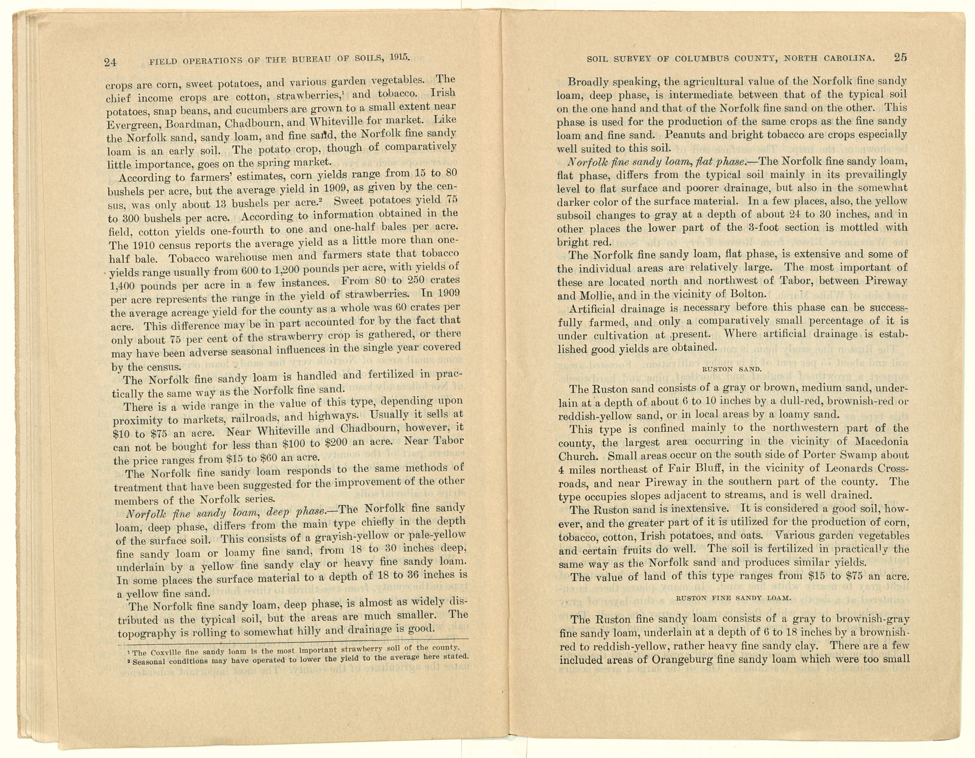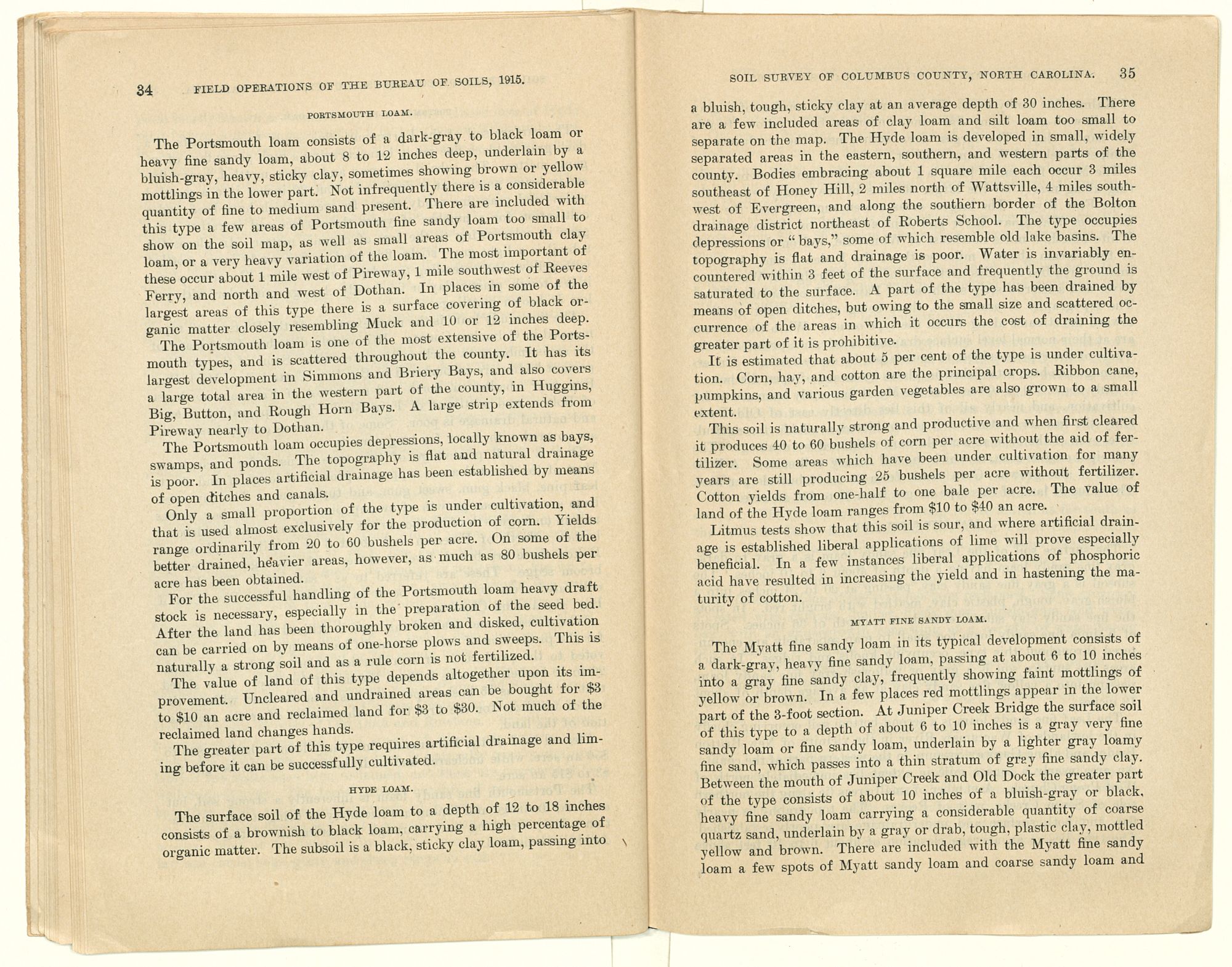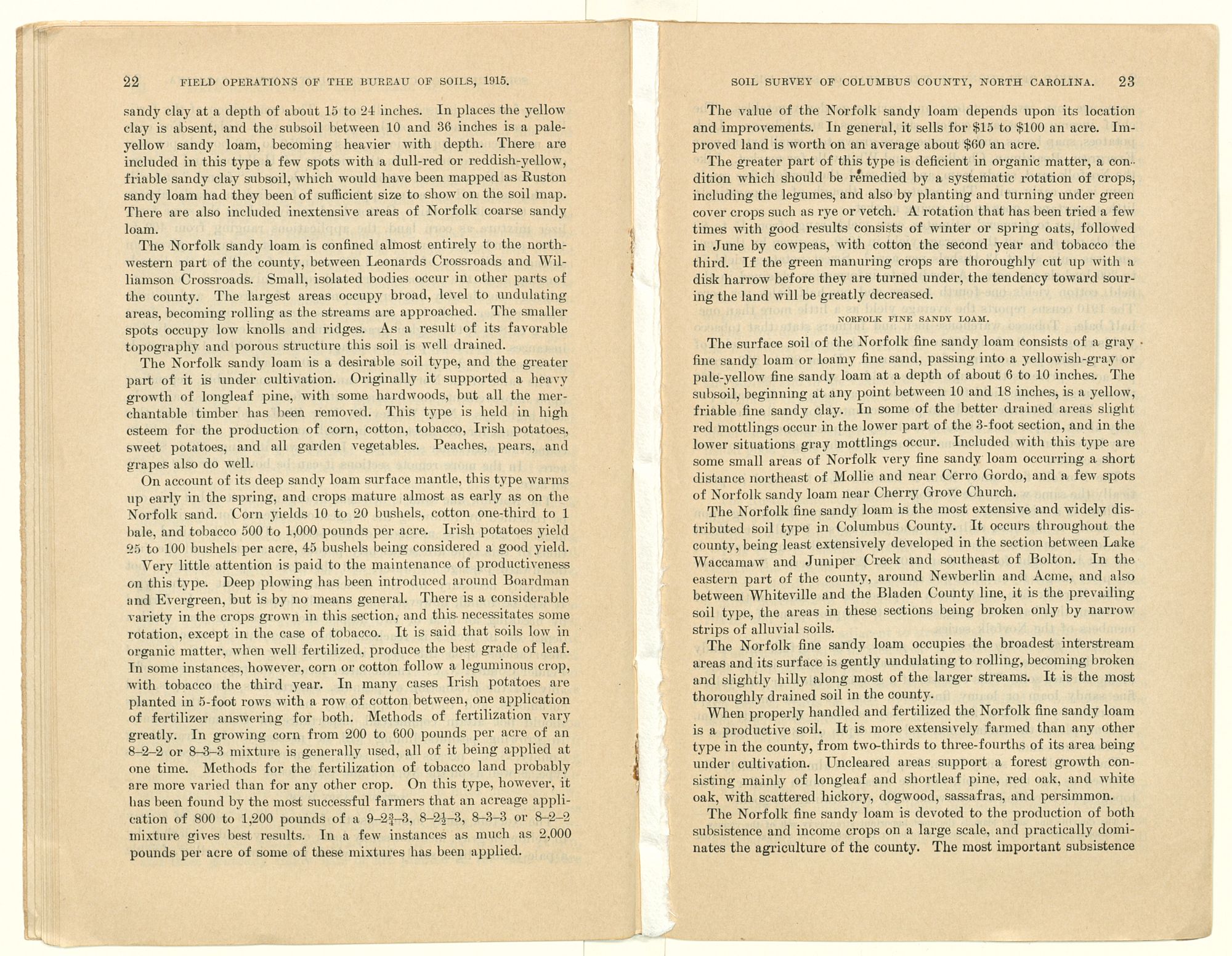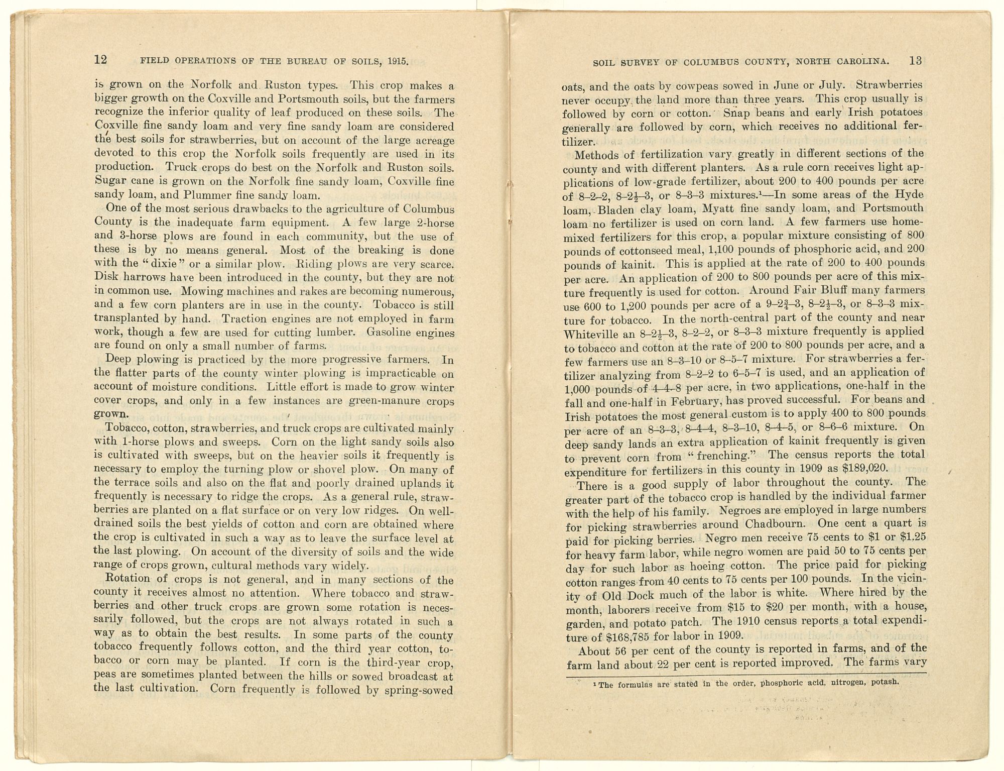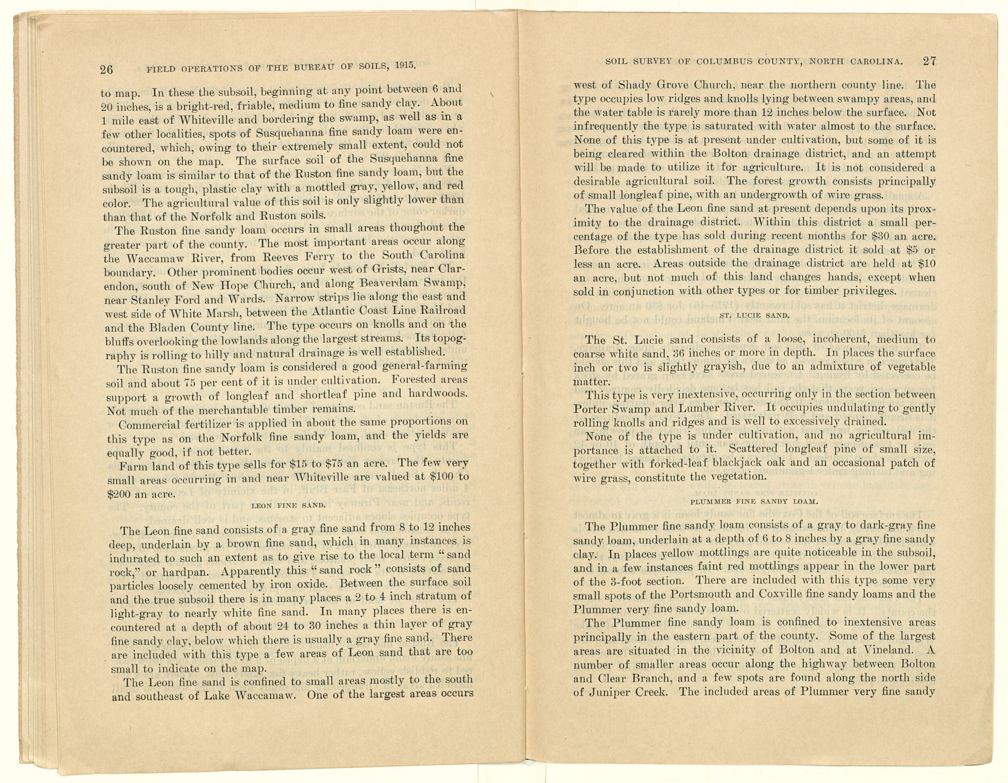 U. S. DEPARTMENT OF AGRICULTURE, BUREAU OF SOILS—MILTON WHITNEY, Chief. IN COOPERATION WITH THE NORTH CAROLINA DEPARTMENT OF AGRICULTURE W. A. GRAHAM, COMMISSIONER; B. W. KILGORE, STATE CHEMIST AND DIRECTOR AGRICULTURAL EXPERIMENT STATION; C. B. WILLIAMS, AGRONOMIST.SOIL SURVEY OF COLUMBUS COUNTY, NORTH CAROLINA.BY R. B. HARDISON, IN CHARGE, AND R. T. AVON BURKE, OF THE U. S. DEPARTMENT OF AGRICULTURE, AND L. L. BRINKLEY AND R. C. JURNEY, OF THE NORTH CAROLINA DEPARTMENT OF AGRICULTURE.W. EDWARD HEARN, INSPECTOR, SOUTHERN DIVISION. [Advance Sheets—Field Operations of the Bureau of Soils, 1915.]United States Department of Agriculture 1862 Agriculture is the Foundation of Manufacture and Commerce 1889