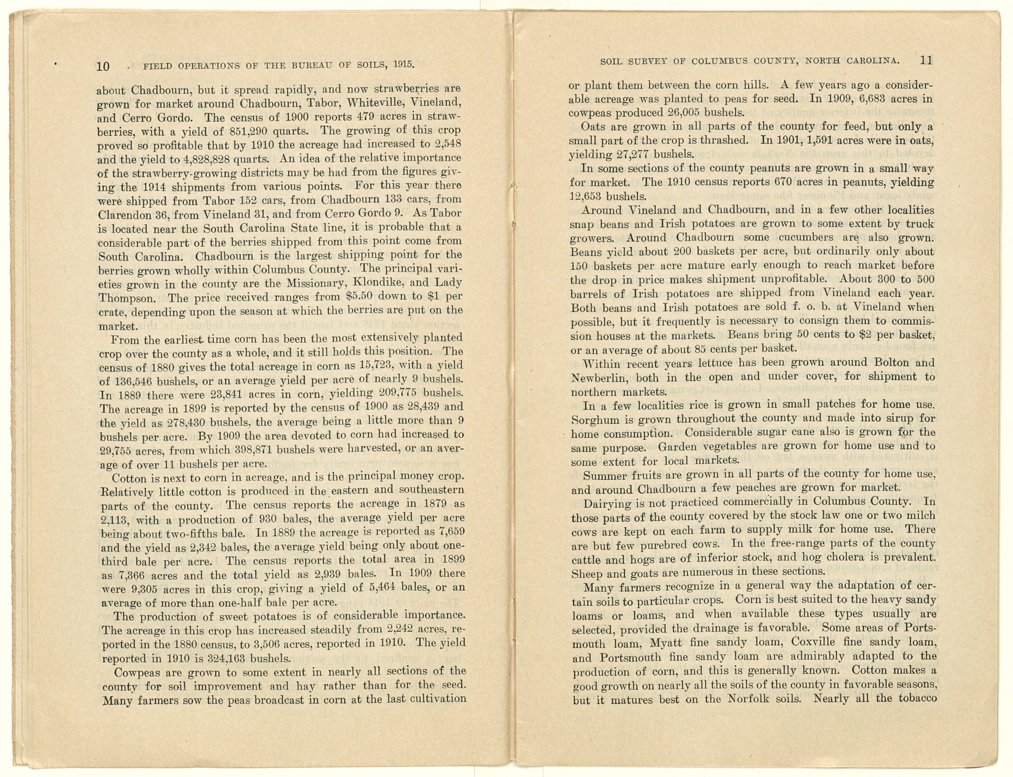 Corn is the first and cotton the second crop in point of acreage. Strawberries are grown on an extensive scale in the vicinity of Chadbourn, Tabor, and Whiteville. Around Fair Bluff, Tabor, and Whiteville tobacco is an important money crop. Truck crops of secondary importance are Irish potatoes, snap beans, cucumbers, and lettuce.