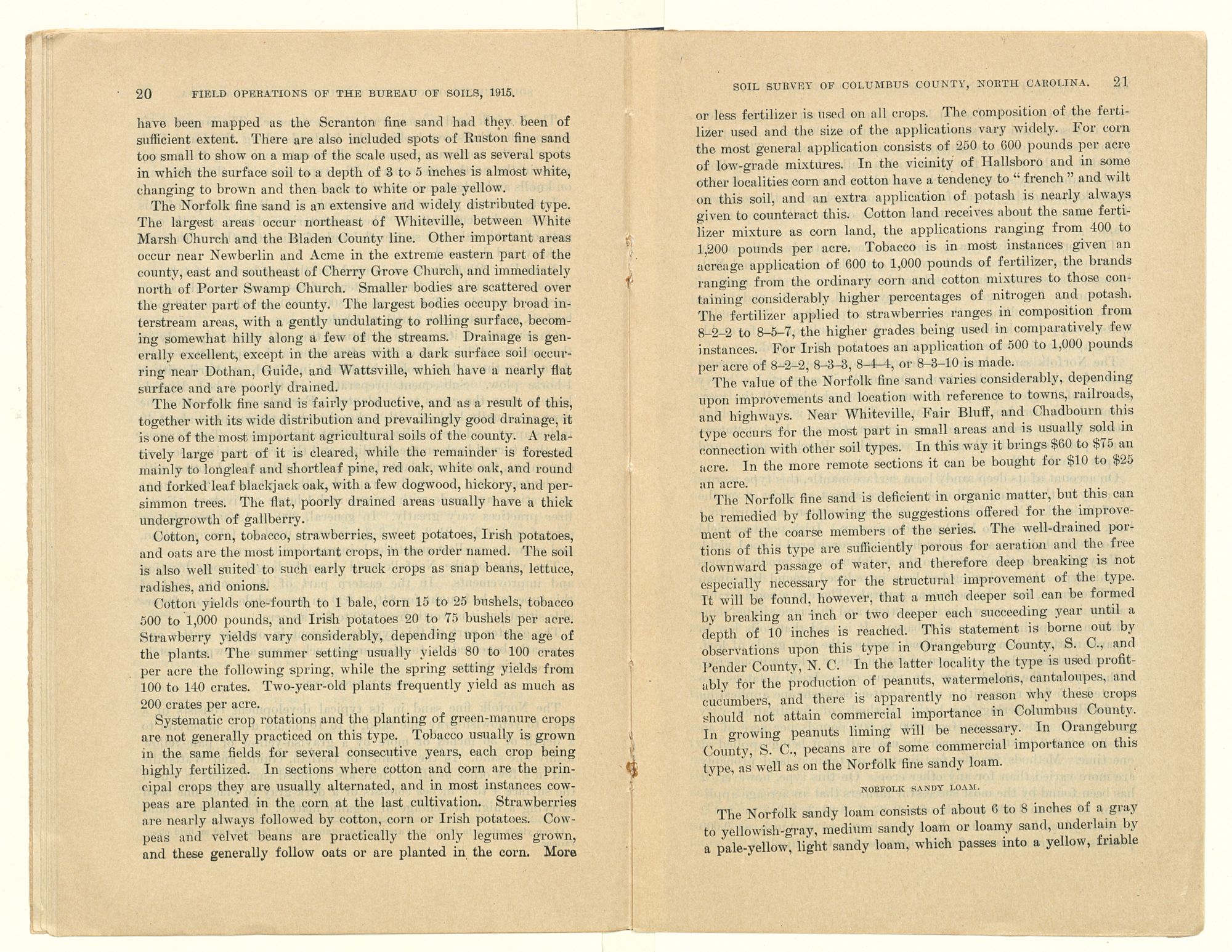 The soils of Columbus County are varied in their origin, texture, and structure. Most of them are derived from marine sediments and consist principally of fine sands, silts, and clays. There are, however, extensive areas of cumulose soils or deposits of more or less thoroughly decomposed vegetable matter. In texture the soils range from coarse and medium sands to clay loams and in structure from loose, incoherent material to tough, plastic clay. A wide difference exists in drainage conditions. Some of the soils are well drained; others are permanently wet. The prevailing soils in the northwestern and extreme eastern parts of the county are light fine sandy loams, with yellow fine sandy clay subsoils. Such soils are very well suited to the production of cotton, bright tobacco, peanuts, and early truck crops. The heavier and darker colored soils in the southern part of the county are best adapted to the production of corn, strawberries, cabbage, and onions.