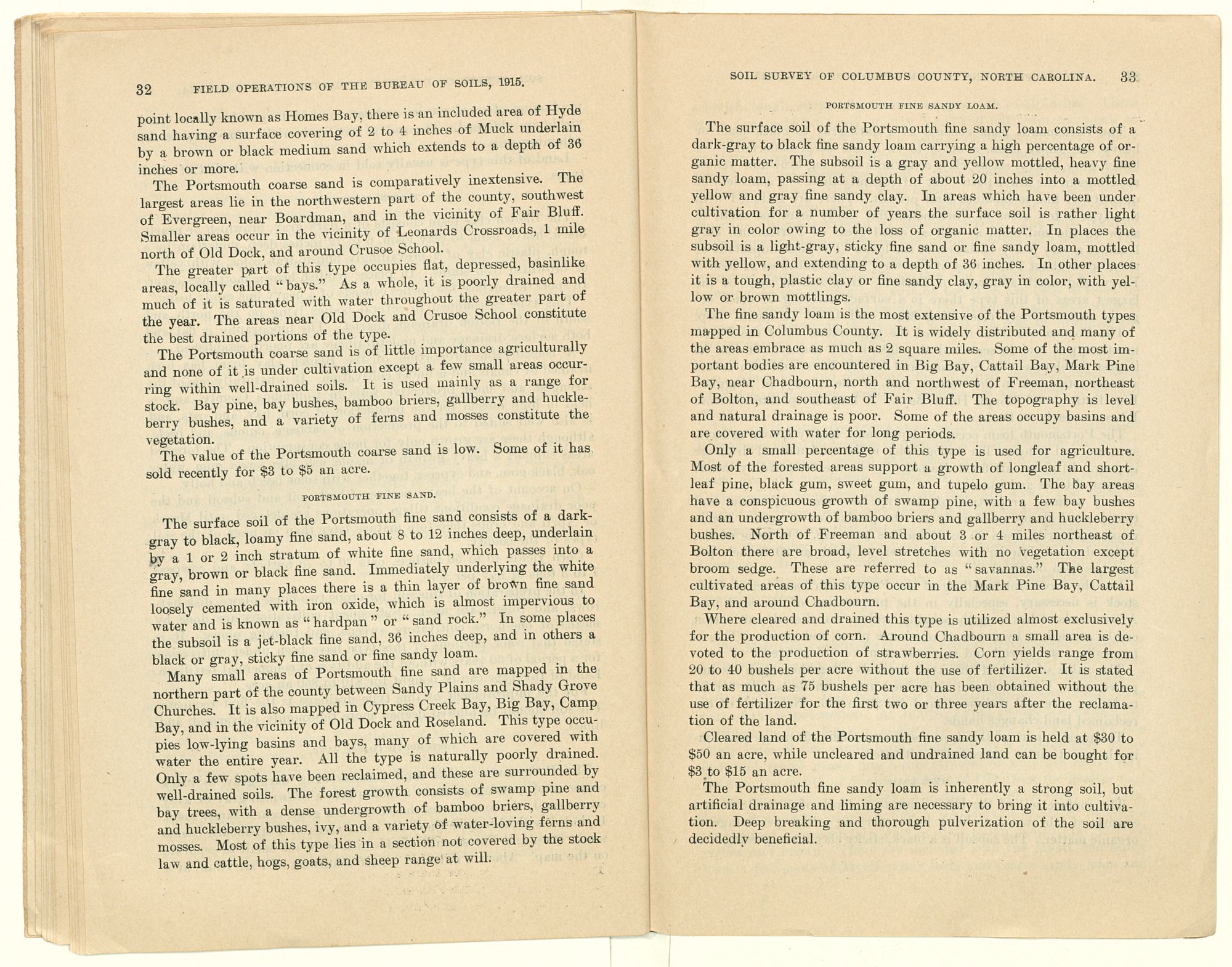 Cleared land of the Portsmouth fine sandy loam is held at $30 to $50 an acre, while uncleared and undrained land can be bought for $3 to $15 an acre.