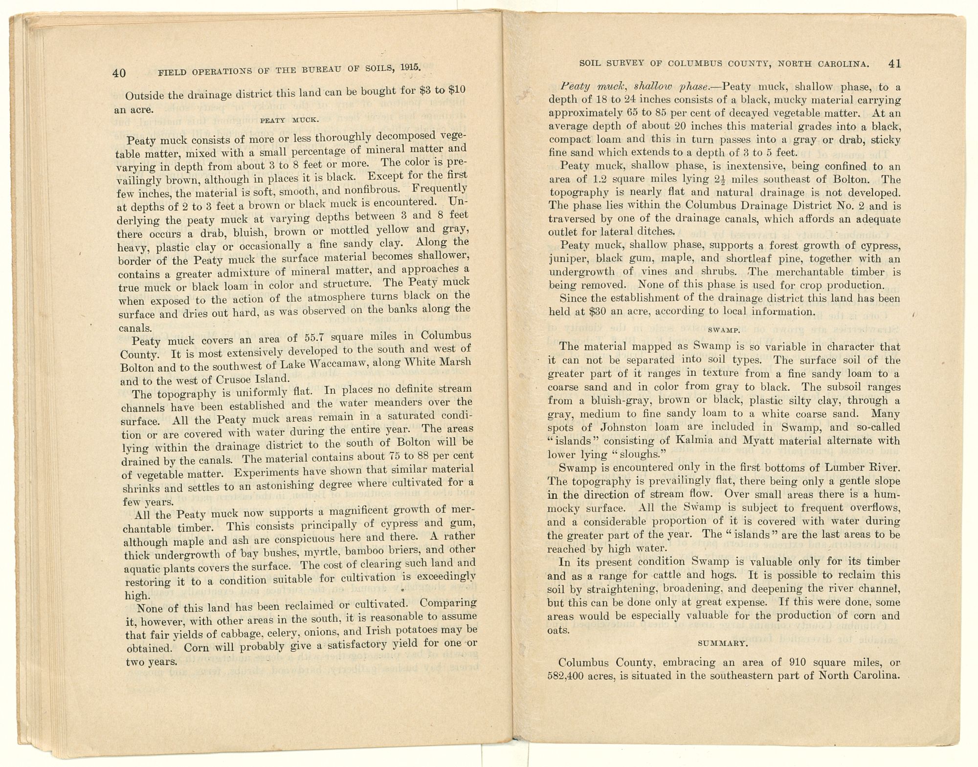 Peaty muck covers an area of 55.7 square miles in Columbus County. It is most extensively developed to the south and west of Bolton and to the southwest of Lake Waccamaw, along White Marsh and to the west of Crusoe Island.