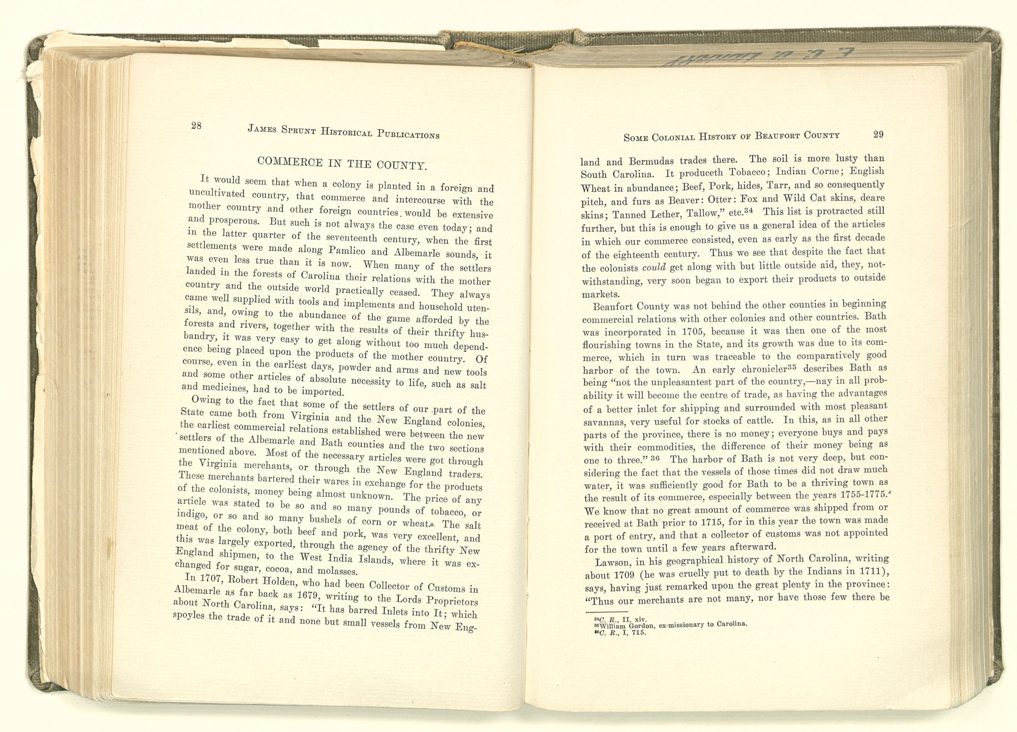 Beaufort County was not behind the other counties in beginning commercial relations with other colonies and other countries. Bath was incorporated in 1705, because it was then one of the most flourishing towns in the State, and its growth was due to its commerce, which in turn was traceable to the comparatively good harbor of the town. An early chronicler35 describes Bath as being “not the unpleasantest part of the country,—nay in all probability it will become the centre of trade, as having the advantages of a better inlet for shipping and surrounded with most pleasant savannas, very useful for stocks of cattle. In this, as in all other parts of the province, there is no money; everyone buys and pays with their commodities, the difference of their money being as one to three.”36 The harbor of Bath is not very deep, but considering the fact that the vessels of those times did not draw much water, it was sufficiently good for Bath to be a thriving town as the result of its commerce, especially between the years 1755-1775. We know that no great amount of commerce was shipped from or received at Bath prior to 1715, for in this year the town was made a port of entry, and that a collector of customs was not appointed for the town until a few years afterward.