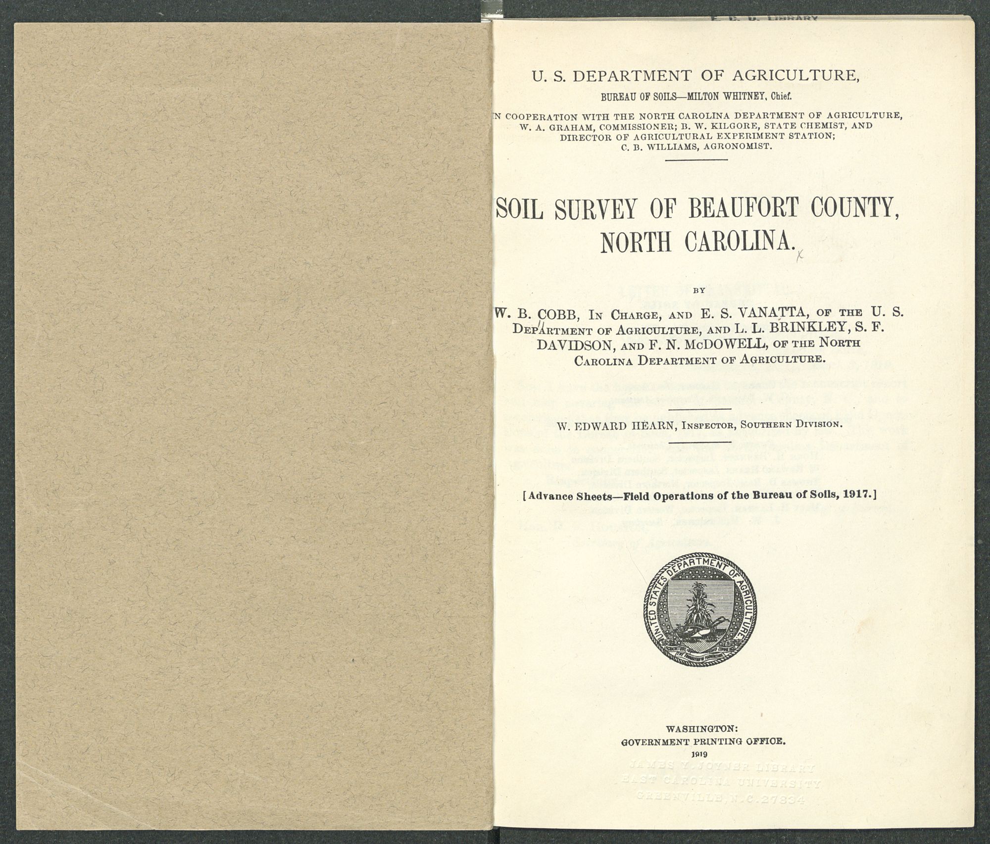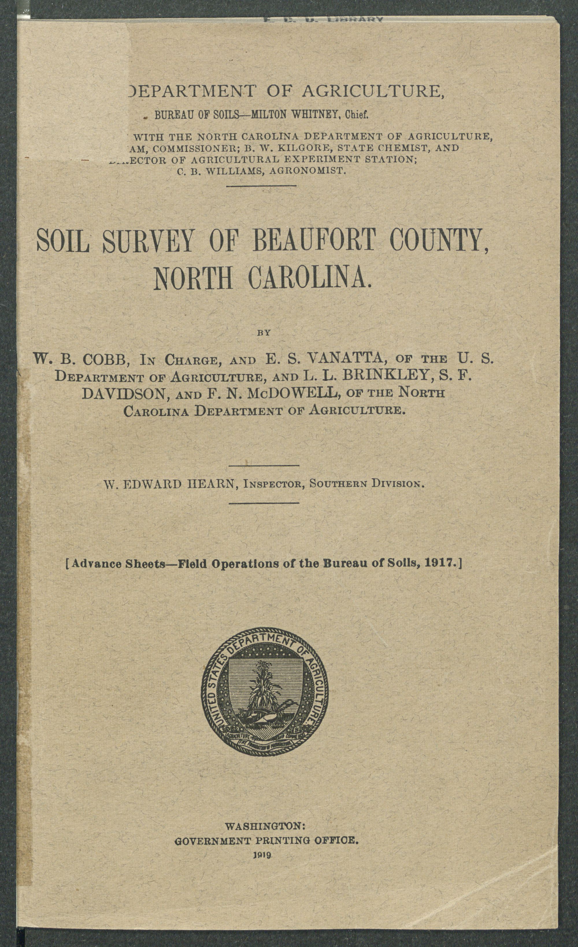 U.S. DEPARTMENT OF AGRICULTURE,BUREAU OF SOILS—MILTON WHITNEY, Chief. IN COOPERATION WITH THE NORTH CAROLINA DEPARTMENT OF AGRICULTURE, W. A. GRAHAM, COMMISSIONER; B. W. KILGORE, STATE CHEMIST, AND DIRECTOR OF AGRICULTURAL EXPERIMENT STATION; C. B. WILLIAMS, AGRONOMIST.SOIL SURVEY OF BEAUFORT COUNTY,NORTH CAROLINA.BYW. B. COBB, In Charge, andE. S. VANATTA, of the U. S.Department of Agriculture, andL. L. BRINKLEY, S. F. DAVIDSON, andF. N. McDOWELL, of the North Carolina Department of Agriculture. W. EDWARD HEARN, Inspector, Southern Division. [Advance Sheets—Field Operations of the Bureau of Soils, 1917.] United States Department of Agriculture 1862 Agriculture is the Foundation of Manufacture and Commerce 1889
