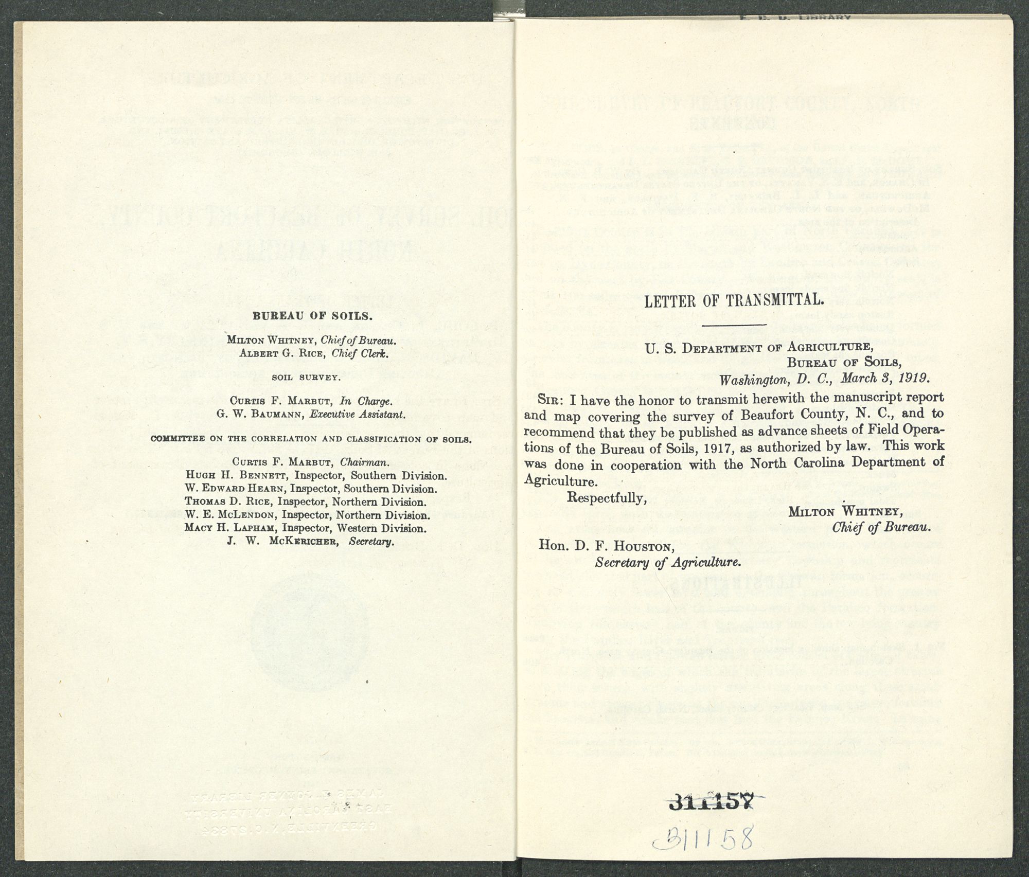 Sir: I have the honor to transmit herewith the manuscript report and map covering the survey of Beaufort County, N. C., and to recommend that they be published as advance sheets of Field Operations of the Bureau of Soils, 1917, as authorized by law. This work was done in cooperation with the North Carolina Department of Agriculture.