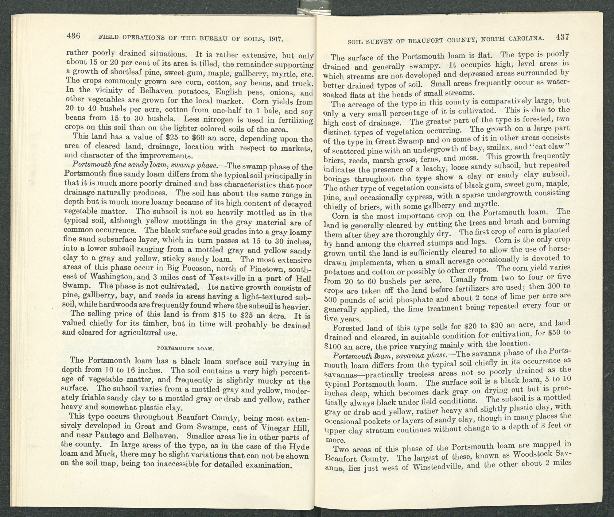 rather poorly drained situations. It is rather extensive, but only about 15 or 20 per cent of its area is tilled, the remainder supporting a growth of shortleaf pine, sweet gum, maple, gallberry, myrtle, etc. The crops commonly grown are corn, cotton, soy beans, and truck. In the vicinity of Belhaven potatoes, English peas, onions, and other vegetables are grown for the local market. Corn yields from 20 to 40 bushels per acre, cotton from one-half to 1 bale, and soy beans from 15 to 30 bushels. Less nitrogen is used in fertilizing crops on this soil than on the lighter colored soils of the area.
