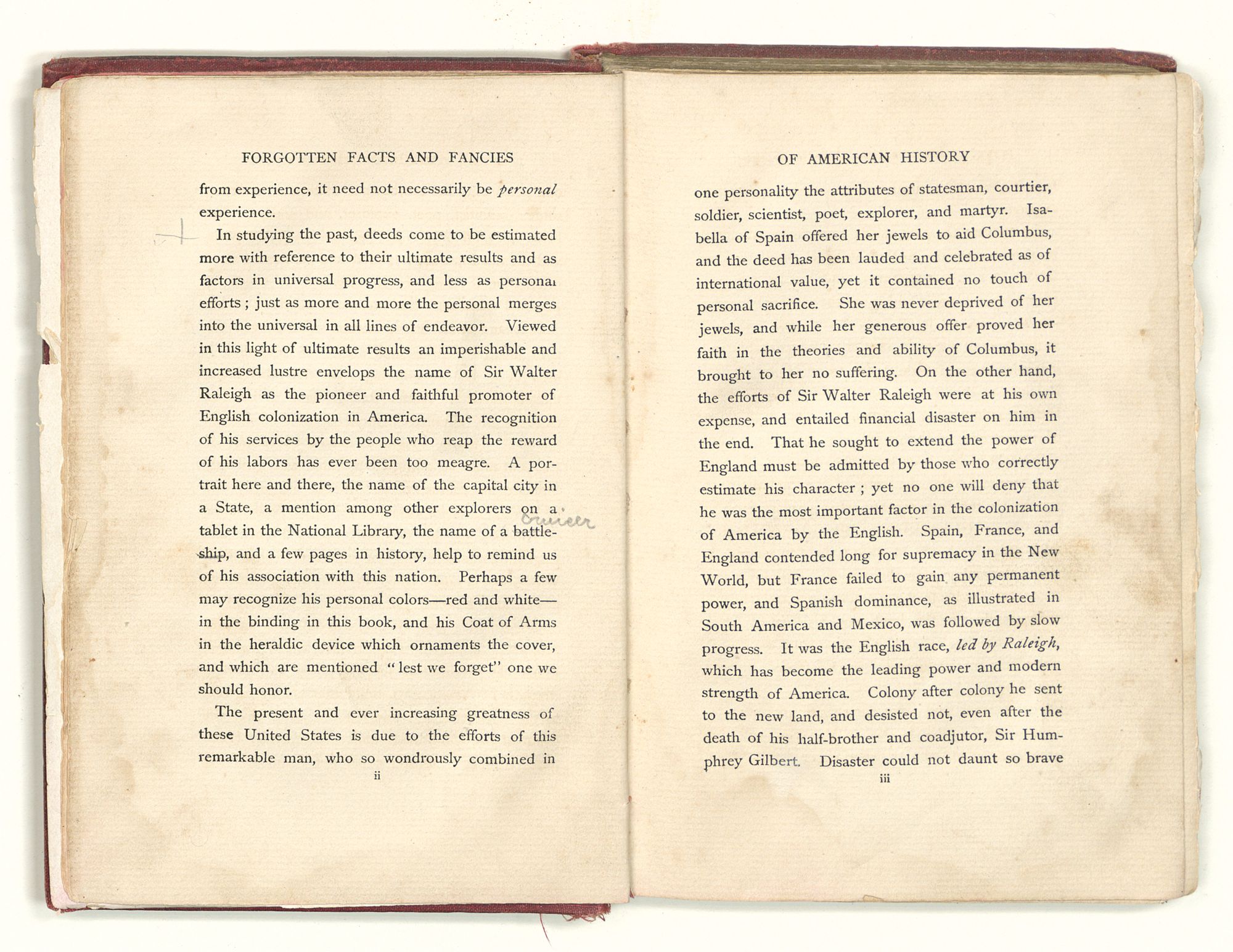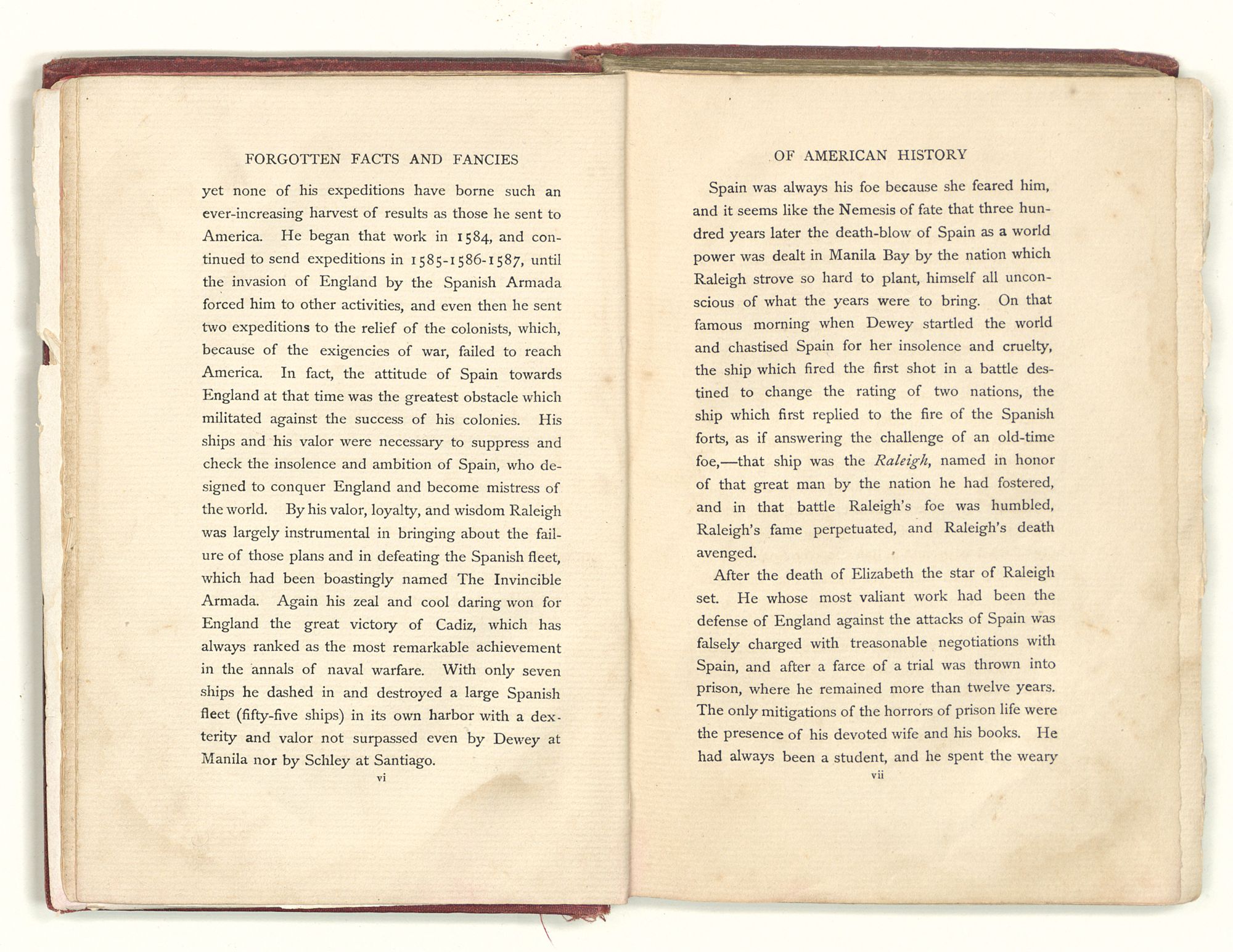 In studying the past, deeds come to be estimated more with reference to their ultimate results and as factors in universal progress, and less as personal efforts; just as more and more the personal merges into the universal in all lines of endeavor. Viewed in this light of ultimate results an imperishable and increased lustre envelops the name of Sir Walter Raleigh as the pioneer and faithful promoter of English colonization in America. The recognition of his services by the people who reap the reward of his labors has ever been too meagre. A portrait here and there, the name of the capital city in a State, a mention among other explorers on a tablet in the National Library, the name of a battleship, and a few pages in history, help to remind us of his association with this nation. Perhaps a few may recognize his personal colors—red and white—in the binding in this book, and his Coat of Arms in the heraldic device which ornaments the cover, and which are mentioned “lest we forget” one we should honor.