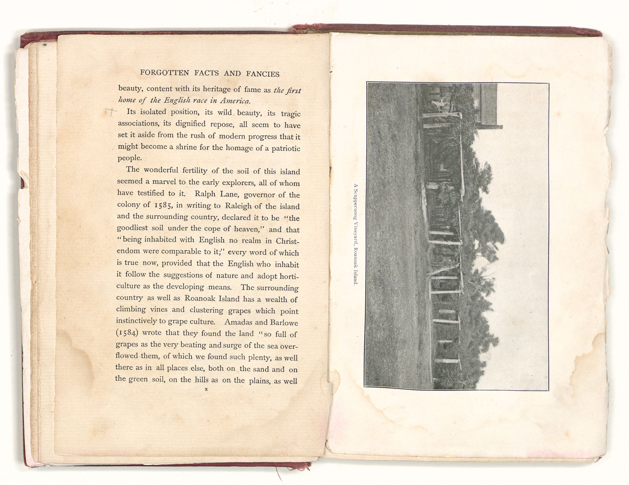 The first Scuppernong vine known to history was found on the mainland of the North Carolina coast by Amadas and Barlowe on their first voyage (1584). Tradition relates thay they transplanted this vine to Roanoak Island. On this island there still flourishes an old vine, which despite its gnarled body and evident age continues to bear fruit. It is claimed that it is the same vine Amadas and Barlowe planted. Some insist that it was planted by Sir Walter Raleigh himself, but as that famous knight did not realize his wish to visit his new possessions in North America, the honor of having planted the vine must revert to Amadas and Barlowe. It seems to be endowed with perennial youth, and the harvest from its branches is an annual certainty.