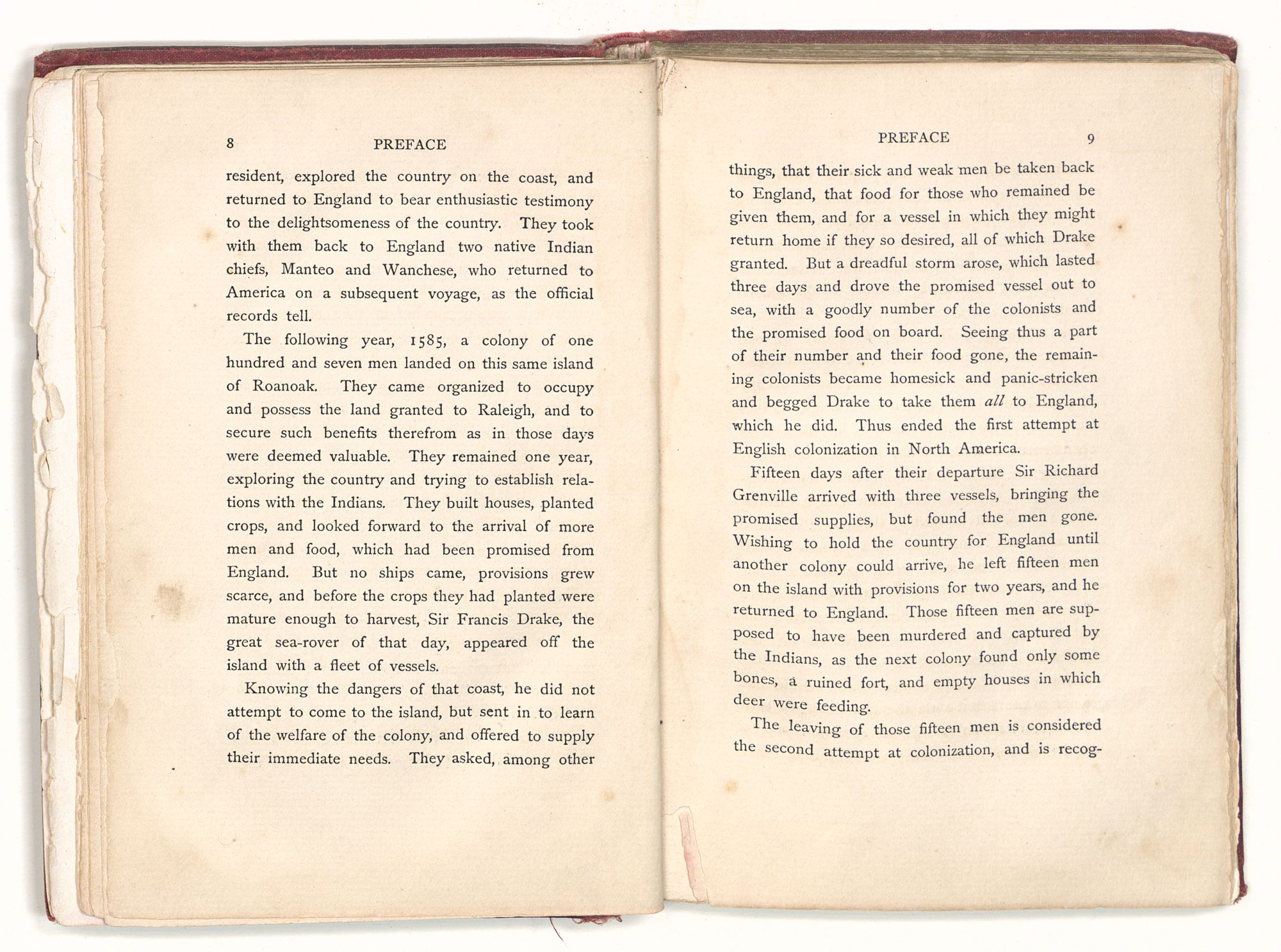 and higher life for the human race. All this grand destiny, all this ripening opportunity, like a harvest from a few seeds, is traced back, event after event, to the early struggles of those who braved the dangers of sea and forest in the attempts to colonize America. Those pioneer efforts, so generously promoted by Sir Walter Raleigh, though only partially successful, were the stepping-stones which later led to the better-known settlement of Jamestown, in Virginia. A brief résumé of those stepping-stones will make them familiar to all.
