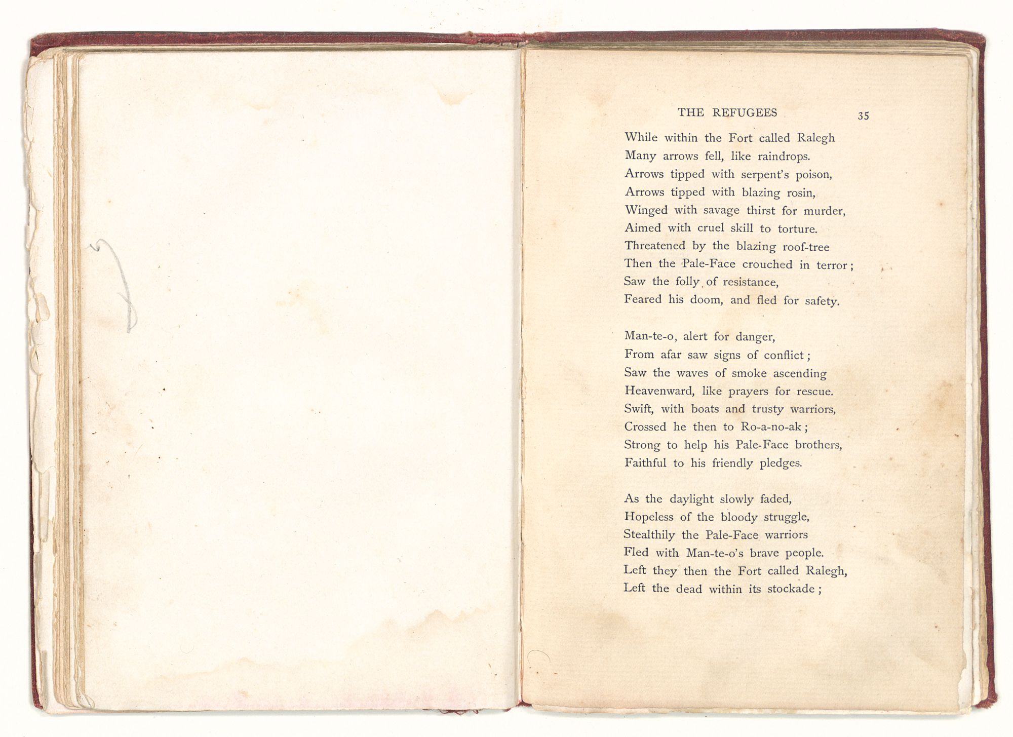 While within the Fort called RaleghMany arrows fell, like raindrops.Arrows tipped with serpent's poison,Arrows tipped with blazing rosin,Winged with savage thirst for murder,Aimed with cruel skill to torture.Threatened by the blazing roof-treeThen the Pale-Face crouched in terror;Saw the folly of resistance,Feared his doom, and fled for safety.Man-te-o, alert for danger,From afar saw signs of conflict;Saw the waves of smoke ascendingHeavenward, like prayers for rescue.Swift, with boats and trusty warriors,Crossed he then to Ro-a-no-ak;Strong to help his Pale-Face brothers,Faithful to his friendly pledges.As the daylight slowly faded,Hopeless of the bloody struggle,Stealthily the Pale-Face warriorsFled with Man-te-o's brave people.Left they then the Fort called Ralegh,Left the dead within its stockade;Sought another island refuge,Hoping there to rest in safety.Man-te-o sought for the mother,*She with babe there born and nurtured’Neath the shadow of disaster,In the Land-of-Wind-and-Water.“Come,” said he, “the darkness falleth,All your people must flee henceward;Wan-ches-e will show no mercy,You must not become his captive.Take the papoose from thy bosom,Call the white chief whom thou lovest,Haste with me upon the flood-tideTo my wigwam on Wo-ko-kon.”Noiseless, she amid the conflictSought her heart's mate to flee with her;Useless all the strife and courage,Useless all the rude home-making;Shrine for worship, fort for safety,Hope of future peace and plenty,All were vain; yet life we cherish,Far above all boons we hold it:So she hastened on her missionFor the life of self and loved ones.* Eleanor Dare.