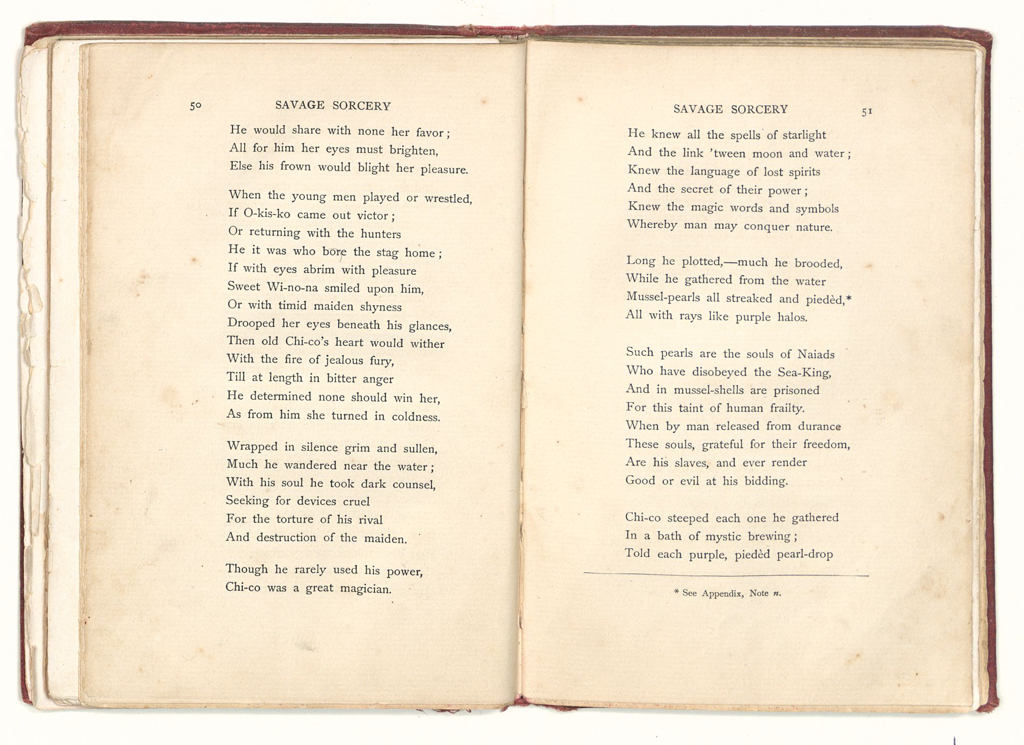 He knew all the spells of starlightAnd the link ’tween moon and water;Knew the language of lost spiritsAnd the secret of their power;Knew the magic words and symbolsWhereby man may conquer nature.Long he plotted,—much he brooded,While he gathered from the waterMussel-pearls all streaked and piedèd,*All with rays like purple halos.Such pearls are the souls of NaiadsWho have disobeyed the Sea-King,And in mussel-shells are prisonedFor this taint of human frailty.When by man released from duranceThese souls, grateful for their freedom,Are his slaves, and ever renderGood or evil at his bidding.Chi-co steeped each one he gatheredIn a bath of mystic brewing;Told each purple, piedèd pearl-drop* See Appendix, Note n.What the evil was he plotted.Never once his purpose wavered,Never once his fury lessened;Nursing vengeance as a guerdonWhile the mussel-pearls he polished.Then a new canoe he fashioned,Safe, and strong, and deep he made it;*And then sought to work his magicOn the innocent Wi-no-na;Asked the maiden to go with himIn his boat across the water.“Come,” said he, “to Ro-a-no-ak,Where the waves are white with blossoms,Where the grapes hang ripe in clusters,Come with me and drink their juices.”And the innocent Wi-no-naListened to his artful pleading;Went with him in search of pleasure,Glad to show him friendly feeling.While with idle stroke they floatedTo the fragrant lily-blossoms,* See Appendix, Note o.