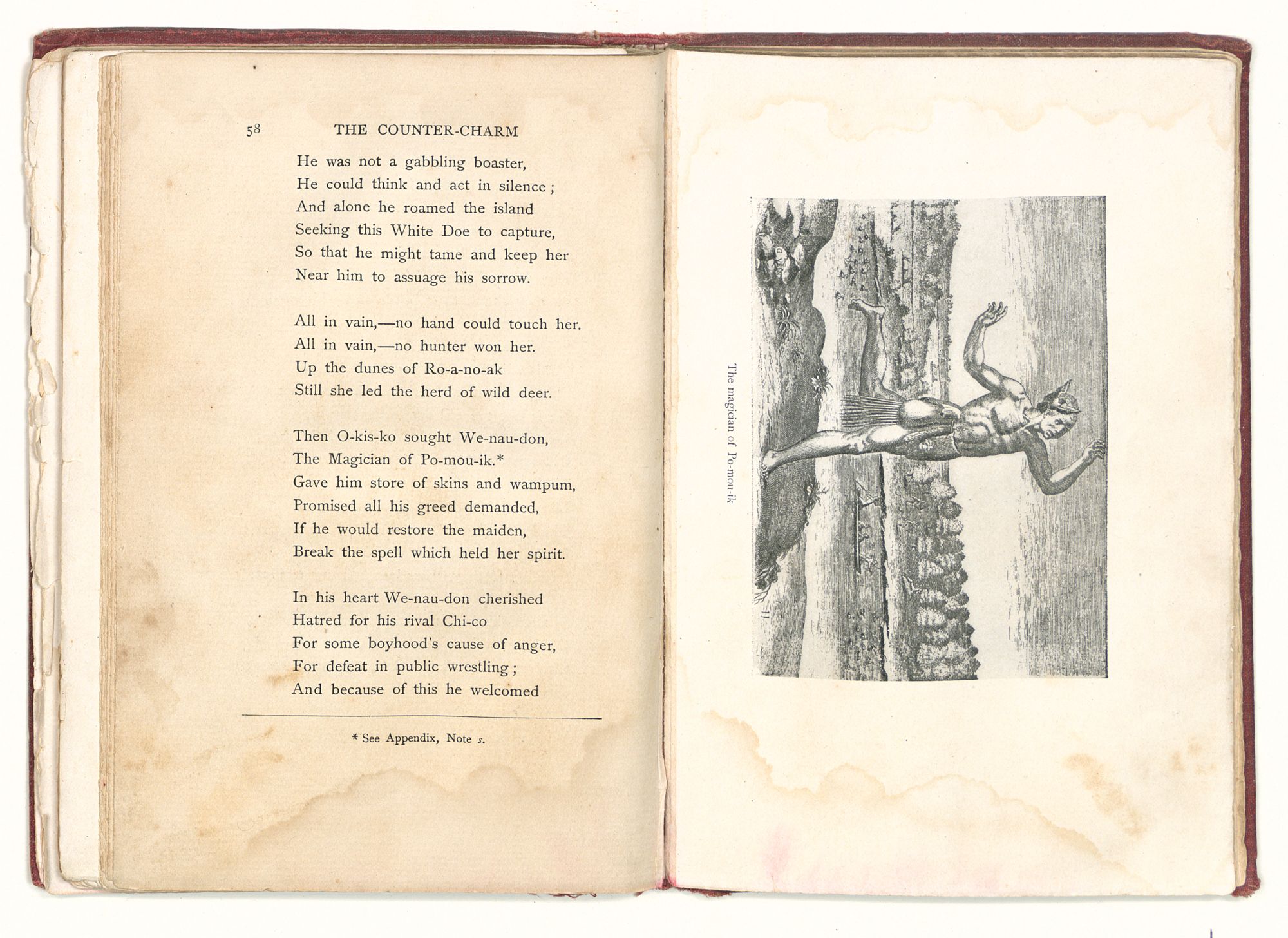 Children they of superstition,With their faith firm in enchantment,Linked the going of the maidenWith the coming of the White Doe.They believed in magic powers,They knew Chi-co's hopeless passion,So they shook their heads and whispered,Looked mysterious at each other,“Ho,” they whispered to each other,“Chi-co is a great Magician,Chi-co should go hunt this White Doe;He is not too old for loving;Love keeps step with Youth and Courage;Old age should not make him tremble.Timid is a doe, and gentleLike a maiden,—like Wi-no-na.Oho! Oho!” and they chuckled,Casting dark looks at old Chi-co,“He,” said they, “has ’witched our maiden.”When O-kis-ko heard the whispersOf the garrulous old women,Glad belief he gave unto themThat the Doe on Ro-a-no-akWas in truth the Pale-Face MaidenWrung from him by cruel magic.He was not a gabbling boaster,He could think and act in silence;And alone he roamed the islandSeeking this White Doe to capture,So that he might tame and keep herNear him to assuage his sorrow.All in vain,—no hand could touch her.All in vain,—no hunter won her.Up the dunes of Ro-a-no-akStill she led the herd of wild deer.Then O-kis-ko sought We-nau-don,The Magician of Po-mou-ik.*Gave him store of skins and wampum,Promised all his greed demanded,If he would restore the maiden,Break the spell which held her spirit.In his heart We-nau-don cherishedHatred for his rival Chi-coFor some boyhood's cause of anger,For defeat in public wrestling;And because of this he welcomed* See Appendix, Note s.