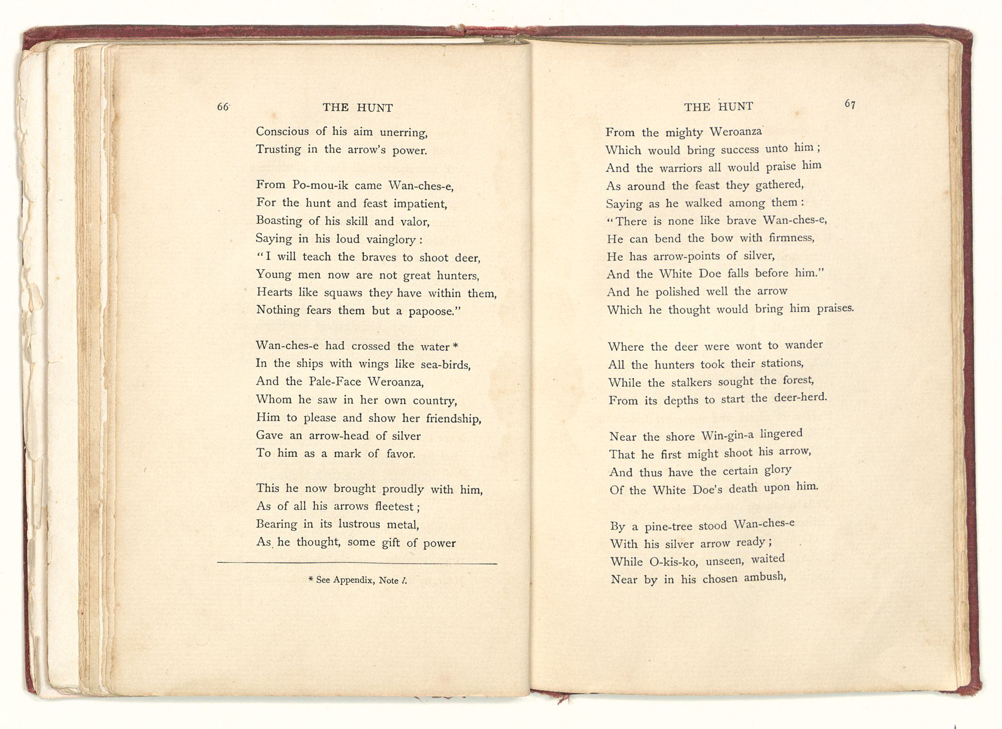 From the mighty WeroanzaWhich would bring success unto him;And the warriors all would praise himAs around the feast they gathered,Saying as he walked among them:“There is none like brave Wan-ches-e,He can bend the bow with firmness,He has arrow-points of silver,And the White Doe falls before him.”And he polished well the arrowWhich he thought would bring him praises.Where the deer were wont to wanderAll the hunters took their stations,While the stalkers sought the forest,From its depths to start the deer-herd.Near the shore Win-gin-a lingeredThat he first might shoot his arrow,And thus have the certain gloryOf the White Doe's death upon him.By a pine-tree stood Wan-ches-eWith his silver arrow ready;While O-kis-ko, unseen, waitedNear by in his chosen ambush,Where he oft had watched the White Doe,Where he knew she always lingered.Soon the stalkers with great shoutingStarted up the frightened red deer;On they came through brake and thicket,In the front the White Doe leading,With fleet foot and head uplifted,Daring all the herd to follow.Easy seemed the task of killing,So Win-gin-a twanged his bow-string,But his arrow fell beside herAs she sprang away from danger.Through the tanglewood, still onward,Head uplifted, her feet scorningAll the wealth of bright-hued foliageWhich lay scattered in her pathway.Up the high sand-dunes she bounded,In her wake the whole herd followed,While the arrows aimed from ambushFell around her ever harmless.On she sped, towards the water,Nostrils spread to sniff the sea-breeze;