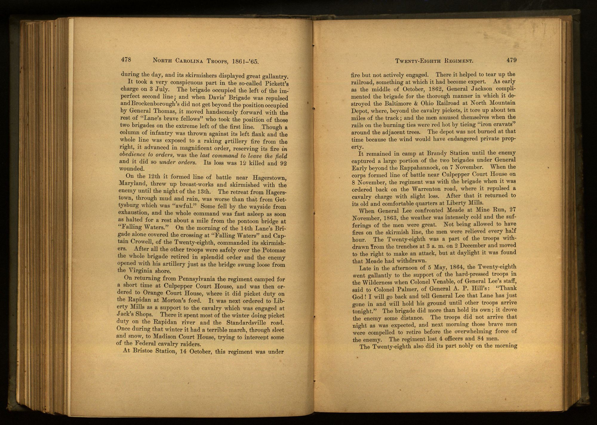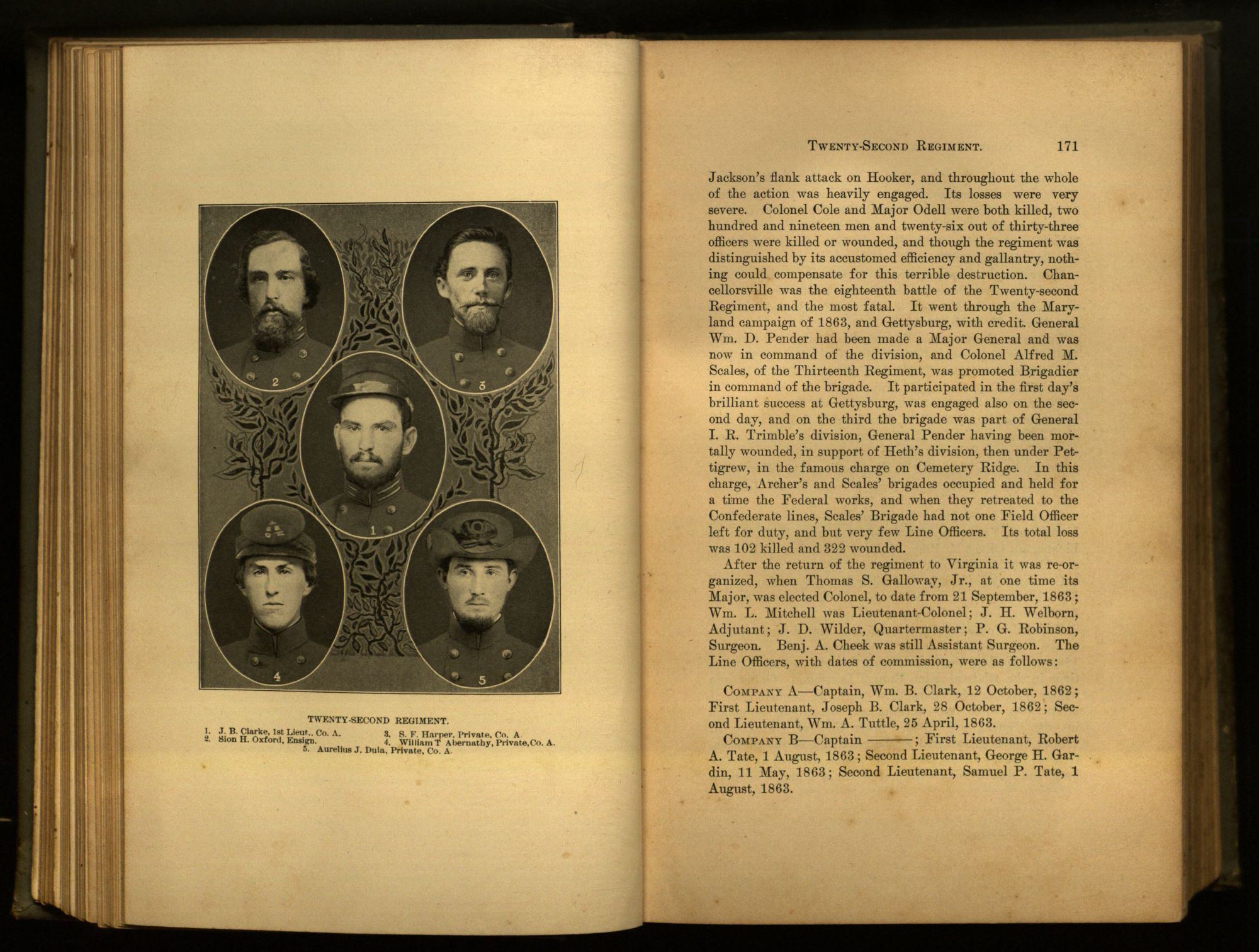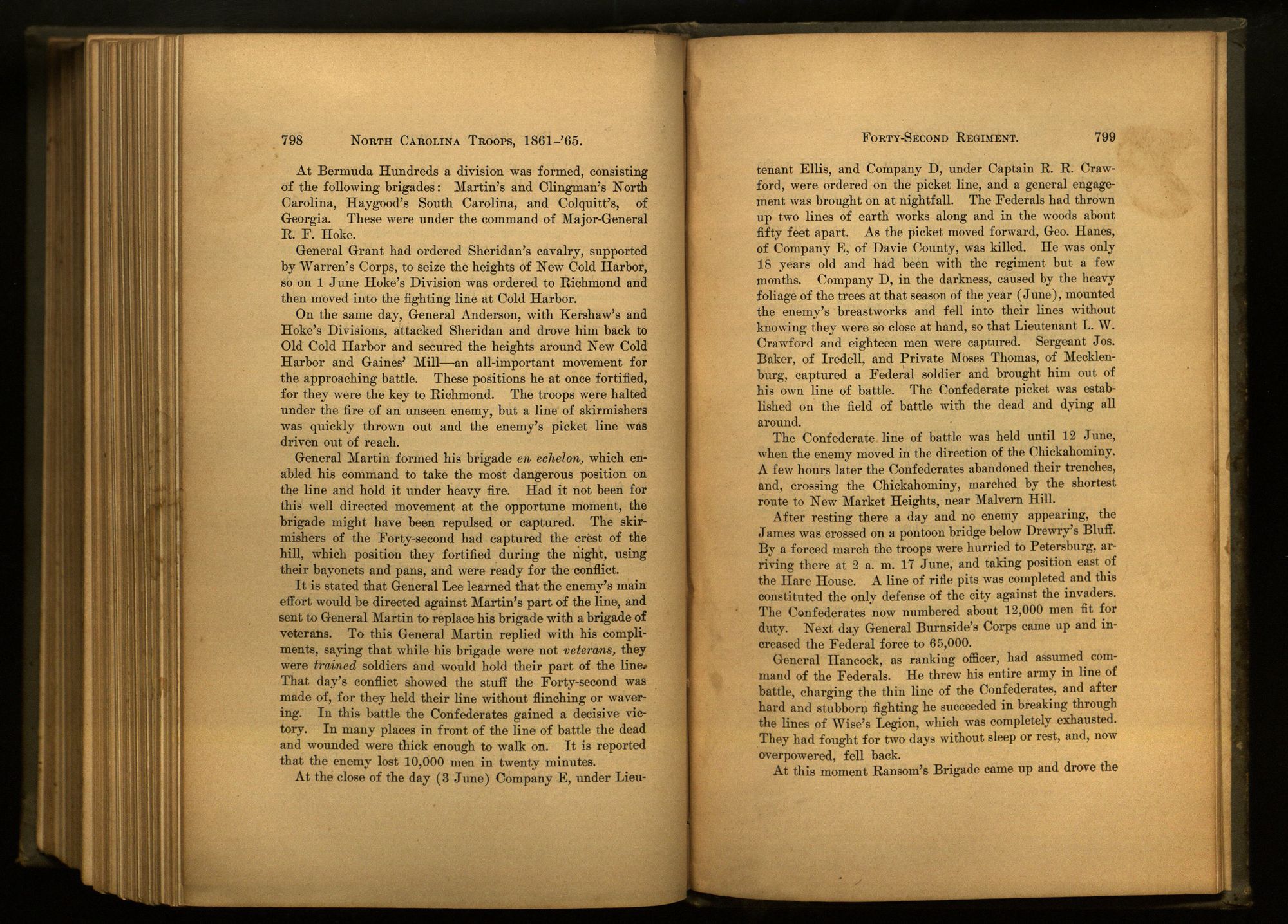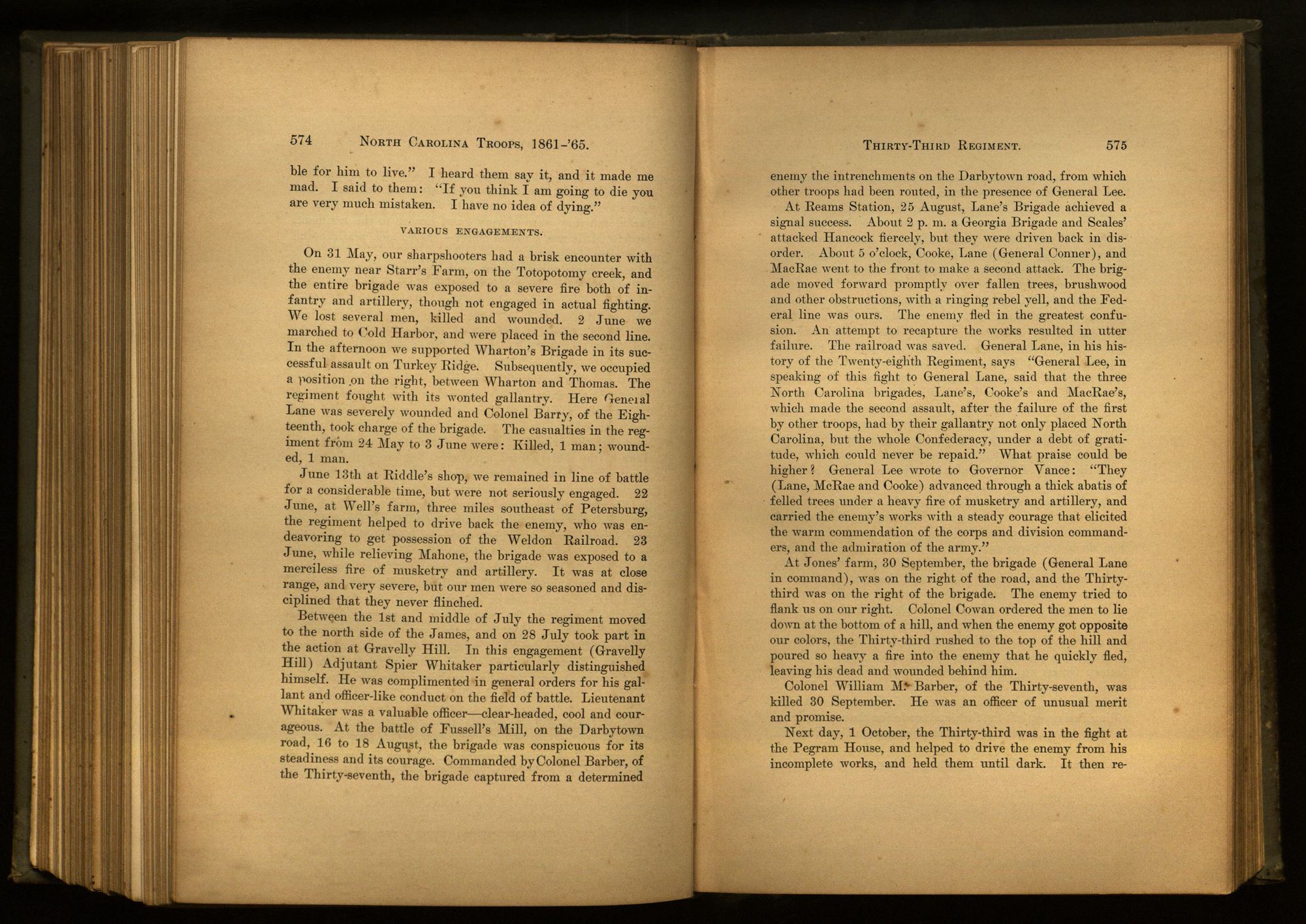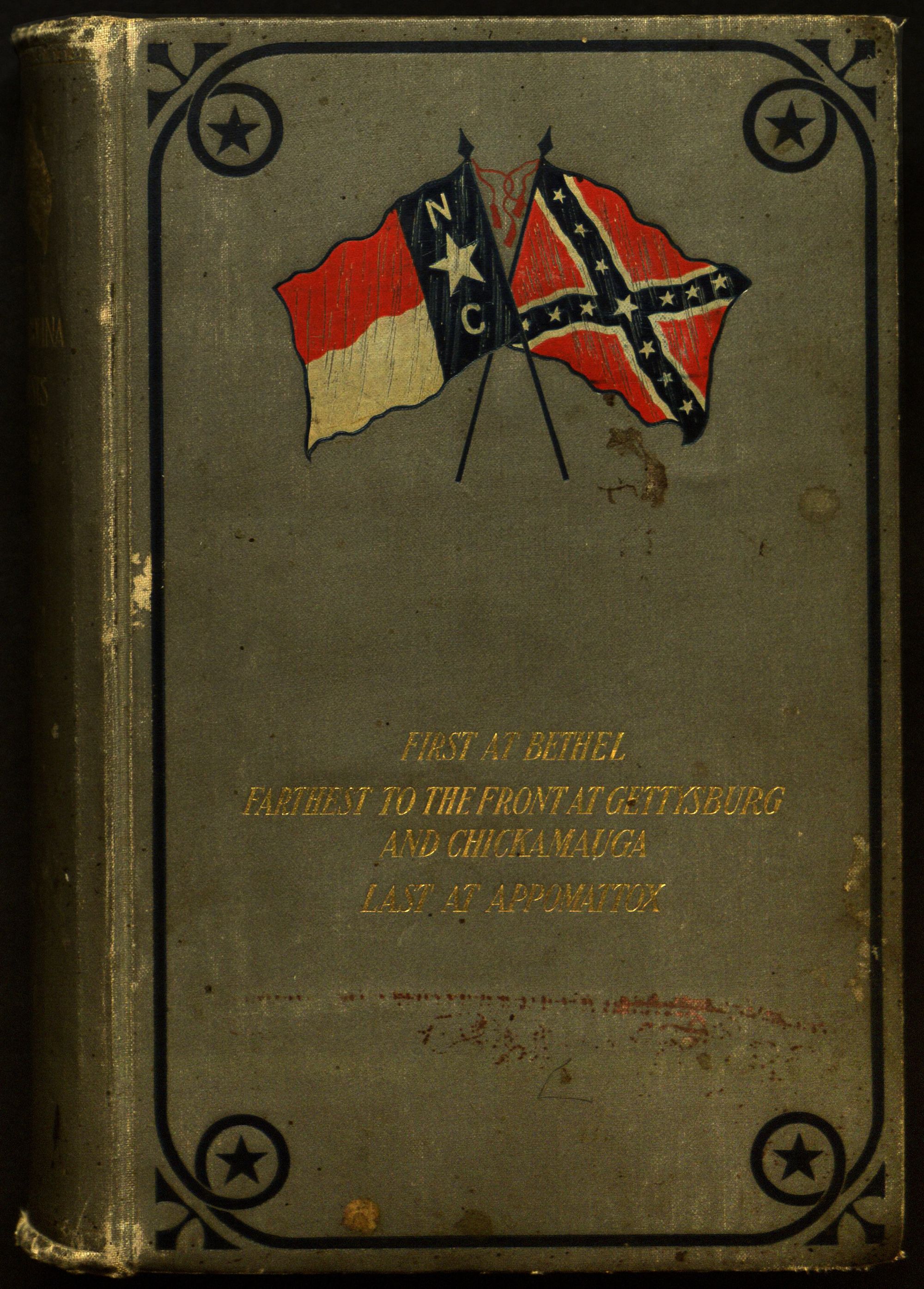 Histories of the several regiments and battalions from North Carolina, in the great war 1861-'65. Written by members of the respective commands. Ed. by Walter Clark. Pub. by the state. Wendell, N.C. (Rte. 2, Box 28A, Wendell 27591) Broadfoot's Bookmark, 1982. 5 v., ill., ports., maps ; 24 cm. Cover title: First at Bethel, farthest to the front at Gettysburg and Chickamauga, last at Appomattox. Spine title: North Carolina regiments, 1861-'65. Reprint. Originally published: [Raleigh, N.C.] : E.M. Uzzell, 1901. Includes indexes.