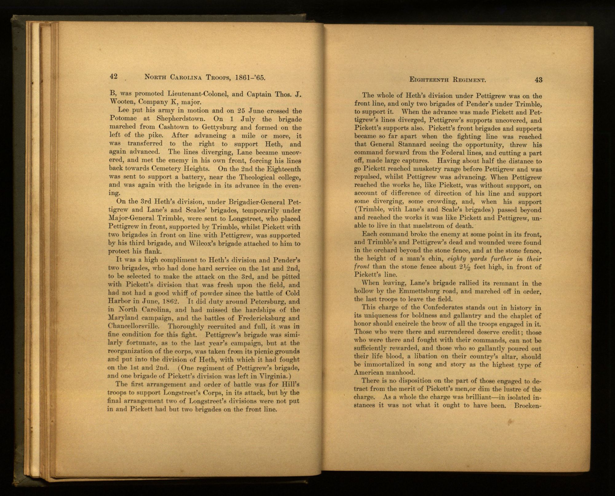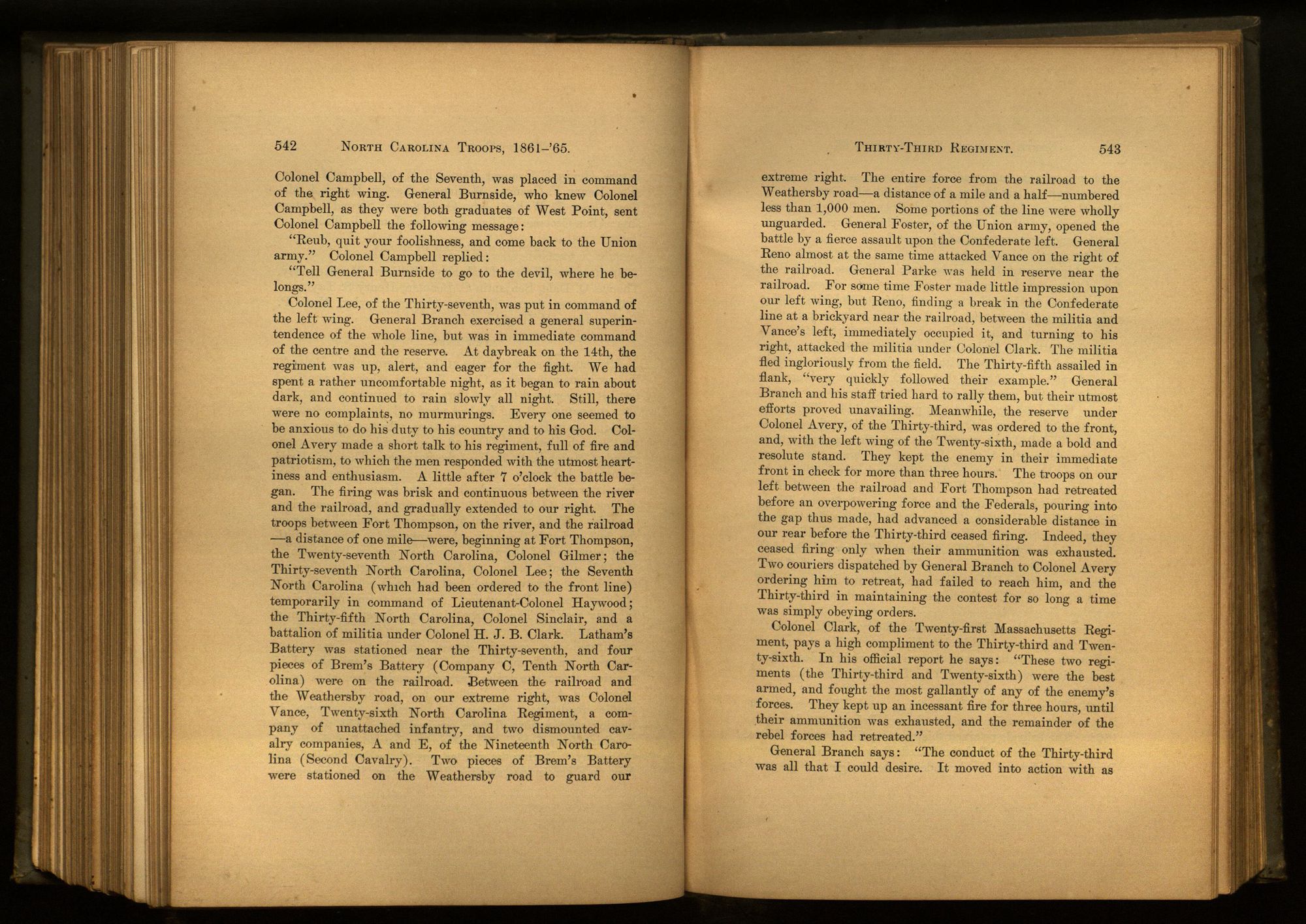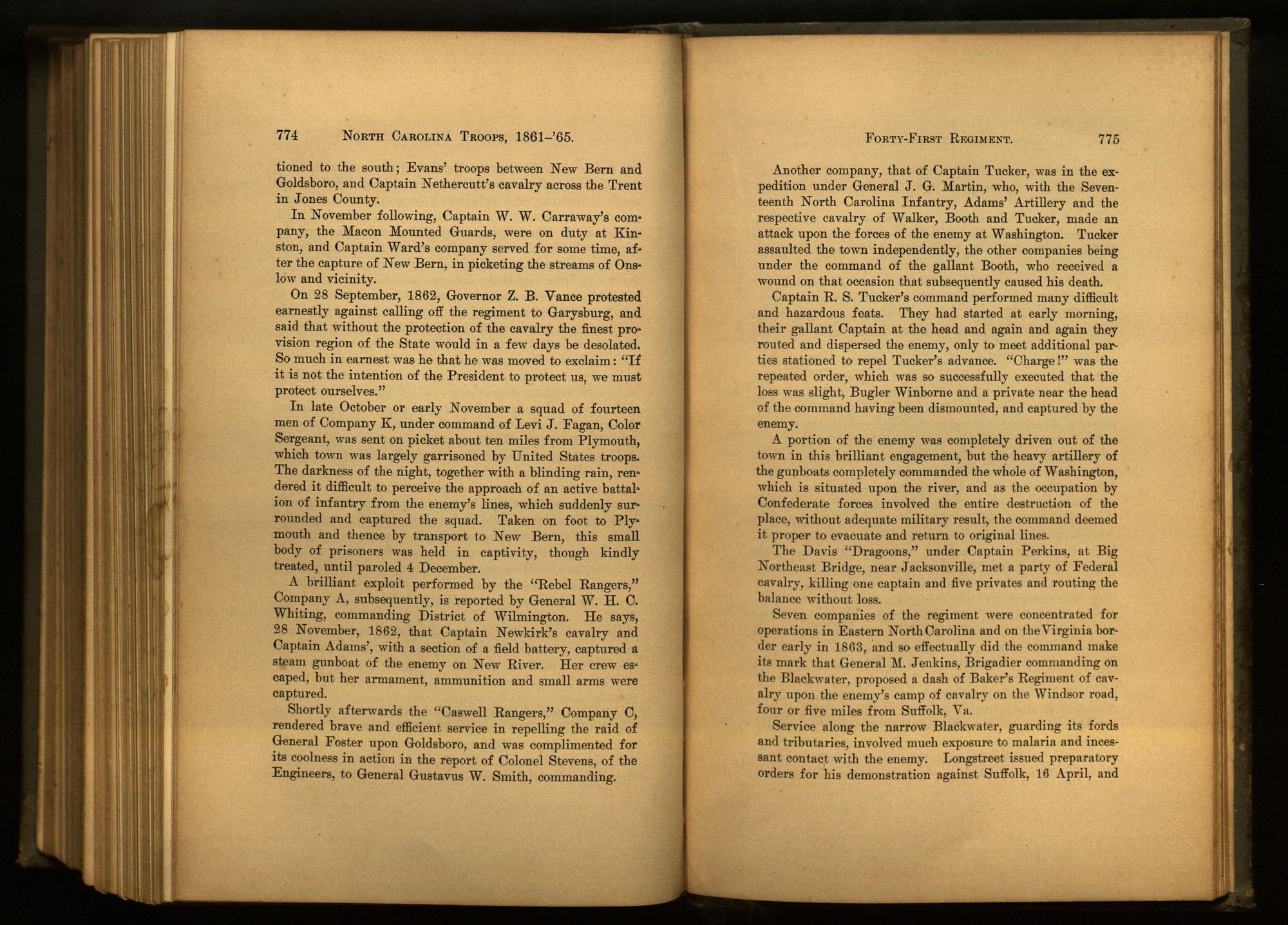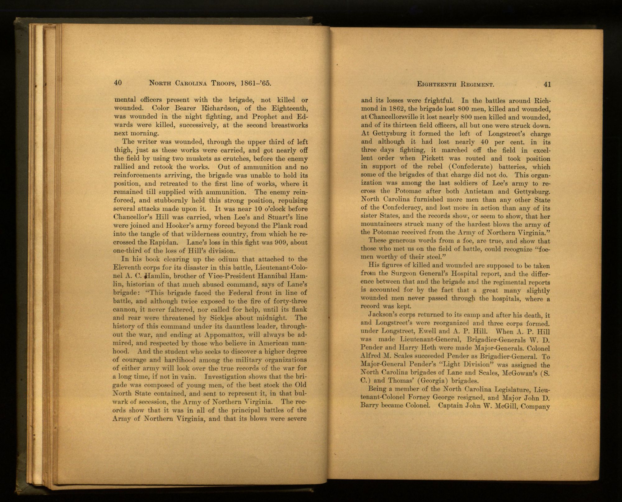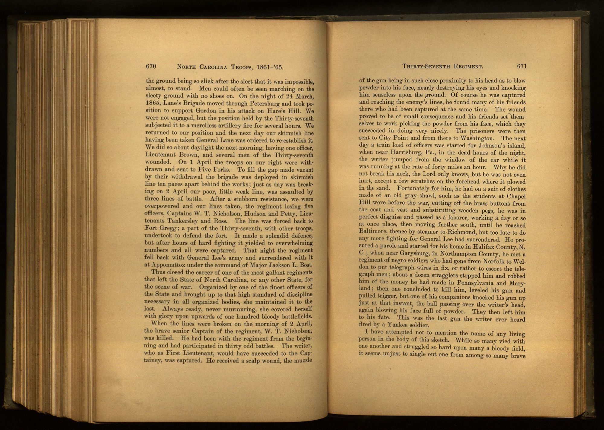 Histories of the several regiments and battalions from North Carolina, in the great war 1861-'65. Written by members of the respective commands. Ed. by Walter Clark. Pub. by the state. Wendell, N.C. (Rte. 2, Box 28A, Wendell 27591) Broadfoot's Bookmark, 1982. 5 v., ill., ports., maps ; 24 cm. Cover title: First at Bethel, farthest to the front at Gettysburg and Chickamauga, last at Appomattox. Spine title: North Carolina regiments, 1861-'65. Reprint. Originally published: [Raleigh, N.C.] : E.M. Uzzell, 1901. Includes indexes.