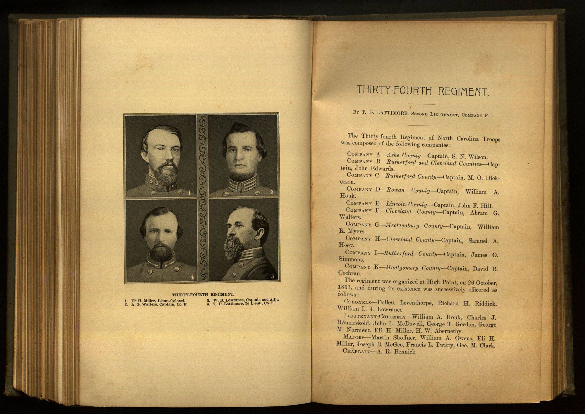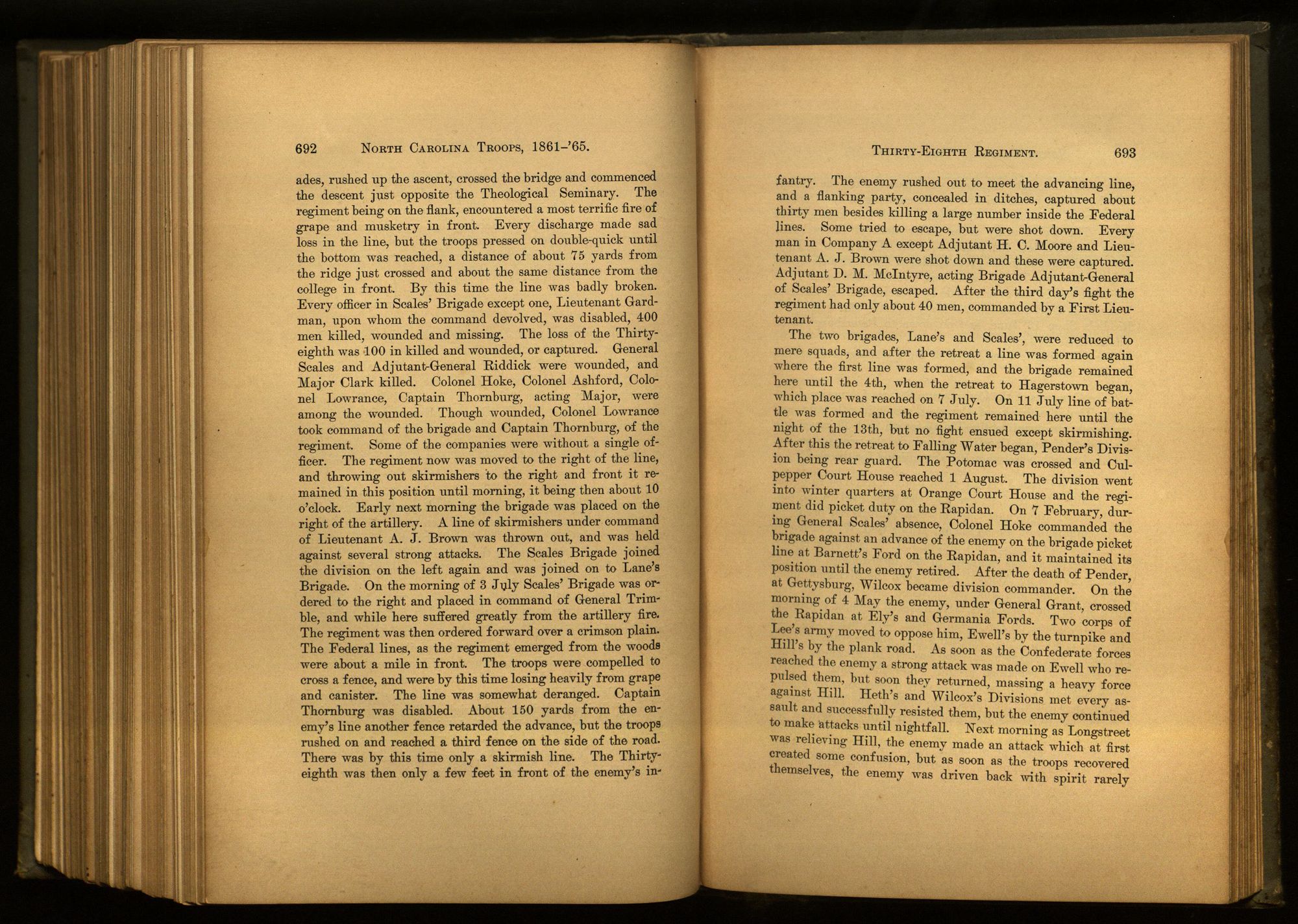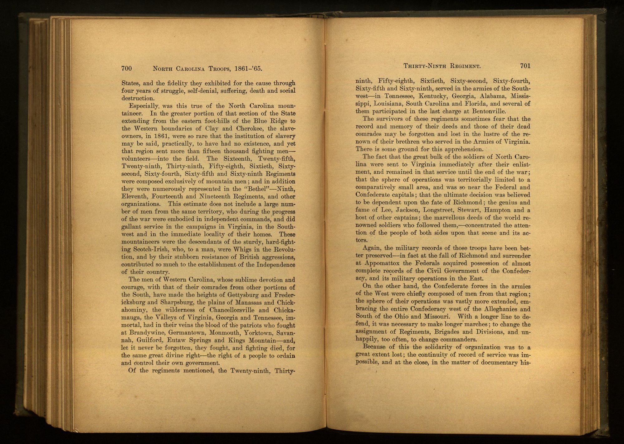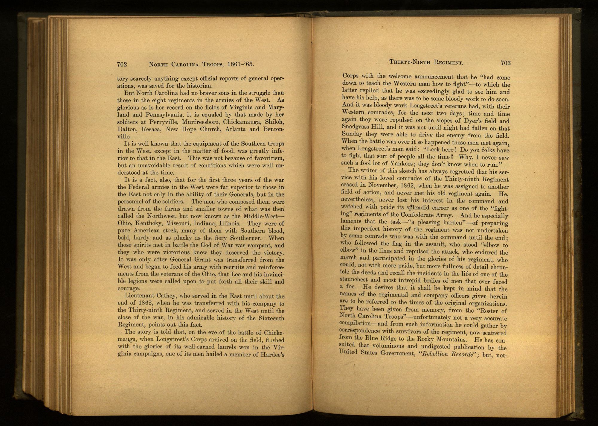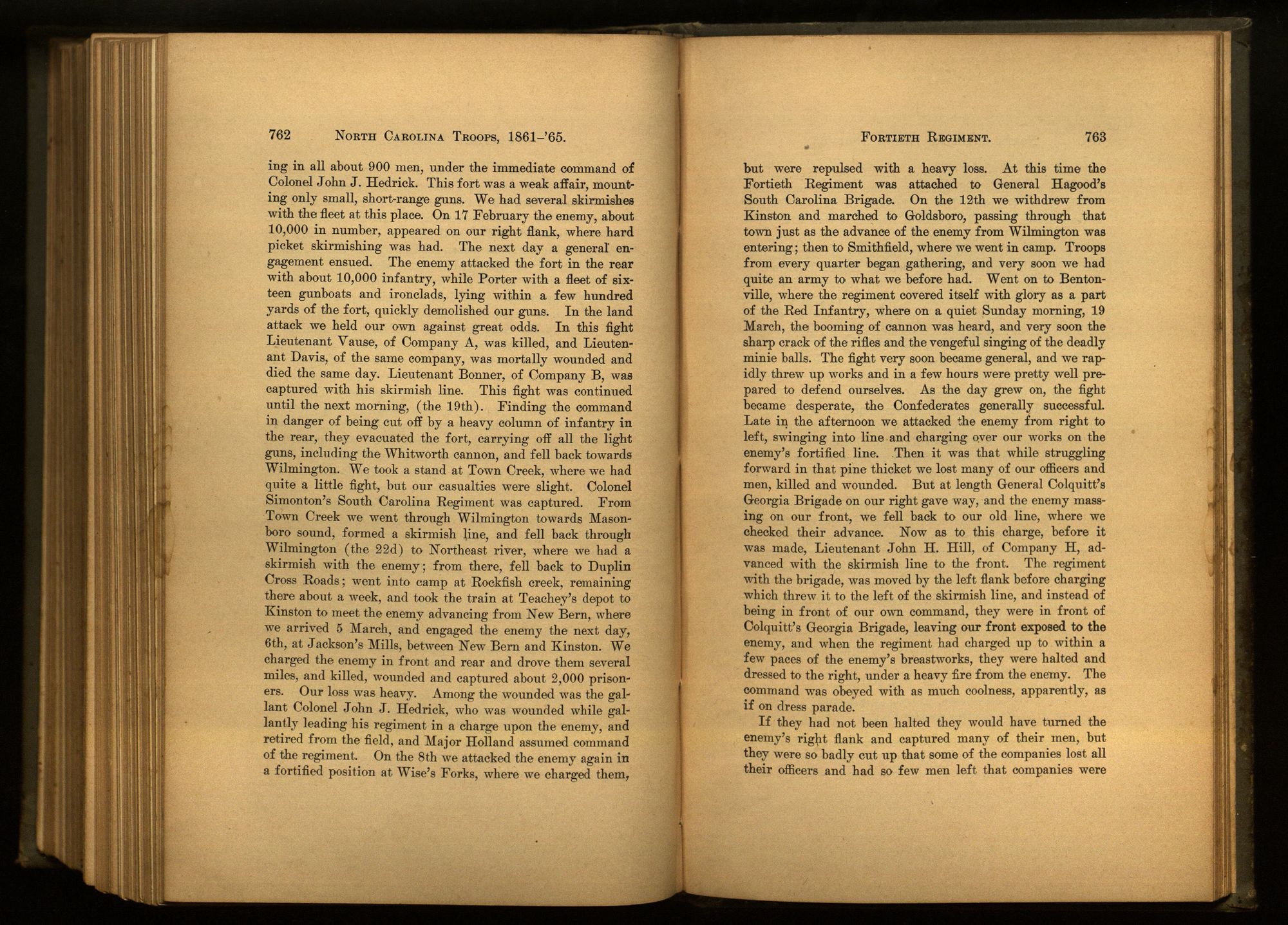 Histories of the several regiments and battalions from North Carolina, in the great war 1861-'65. Written by members of the respective commands. Ed. by Walter Clark. Pub. by the state. Wendell, N.C. (Rte. 2, Box 28A, Wendell 27591) Broadfoot's Bookmark, 1982. 5 v., ill., ports., maps ; 24 cm. Cover title: First at Bethel, farthest to the front at Gettysburg and Chickamauga, last at Appomattox. Spine title: North Carolina regiments, 1861-'65. Reprint. Originally published: [Raleigh, N.C.] : E.M. Uzzell, 1901. Includes indexes.