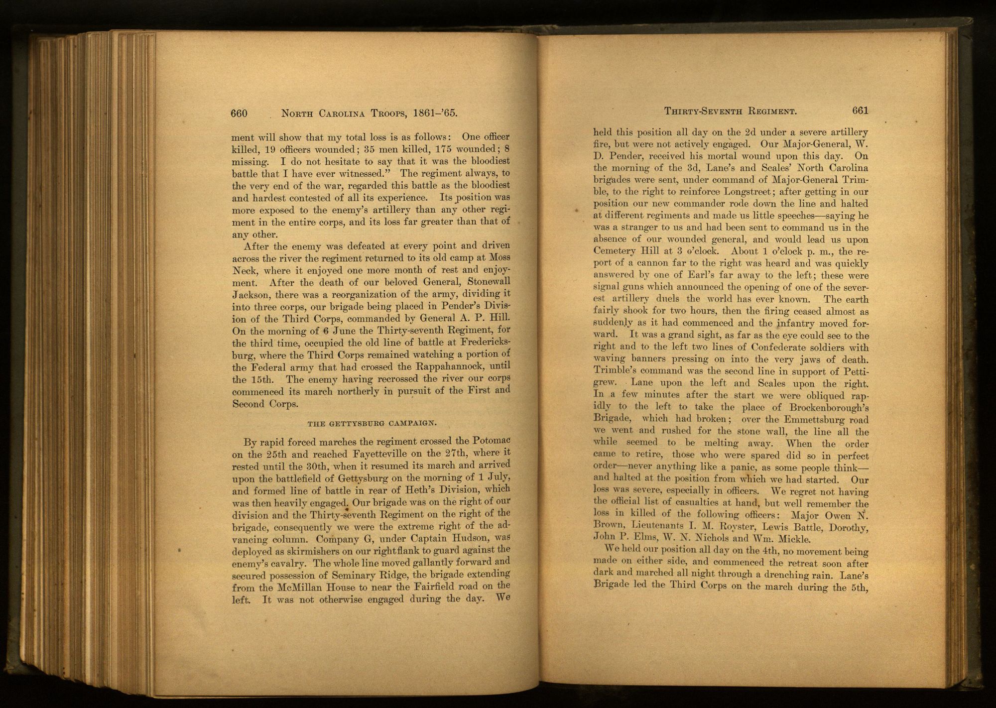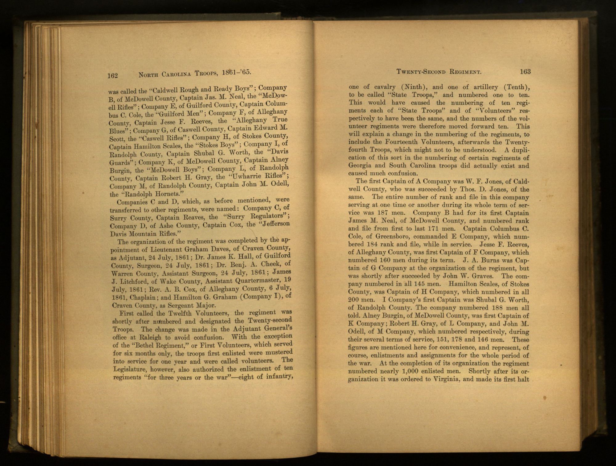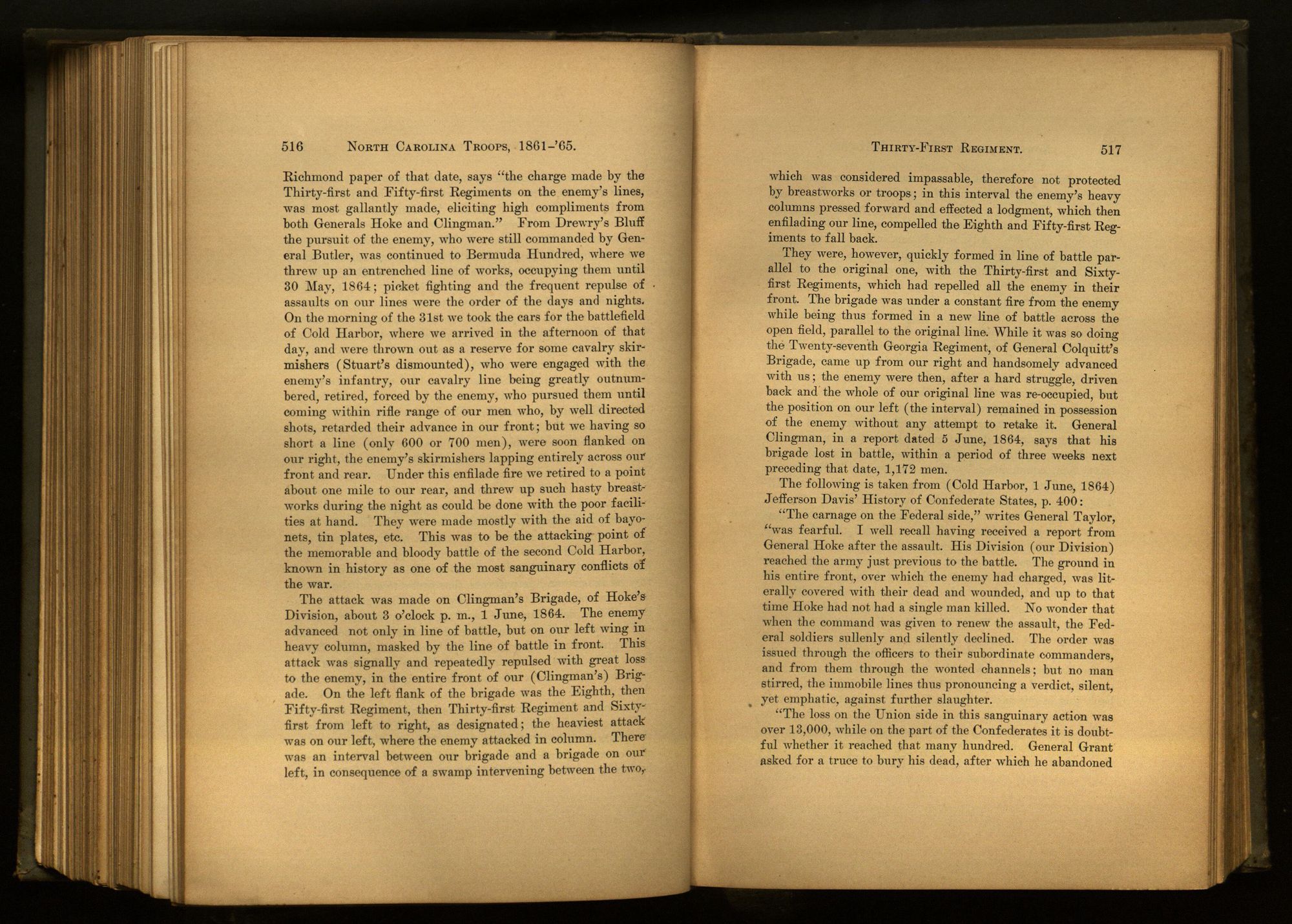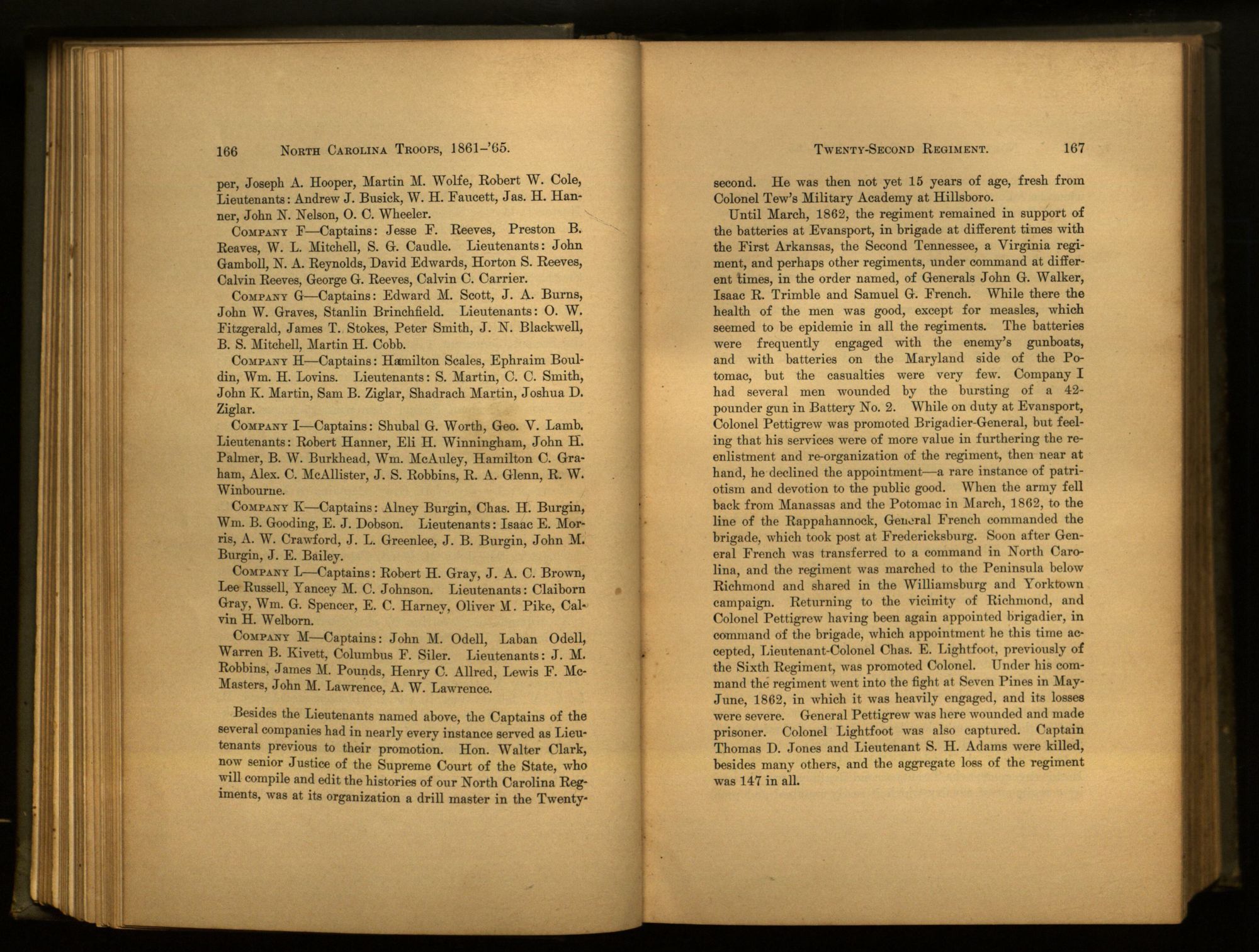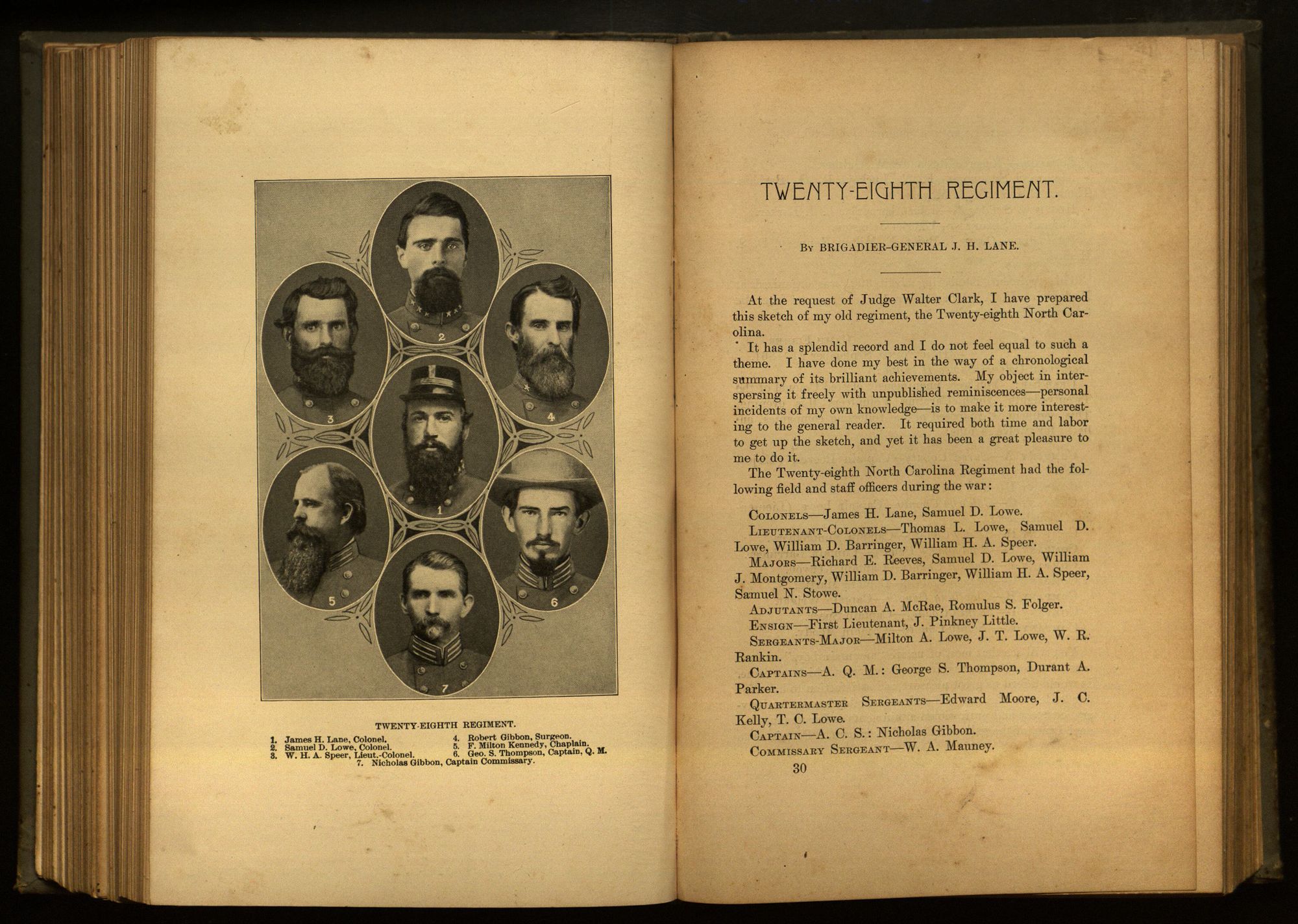 Histories of the several regiments and battalions from North Carolina, in the great war 1861-'65. Written by members of the respective commands. Ed. by Walter Clark. Pub. by the state. Wendell, N.C. (Rte. 2, Box 28A, Wendell 27591) Broadfoot's Bookmark, 1982. 5 v., ill., ports., maps ; 24 cm. Cover title: First at Bethel, farthest to the front at Gettysburg and Chickamauga, last at Appomattox. Spine title: North Carolina regiments, 1861-'65. Reprint. Originally published: [Raleigh, N.C.] : E.M. Uzzell, 1901. Includes indexes.