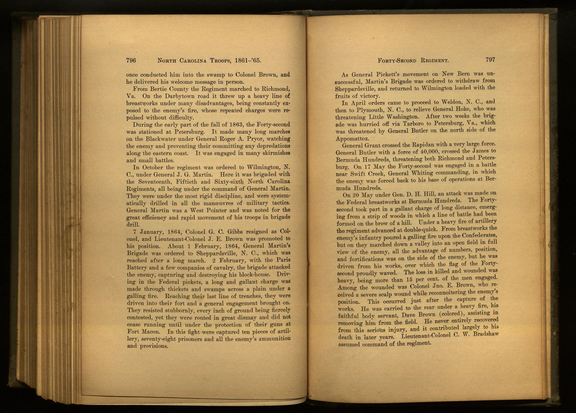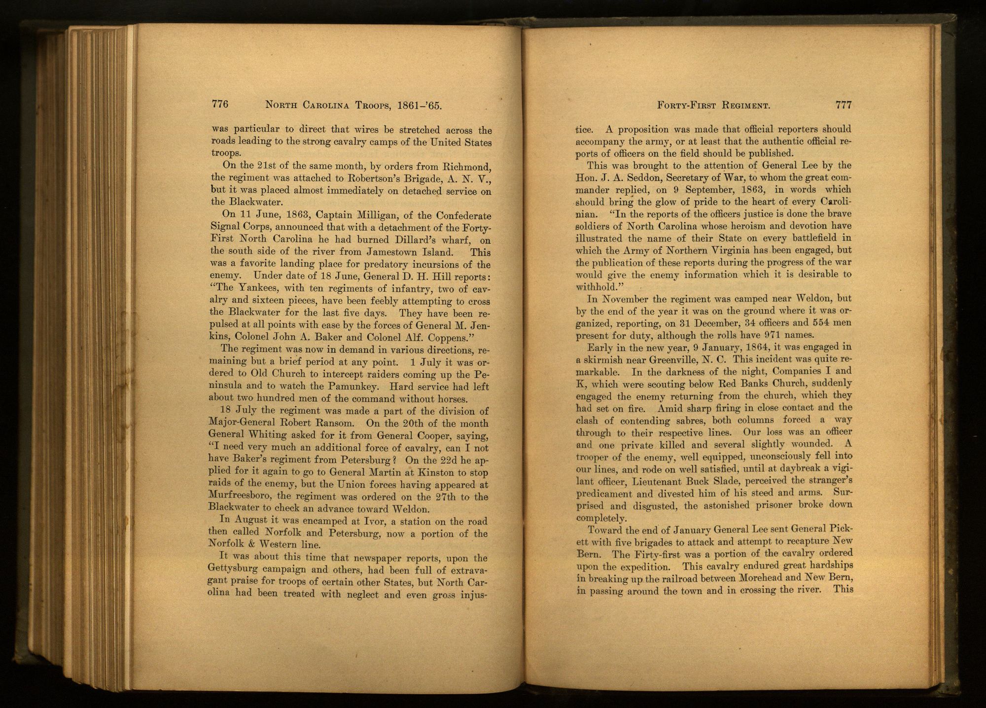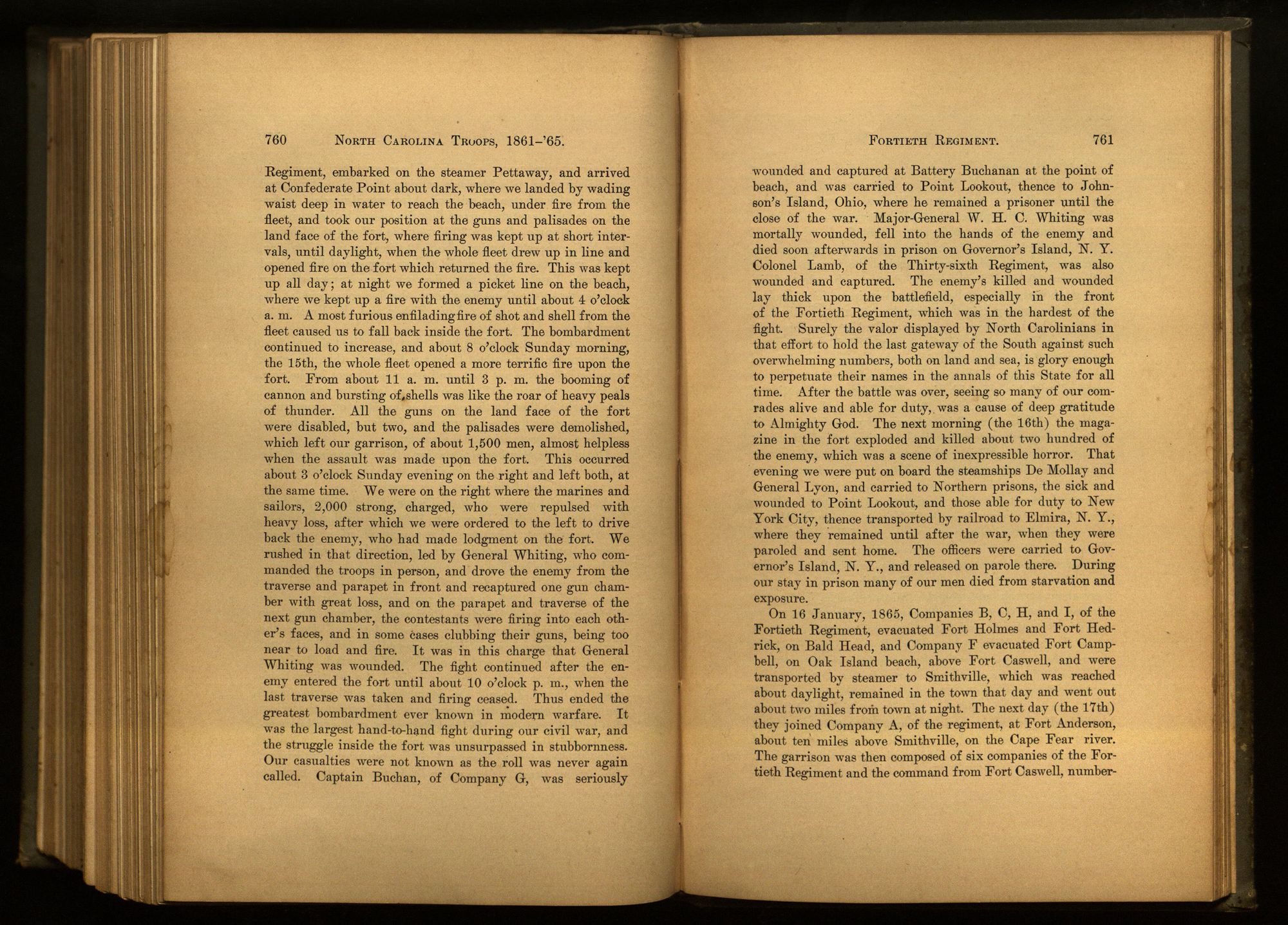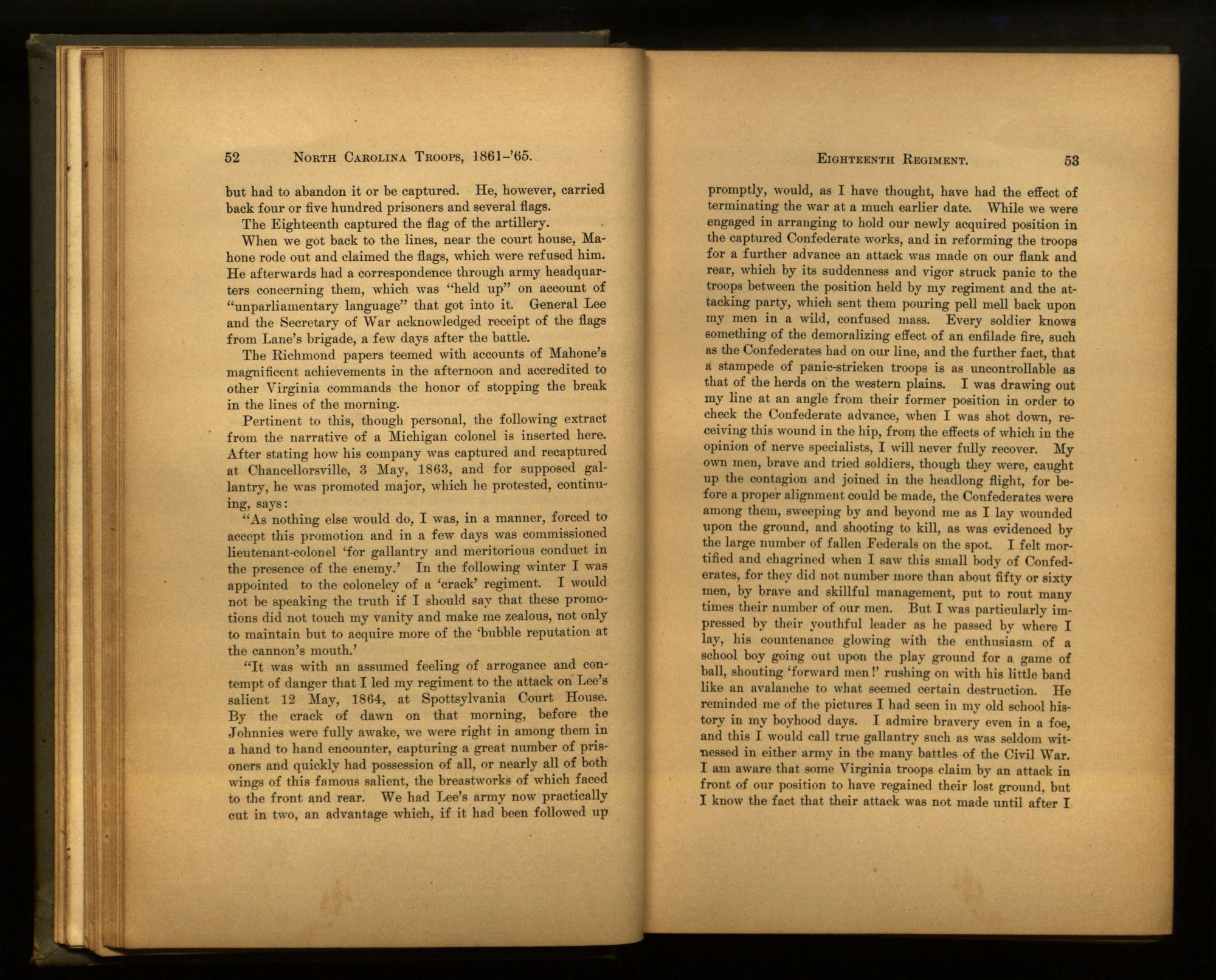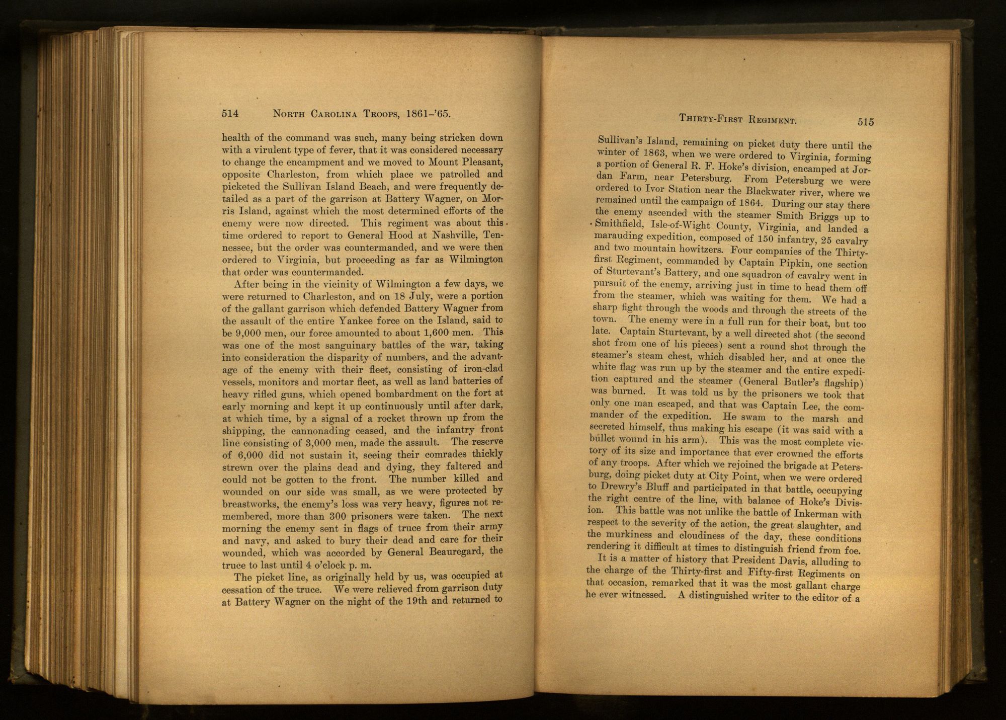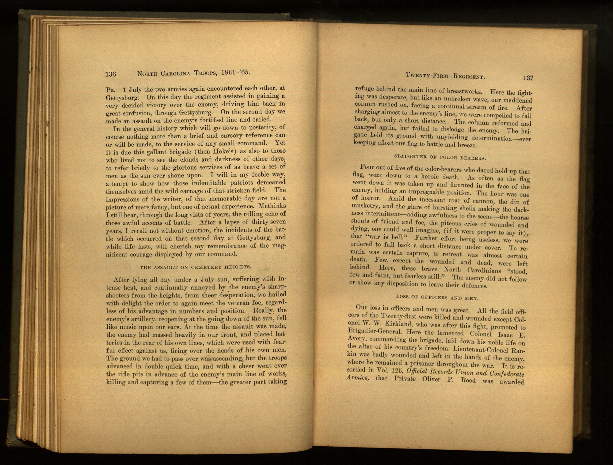 Histories of the several regiments and battalions from North Carolina, in the great war 1861-'65. Written by members of the respective commands. Ed. by Walter Clark. Pub. by the state. Wendell, N.C. (Rte. 2, Box 28A, Wendell 27591) Broadfoot's Bookmark, 1982. 5 v., ill., ports., maps ; 24 cm. Cover title: First at Bethel, farthest to the front at Gettysburg and Chickamauga, last at Appomattox. Spine title: North Carolina regiments, 1861-'65. Reprint. Originally published: [Raleigh, N.C.] : E.M. Uzzell, 1901. Includes indexes.