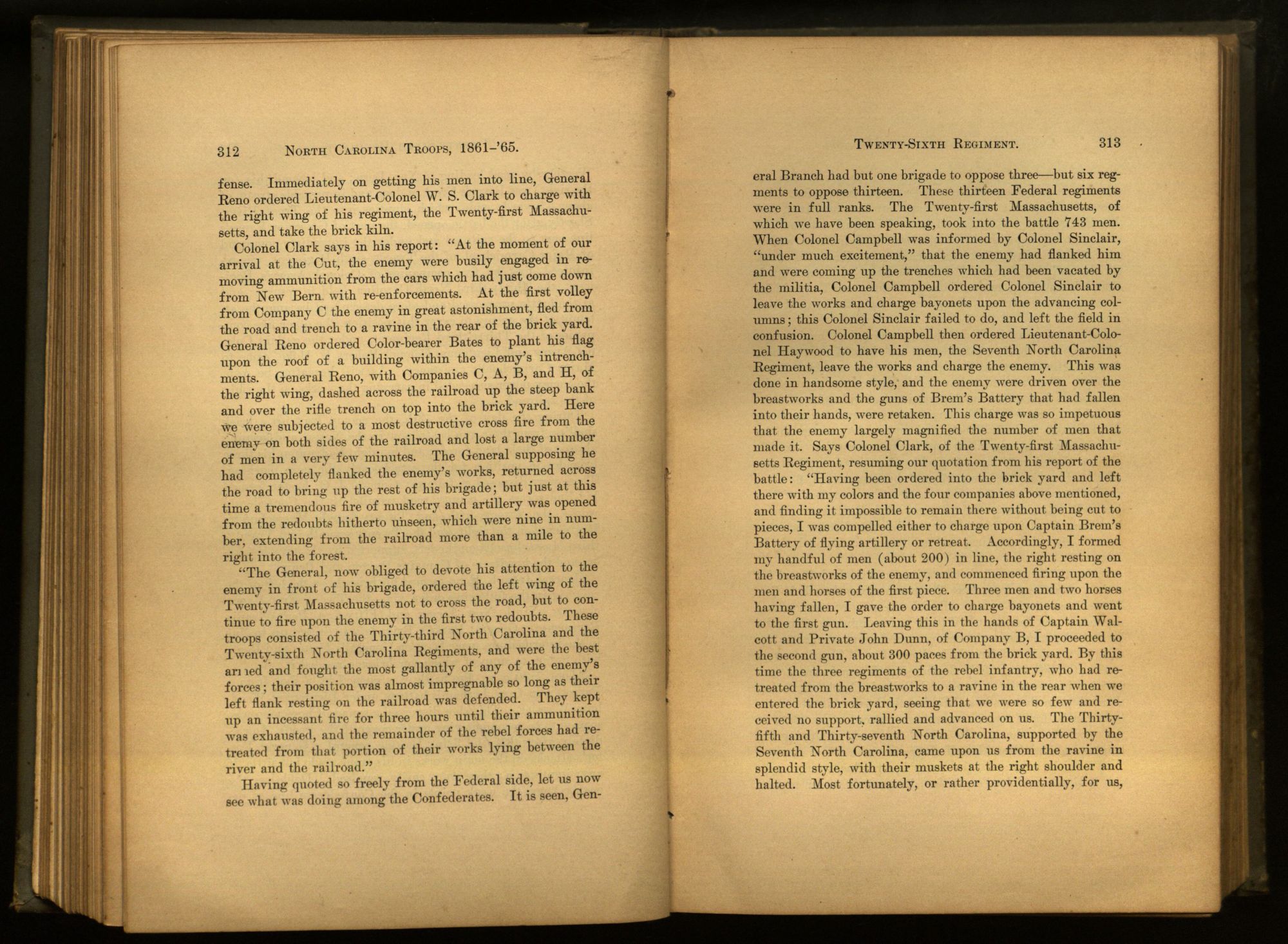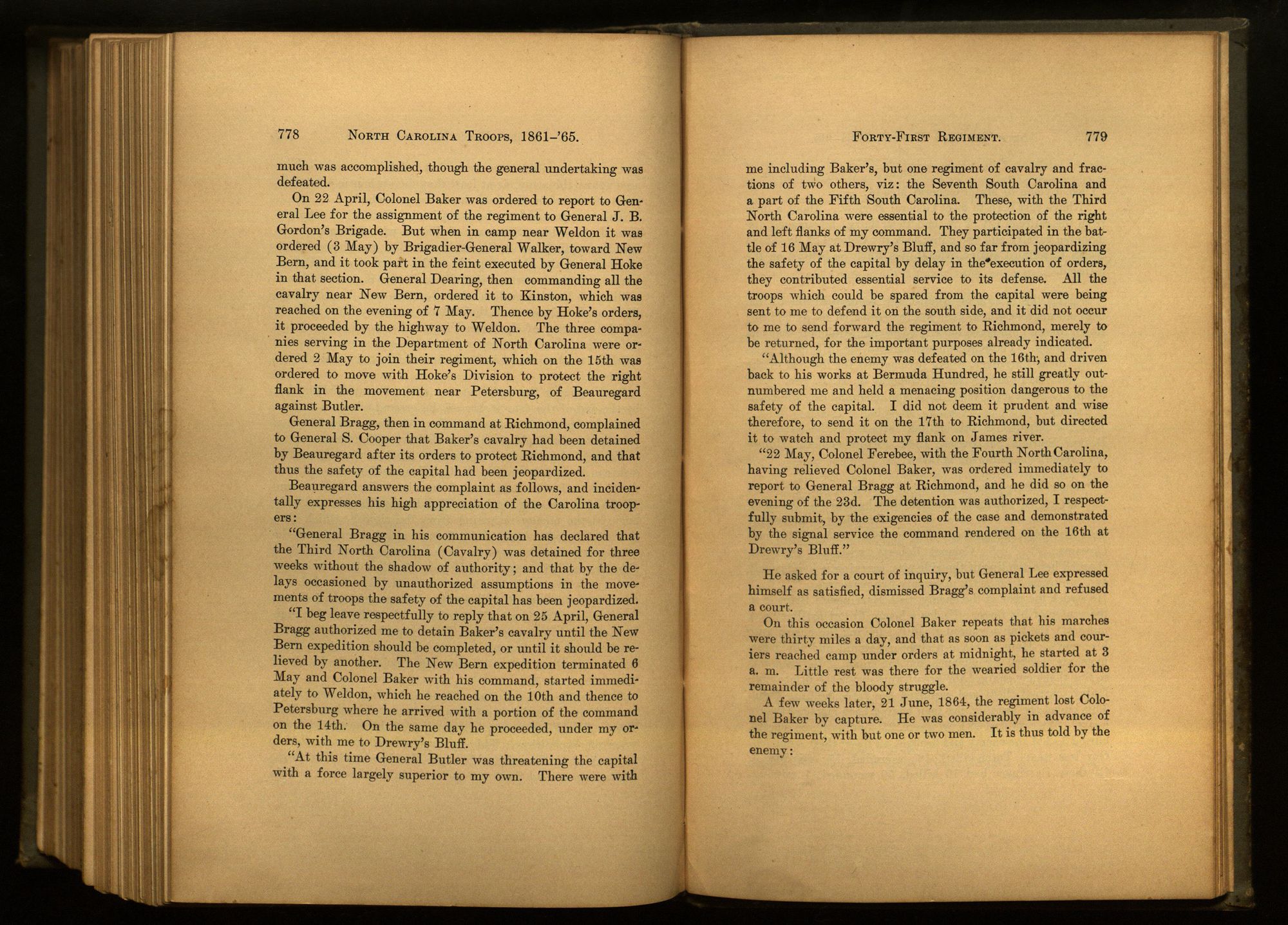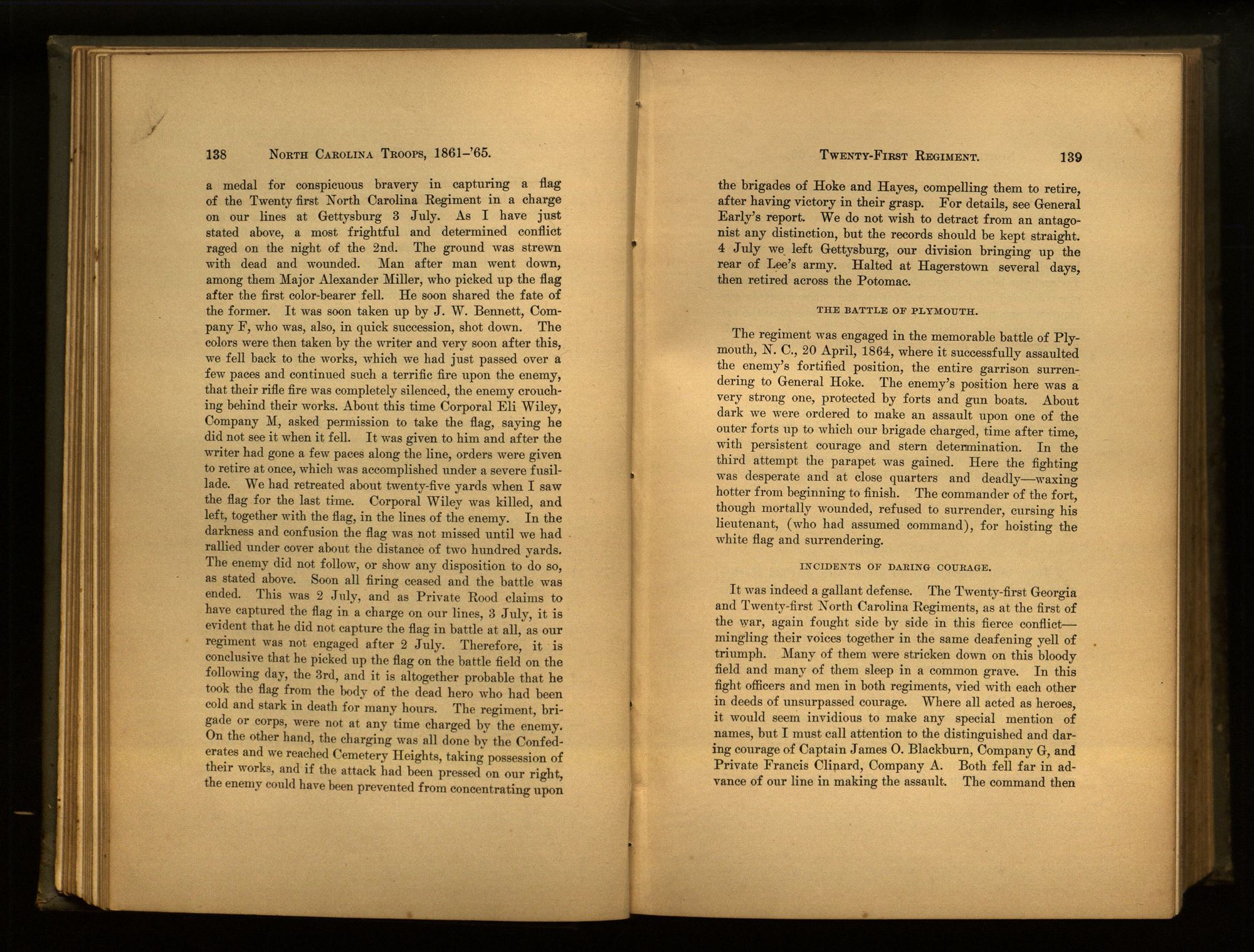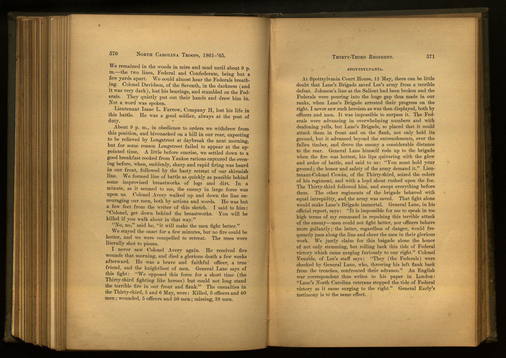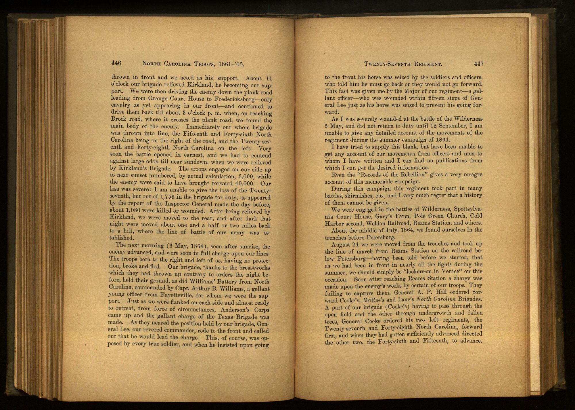 Histories of the several regiments and battalions from North Carolina, in the great war 1861-'65. Written by members of the respective commands. Ed. by Walter Clark. Pub. by the state. Wendell, N.C. (Rte. 2, Box 28A, Wendell 27591) Broadfoot's Bookmark, 1982. 5 v., ill., ports., maps ; 24 cm. Cover title: First at Bethel, farthest to the front at Gettysburg and Chickamauga, last at Appomattox. Spine title: North Carolina regiments, 1861-'65. Reprint. Originally published: [Raleigh, N.C.] : E.M. Uzzell, 1901. Includes indexes.