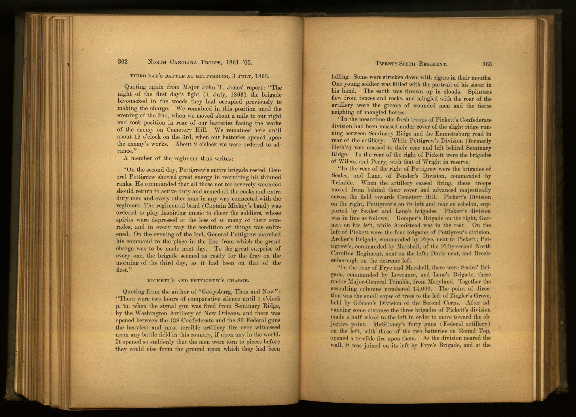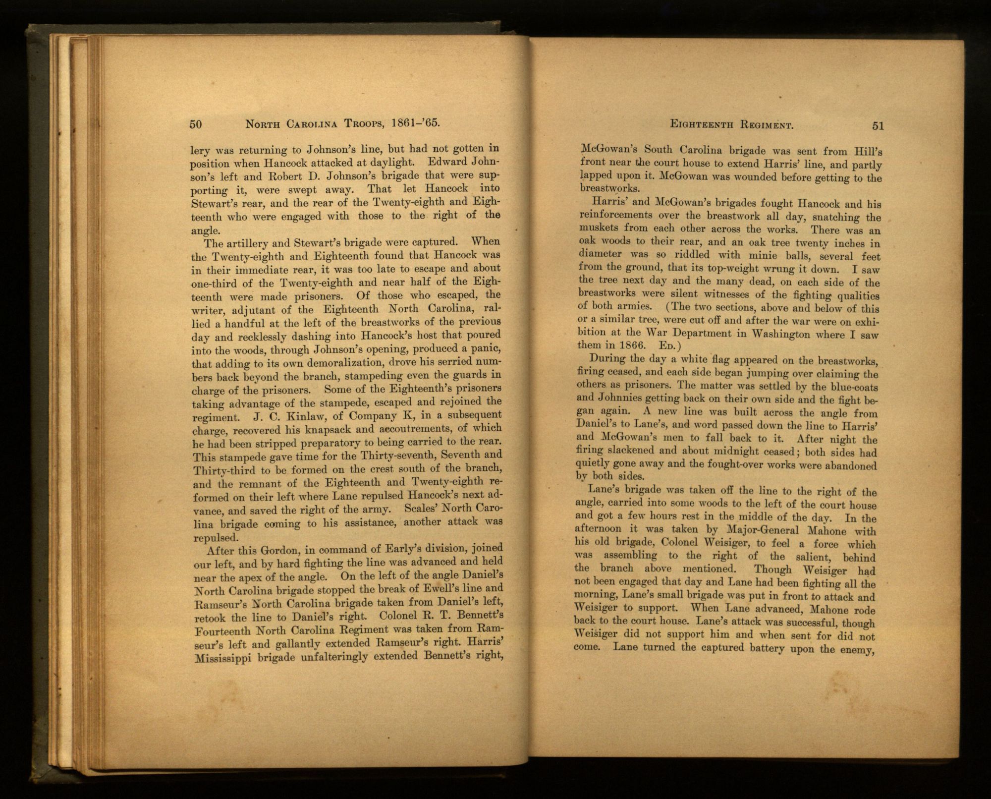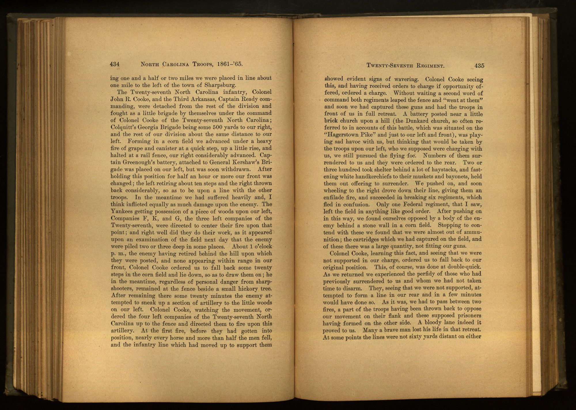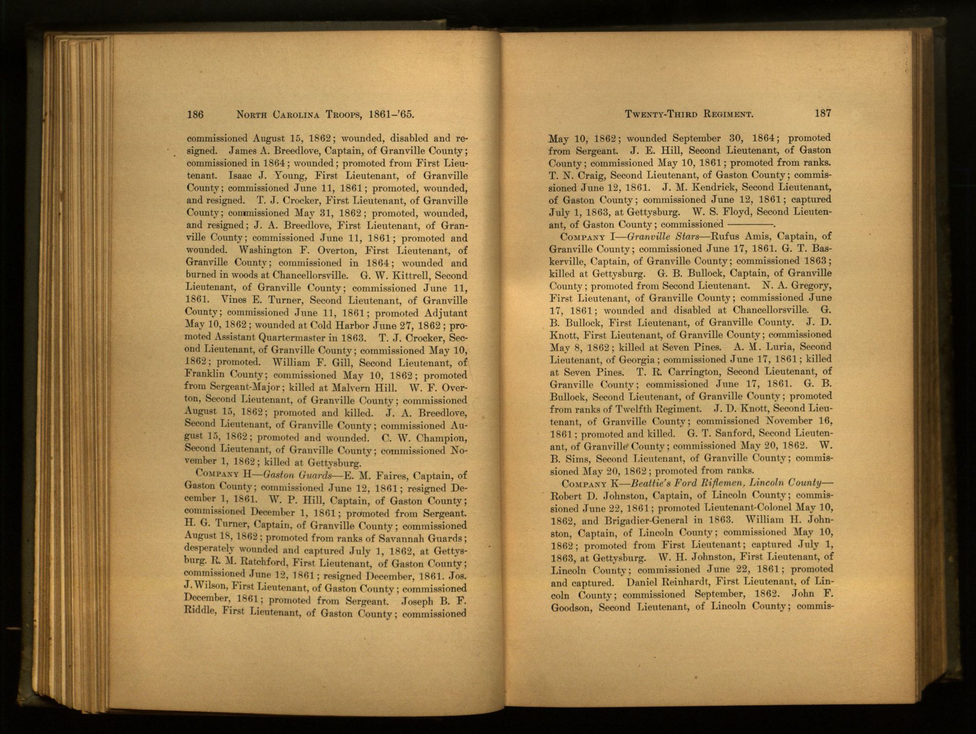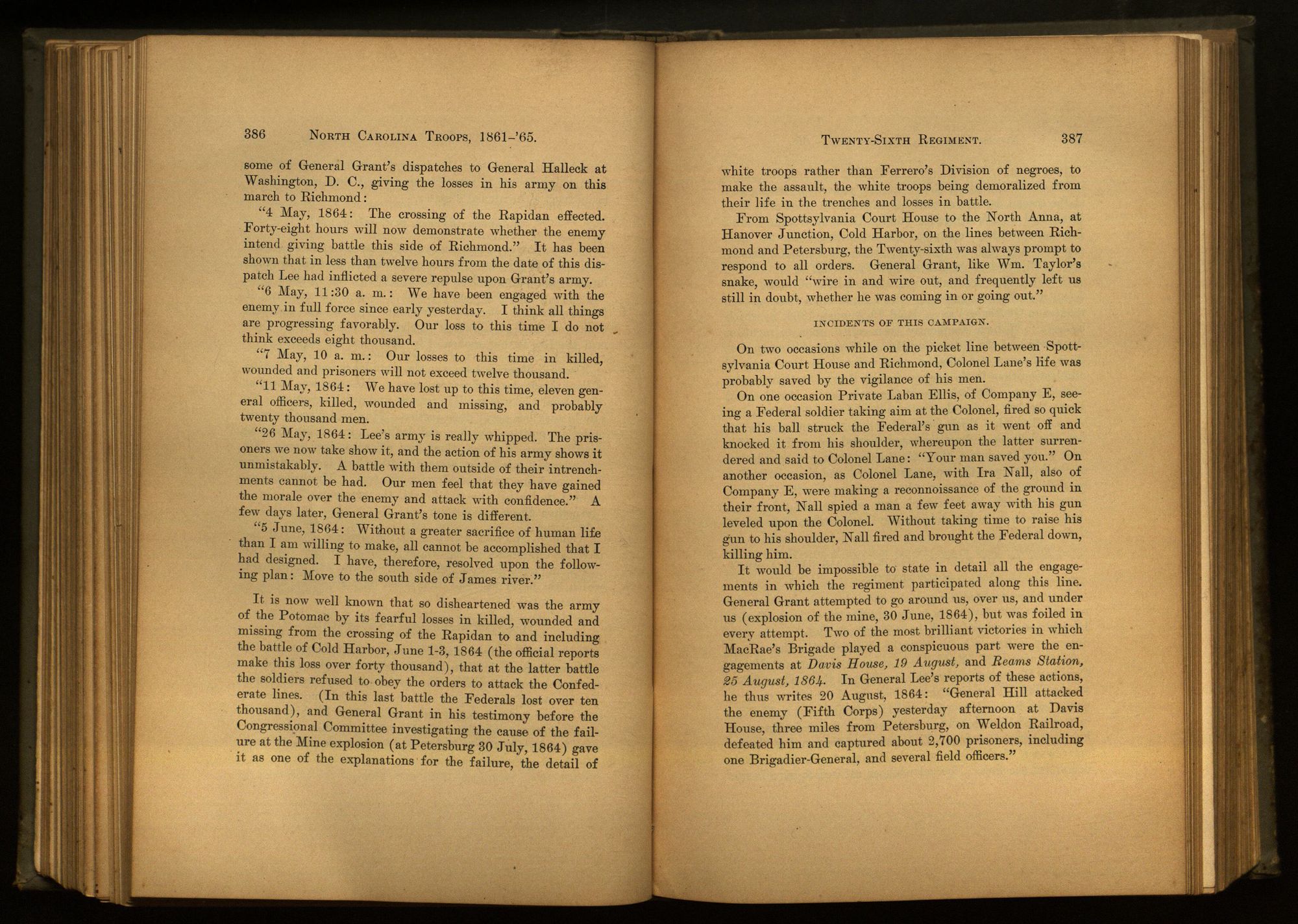 Histories of the several regiments and battalions from North Carolina, in the great war 1861-'65. Written by members of the respective commands. Ed. by Walter Clark. Pub. by the state. Wendell, N.C. (Rte. 2, Box 28A, Wendell 27591) Broadfoot's Bookmark, 1982. 5 v., ill., ports., maps ; 24 cm. Cover title: First at Bethel, farthest to the front at Gettysburg and Chickamauga, last at Appomattox. Spine title: North Carolina regiments, 1861-'65. Reprint. Originally published: [Raleigh, N.C.] : E.M. Uzzell, 1901. Includes indexes.