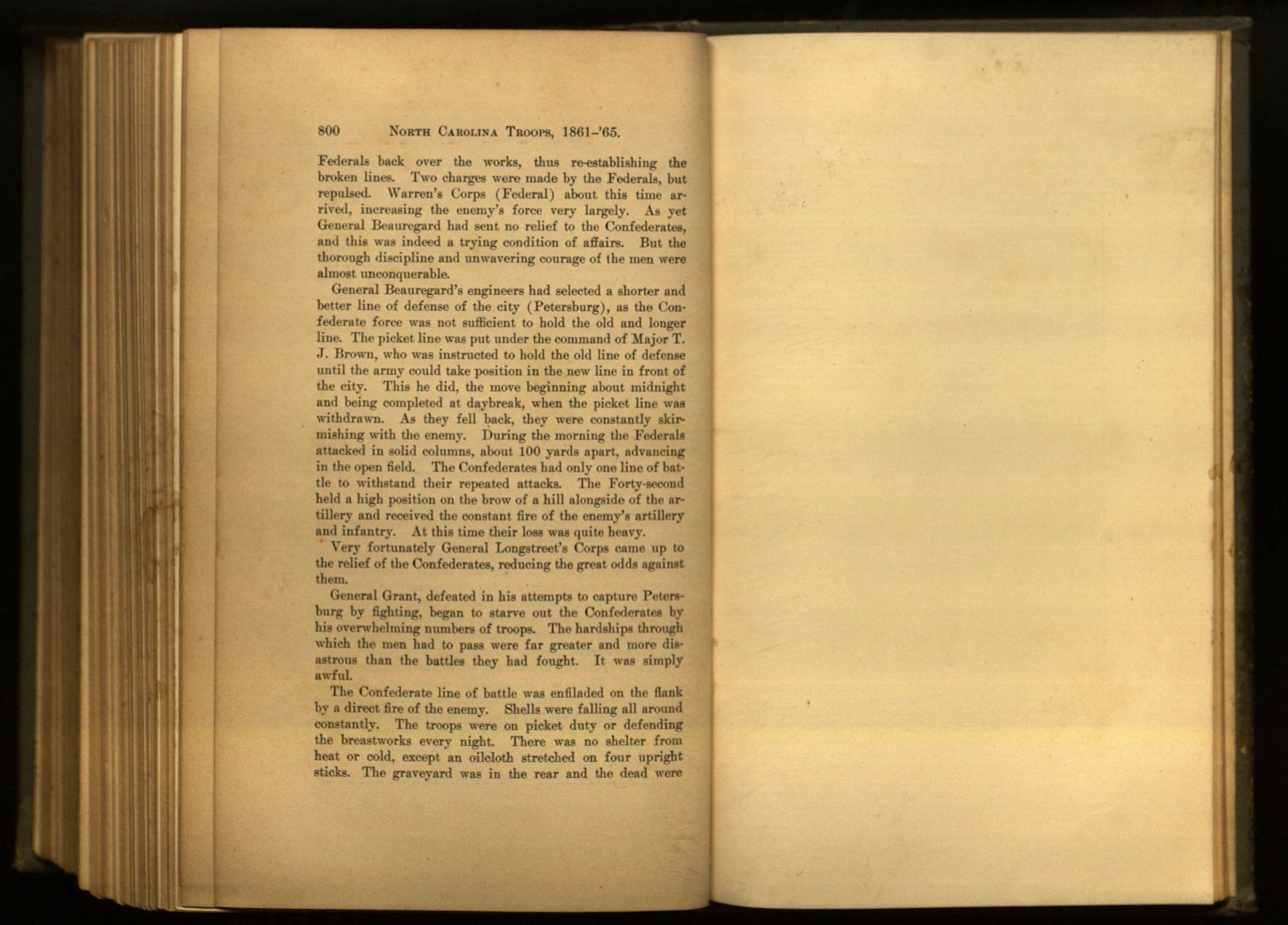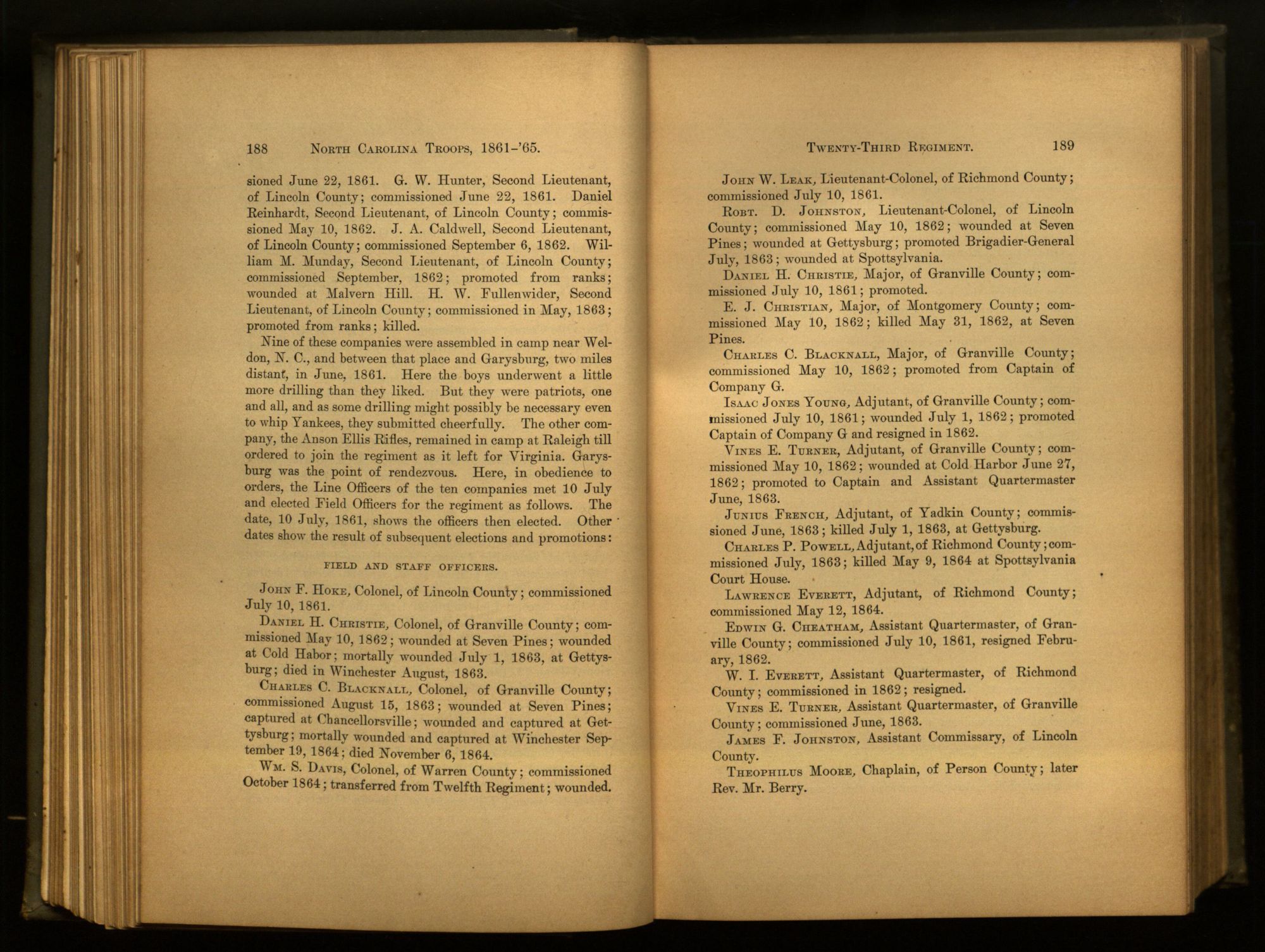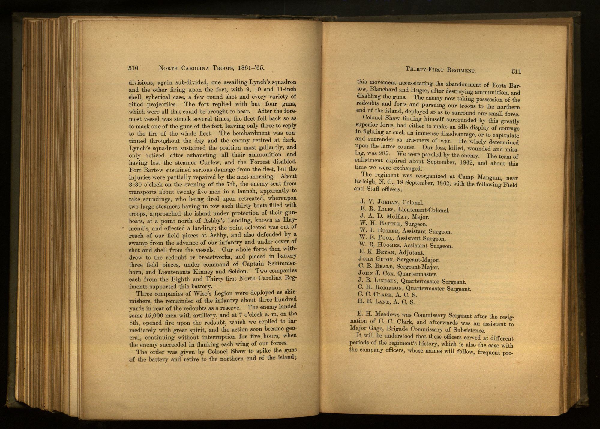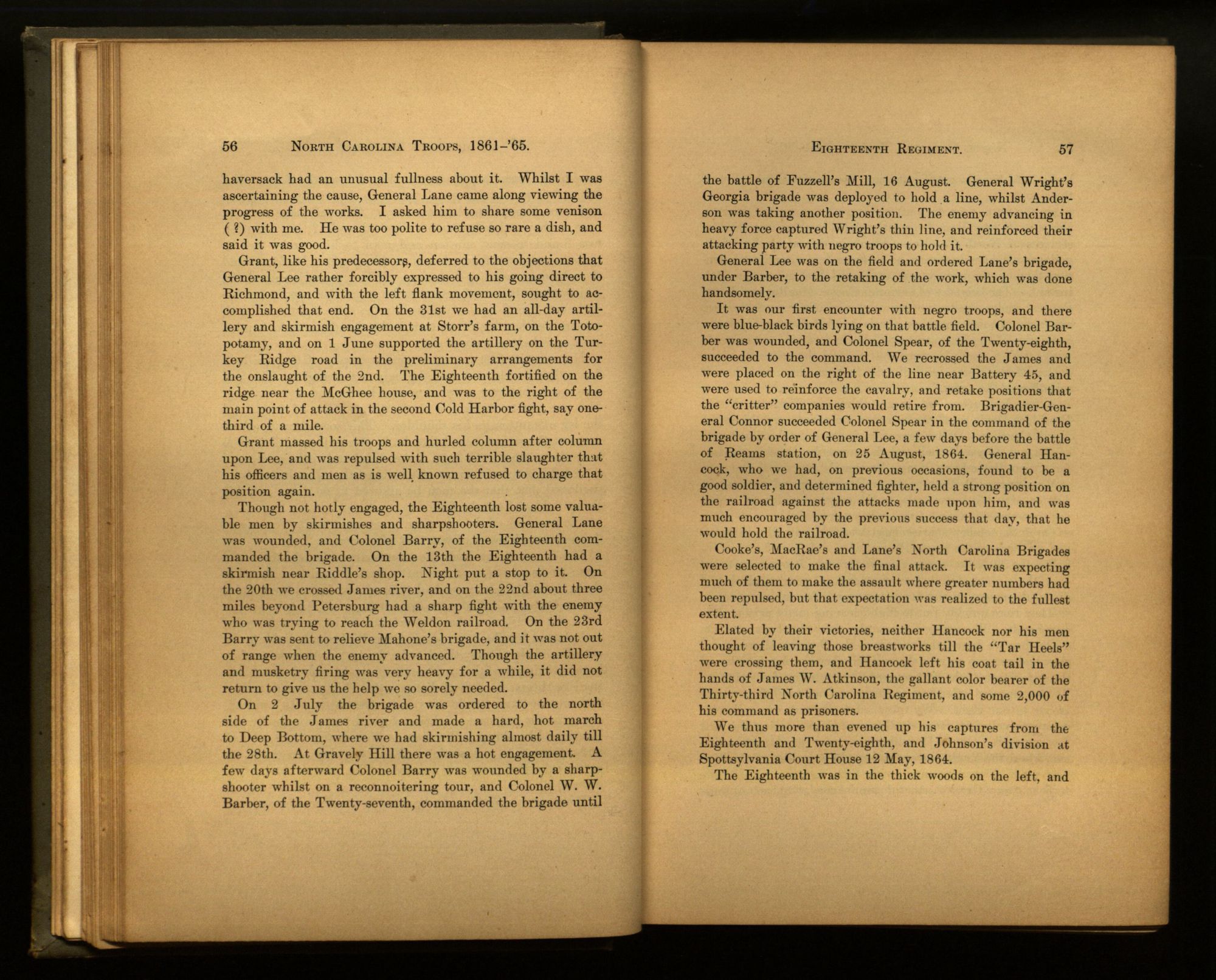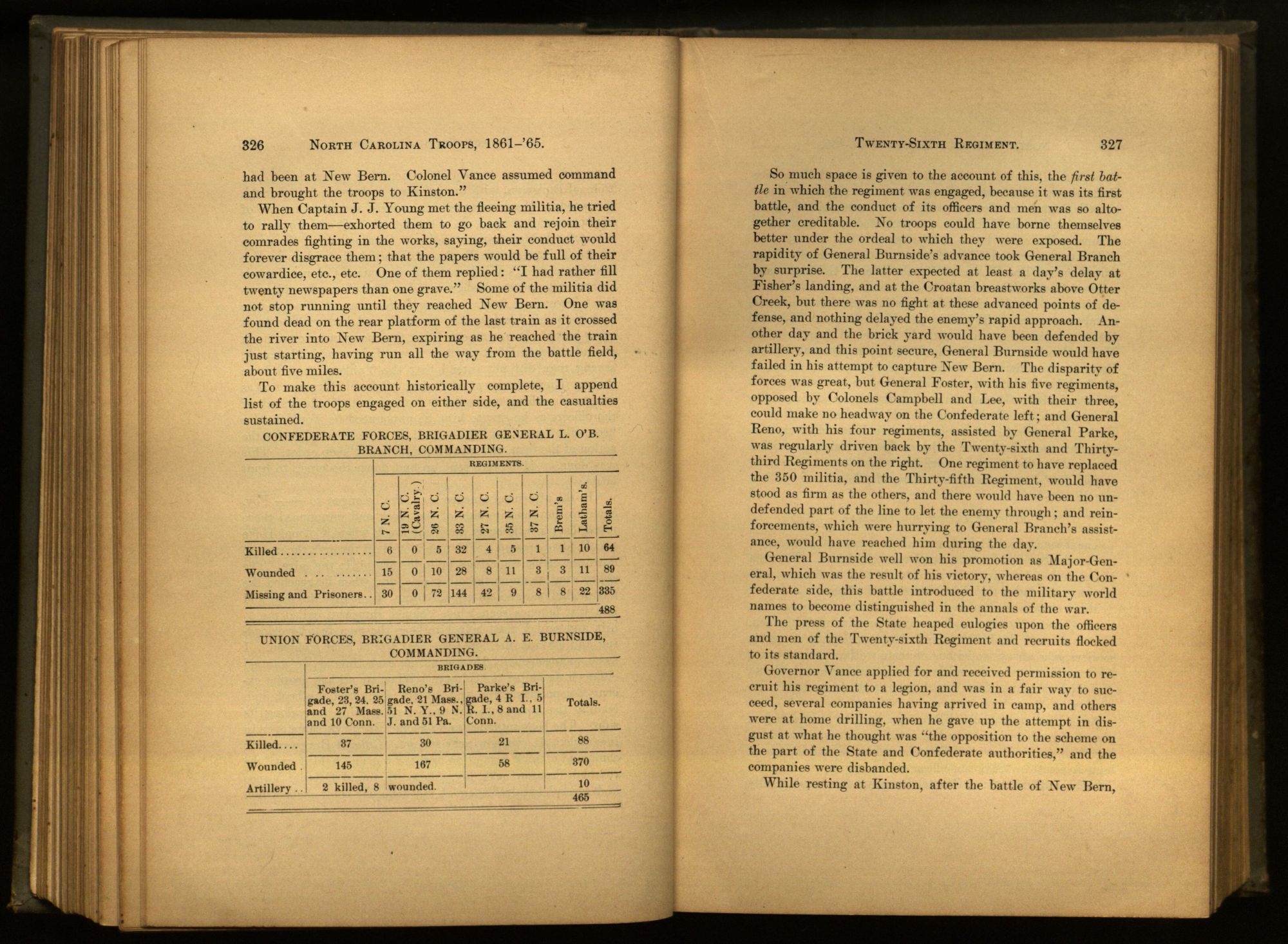 Histories of the several regiments and battalions from North Carolina, in the great war 1861-'65. Written by members of the respective commands. Ed. by Walter Clark. Pub. by the state. Wendell, N.C. (Rte. 2, Box 28A, Wendell 27591) Broadfoot's Bookmark, 1982. 5 v., ill., ports., maps ; 24 cm. Cover title: First at Bethel, farthest to the front at Gettysburg and Chickamauga, last at Appomattox. Spine title: North Carolina regiments, 1861-'65. Reprint. Originally published: [Raleigh, N.C.] : E.M. Uzzell, 1901. Includes indexes.