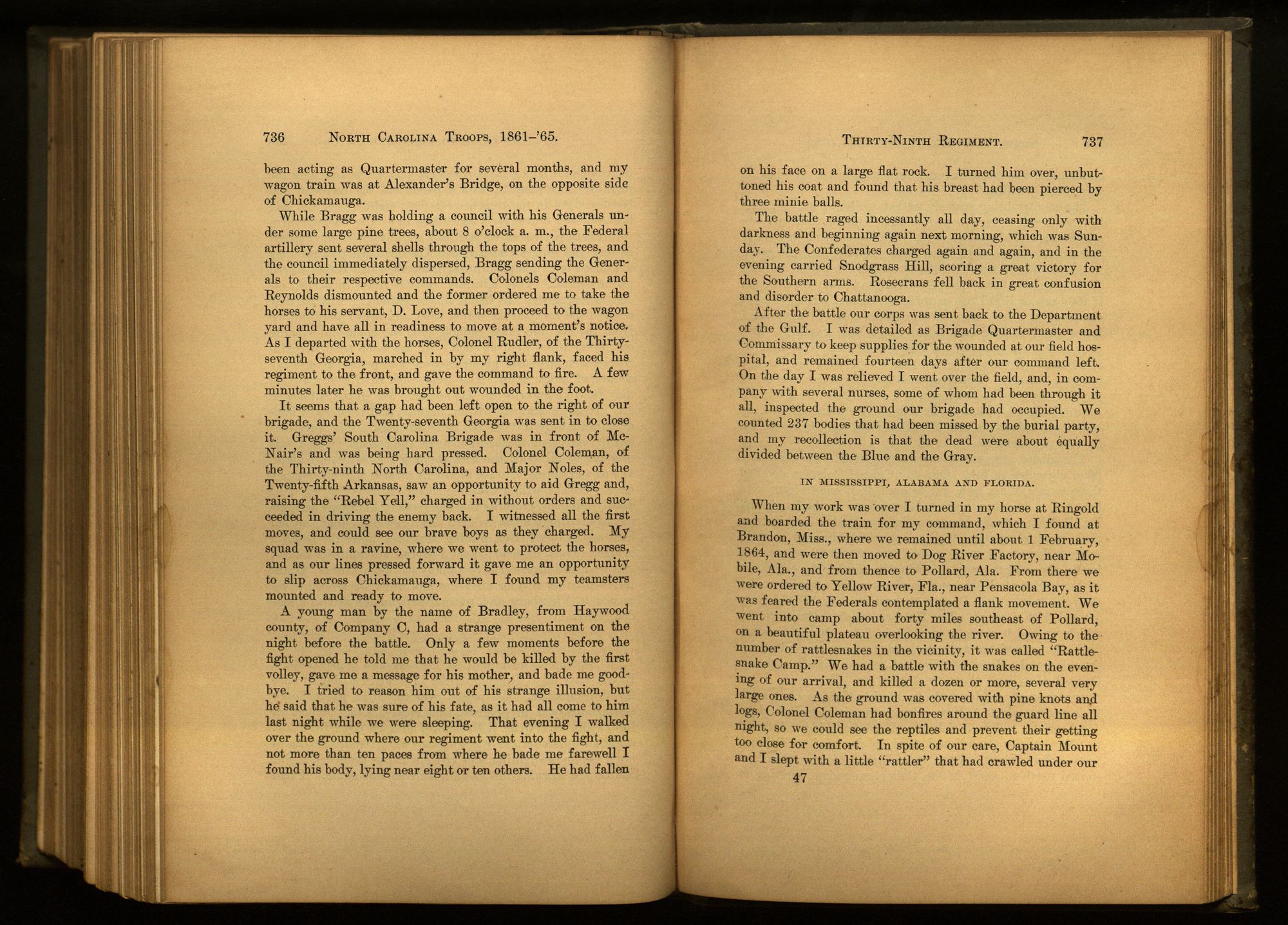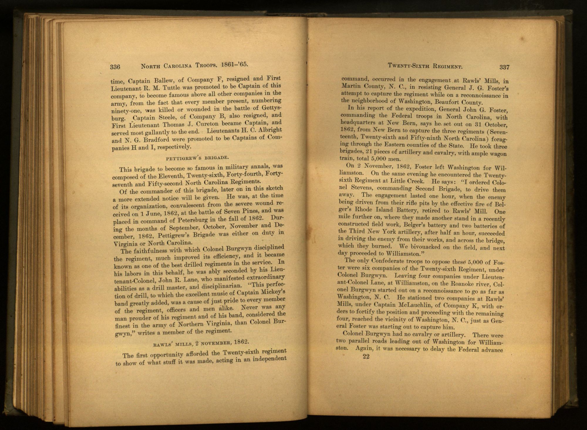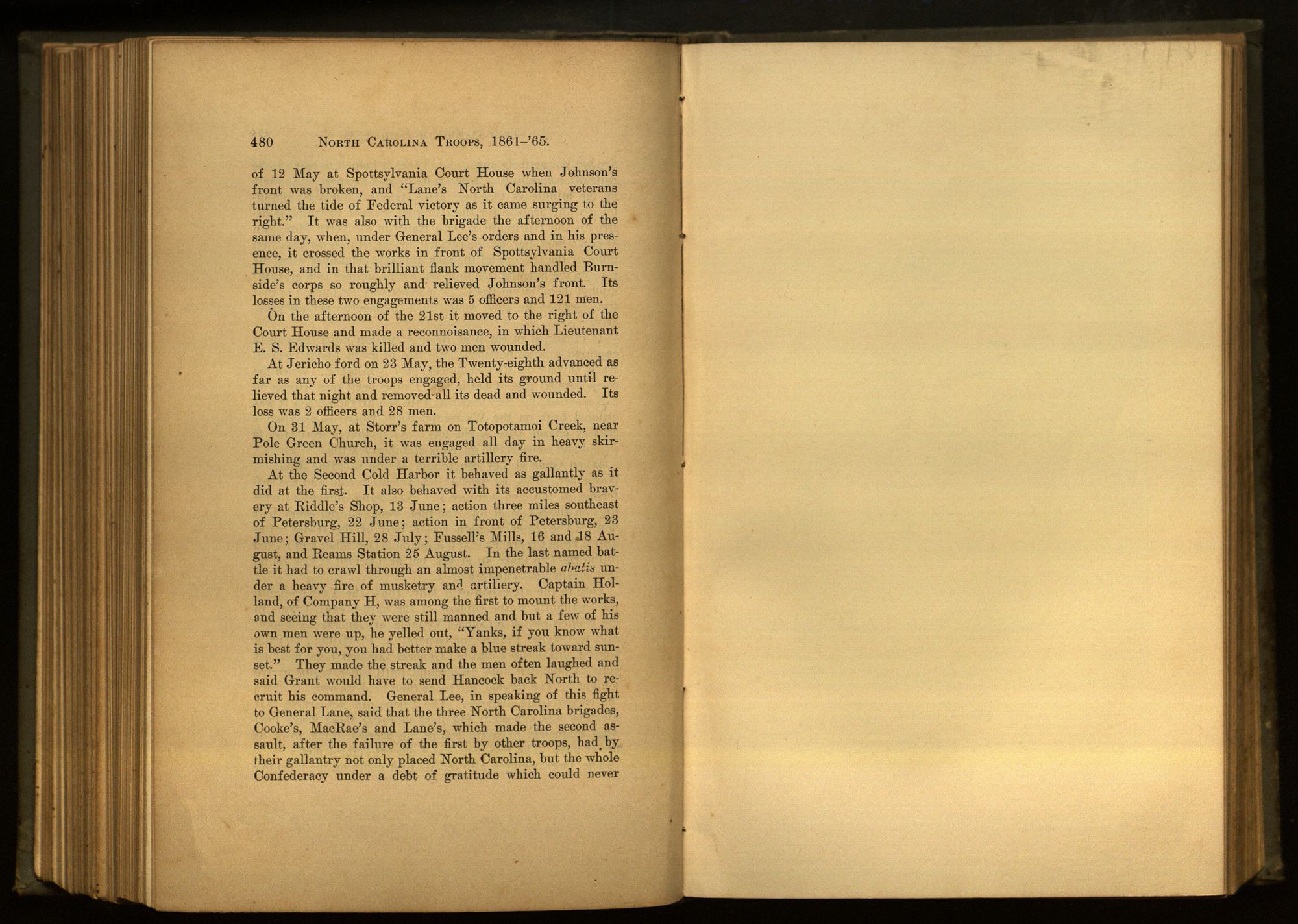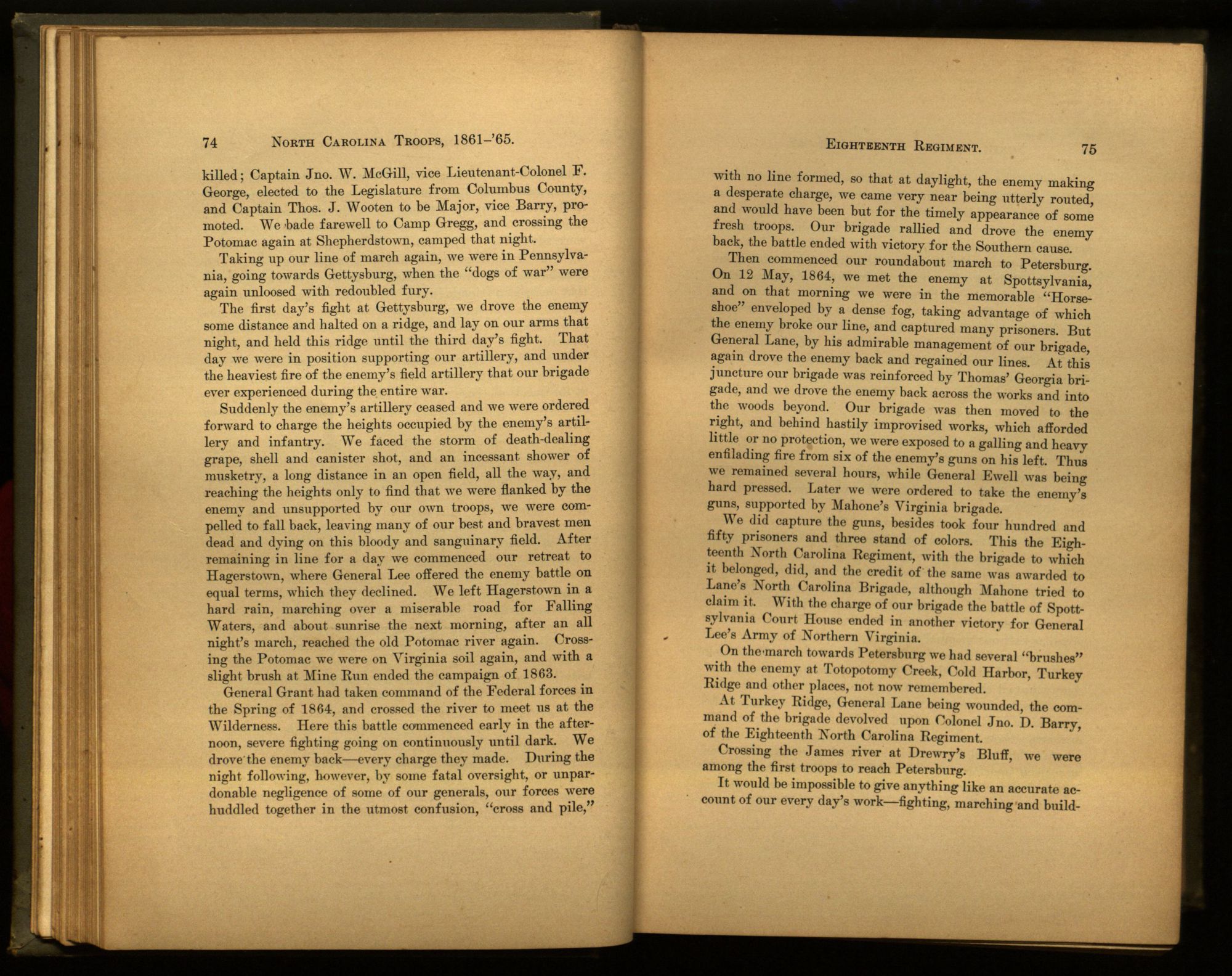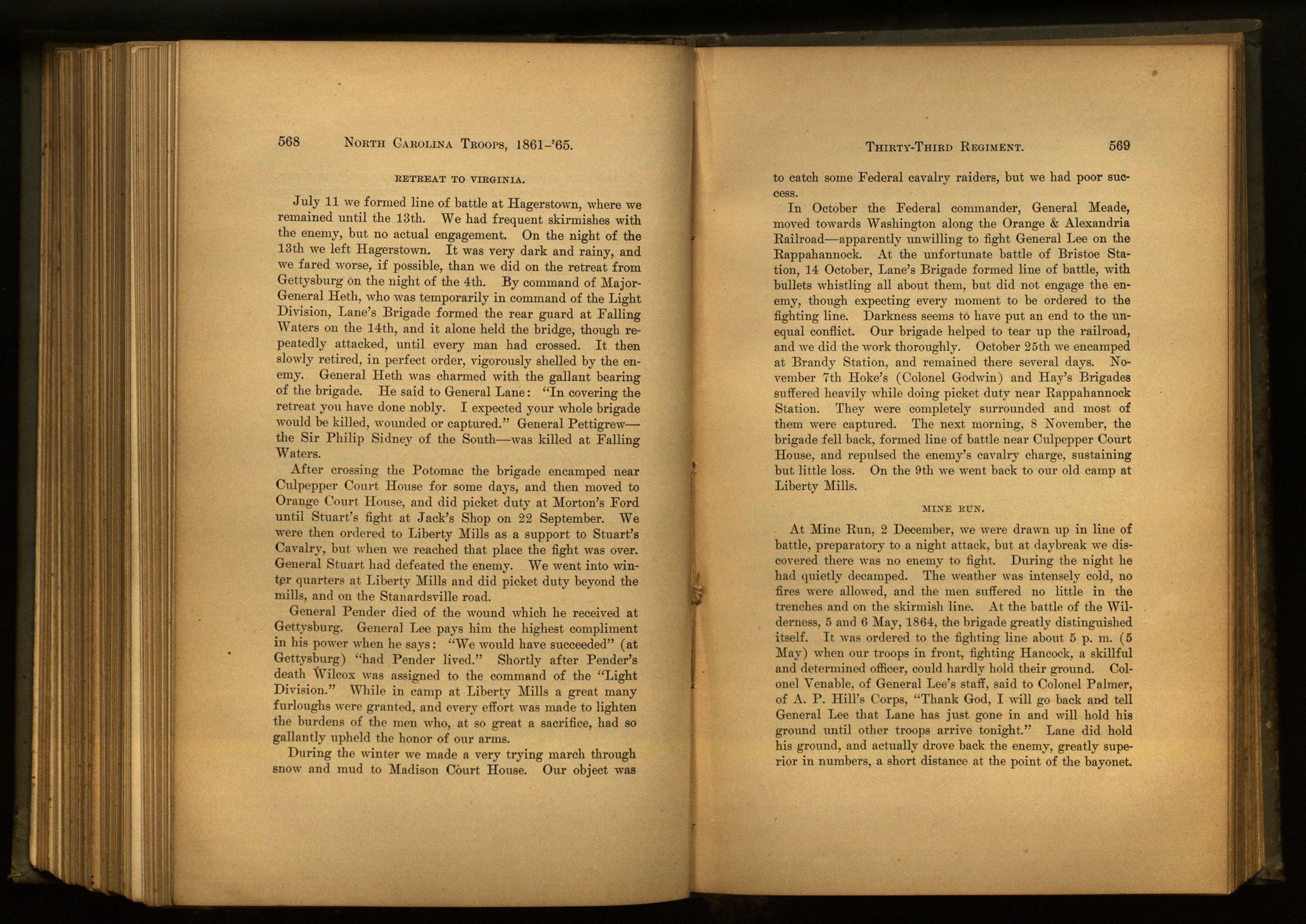 Histories of the several regiments and battalions from North Carolina, in the great war 1861-'65. Written by members of the respective commands. Ed. by Walter Clark. Pub. by the state. Wendell, N.C. (Rte. 2, Box 28A, Wendell 27591) Broadfoot's Bookmark, 1982. 5 v., ill., ports., maps ; 24 cm. Cover title: First at Bethel, farthest to the front at Gettysburg and Chickamauga, last at Appomattox. Spine title: North Carolina regiments, 1861-'65. Reprint. Originally published: [Raleigh, N.C.] : E.M. Uzzell, 1901. Includes indexes.