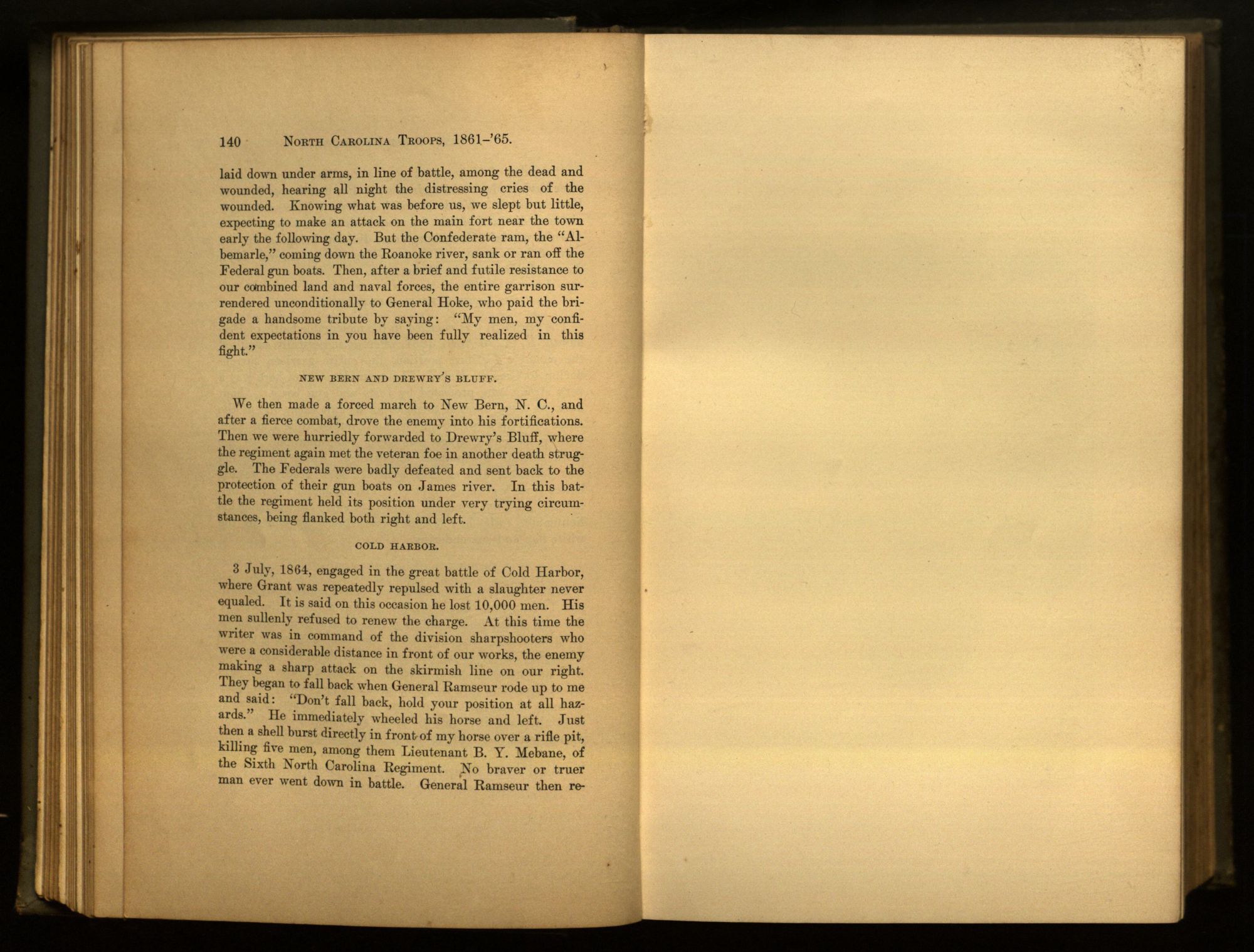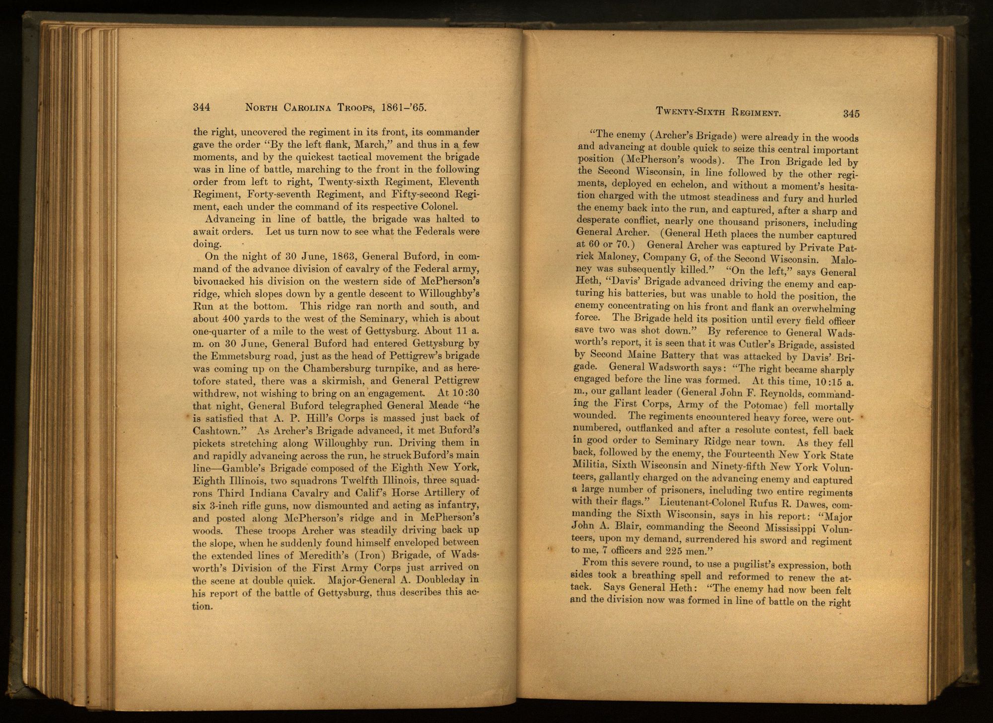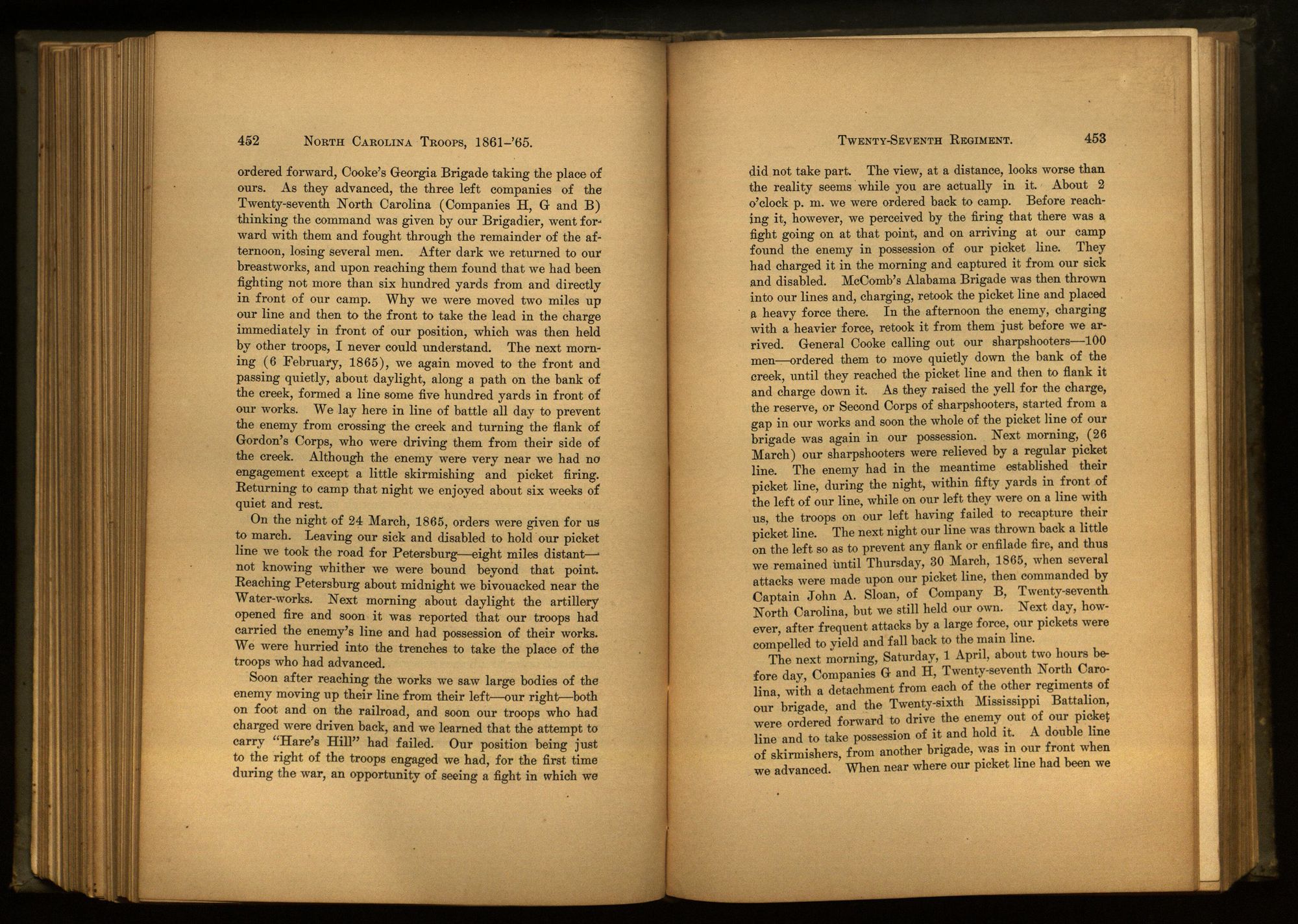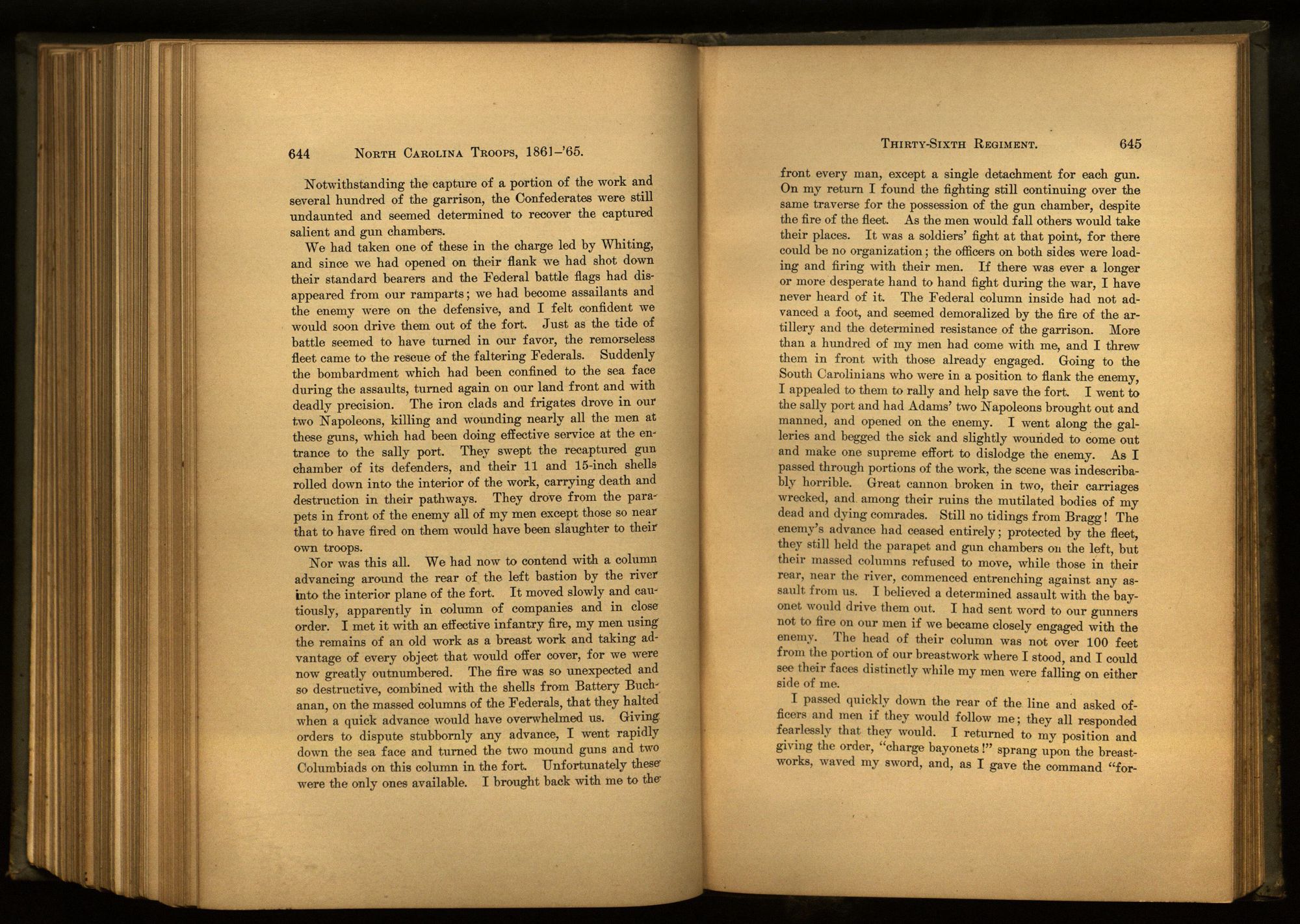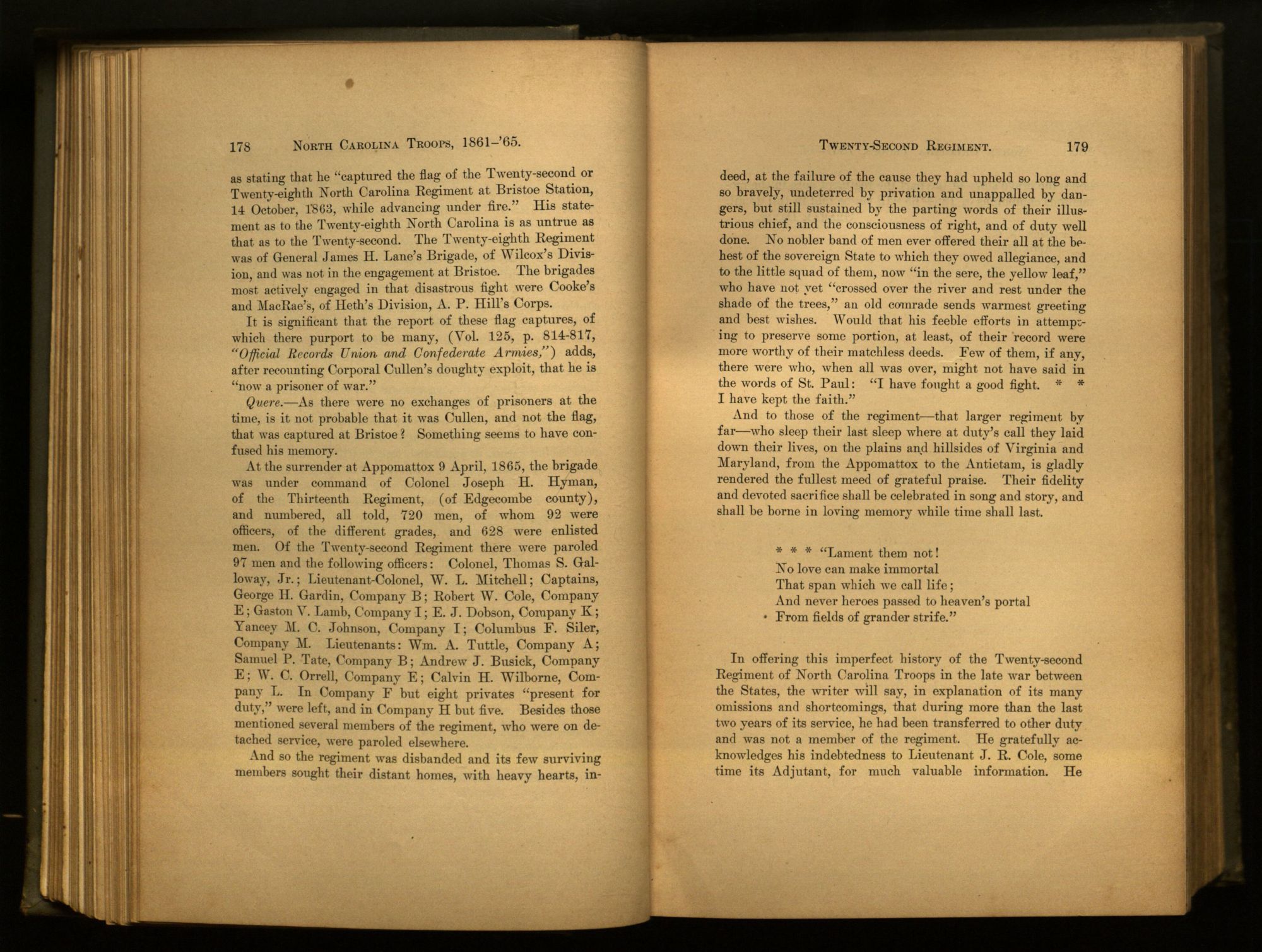 Histories of the several regiments and battalions from North Carolina, in the great war 1861-'65. Written by members of the respective commands. Ed. by Walter Clark. Pub. by the state. Wendell, N.C. (Rte. 2, Box 28A, Wendell 27591) Broadfoot's Bookmark, 1982. 5 v., ill., ports., maps ; 24 cm. Cover title: First at Bethel, farthest to the front at Gettysburg and Chickamauga, last at Appomattox. Spine title: North Carolina regiments, 1861-'65. Reprint. Originally published: [Raleigh, N.C.] : E.M. Uzzell, 1901. Includes indexes.