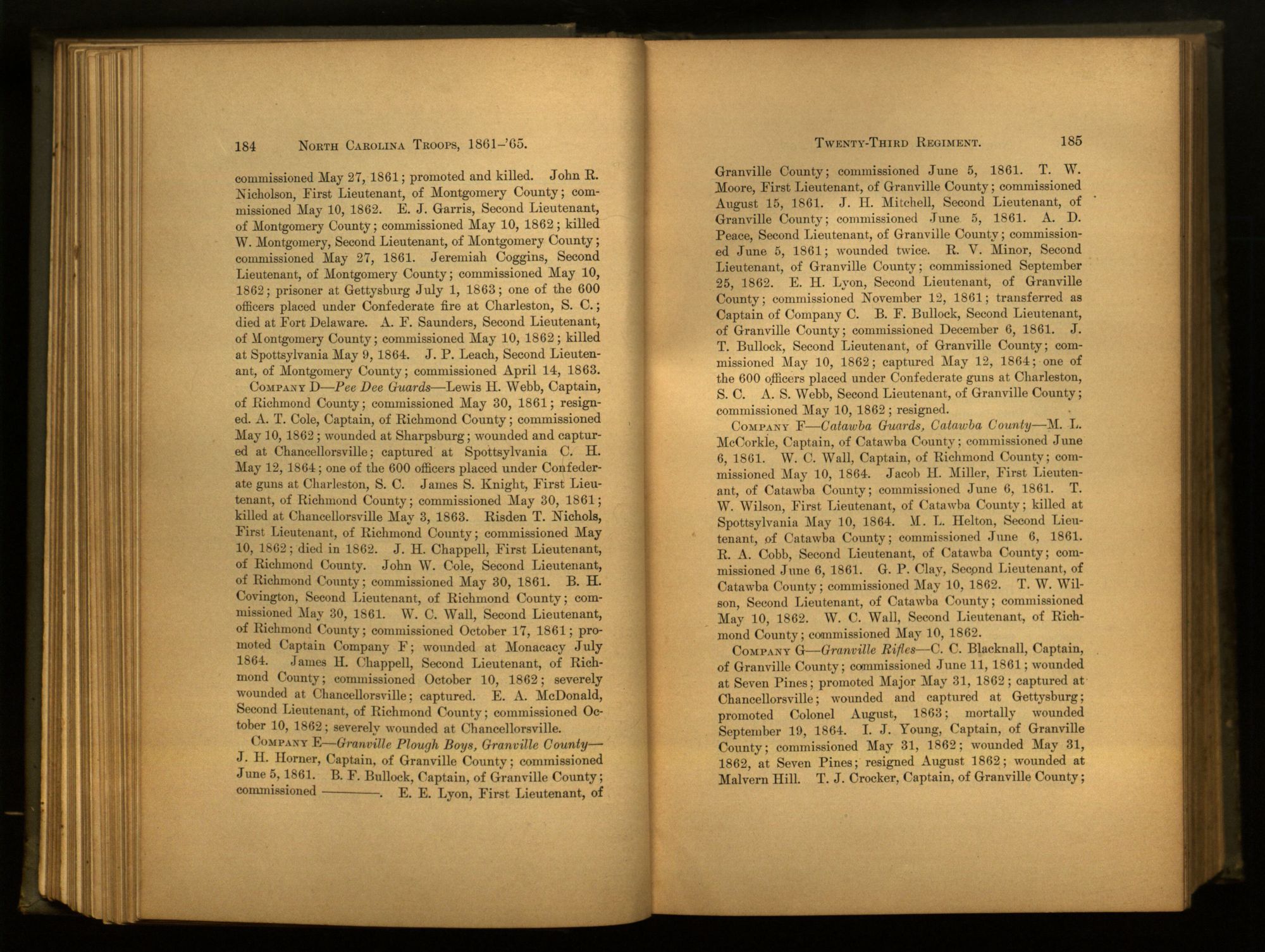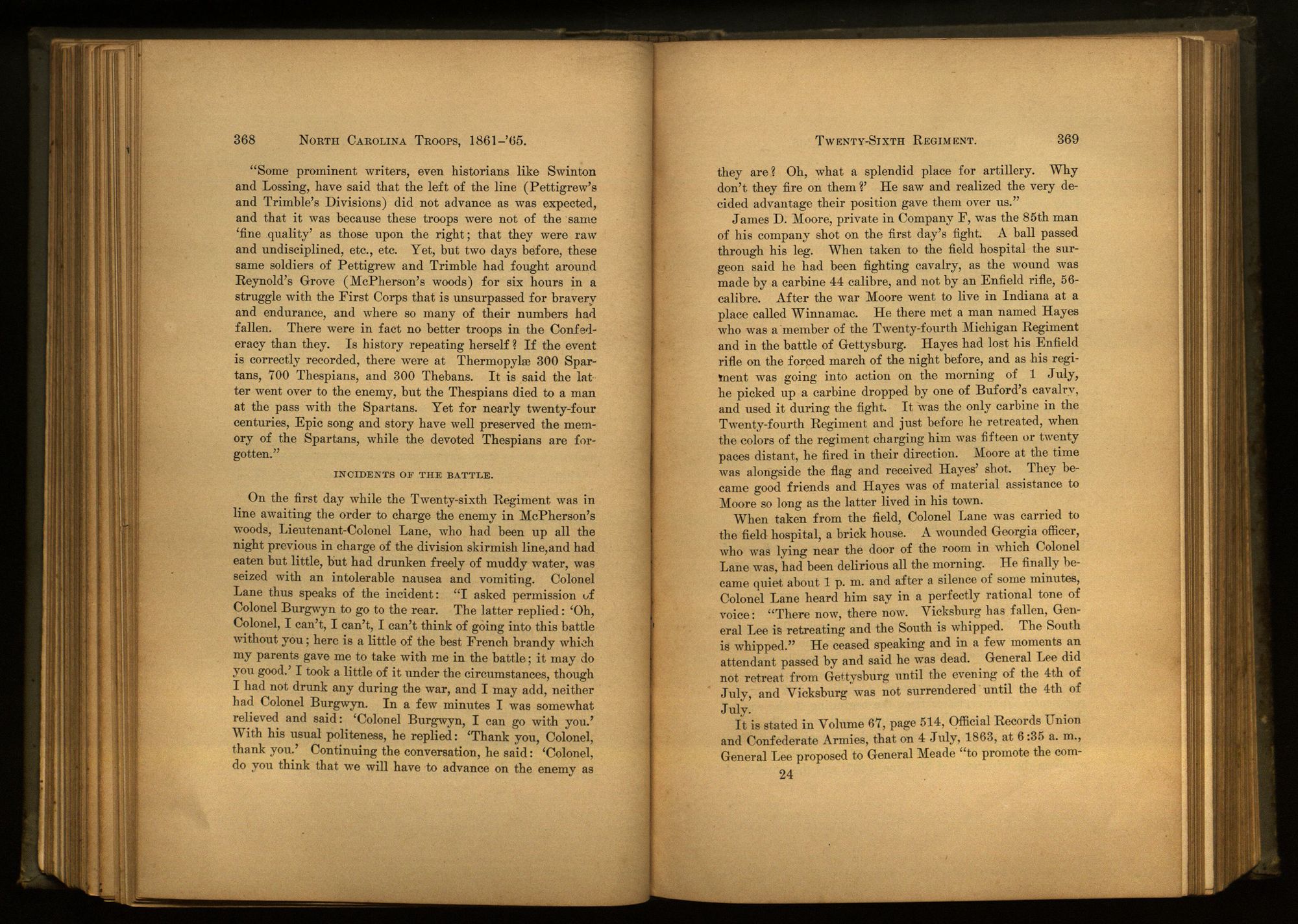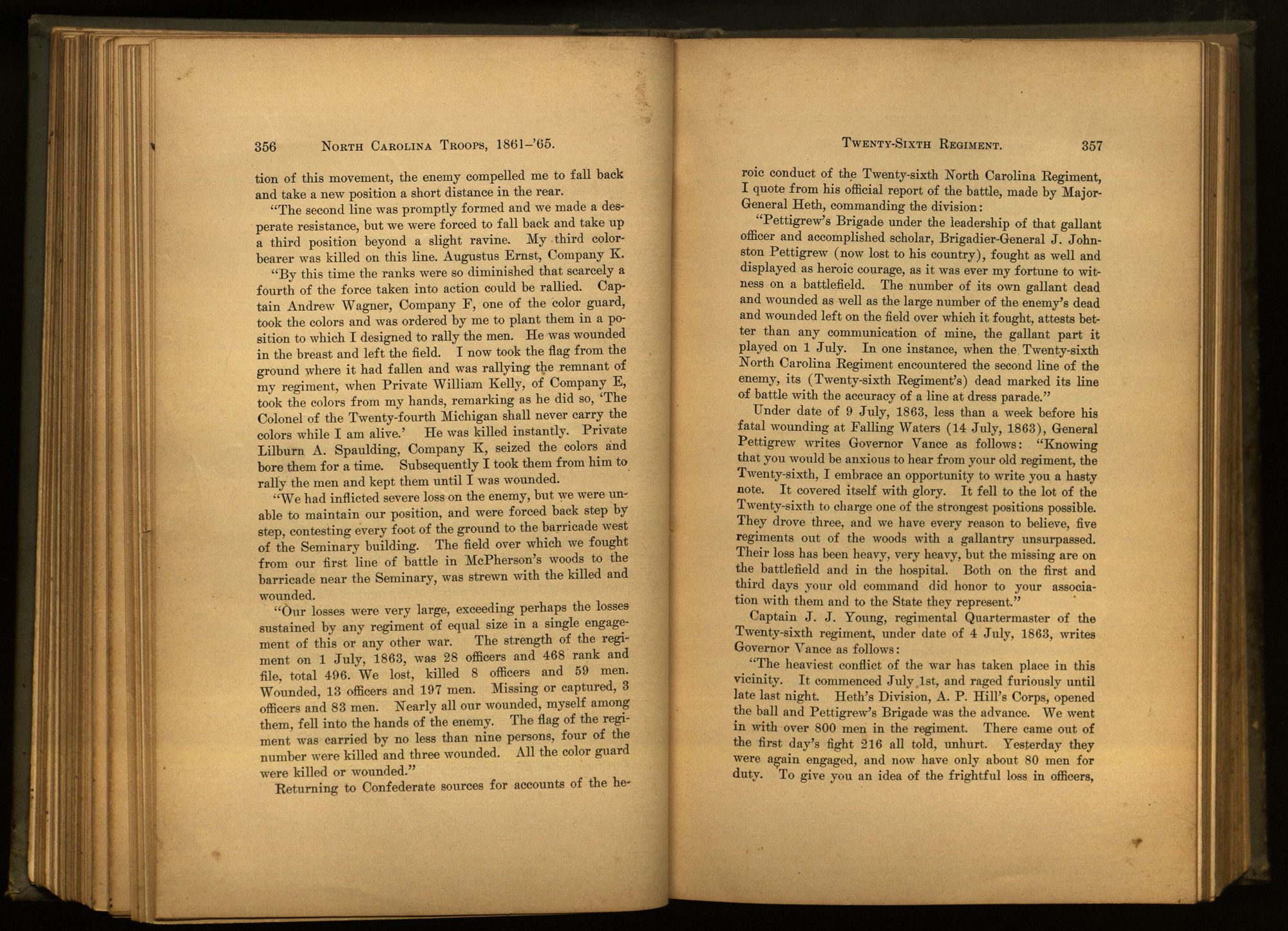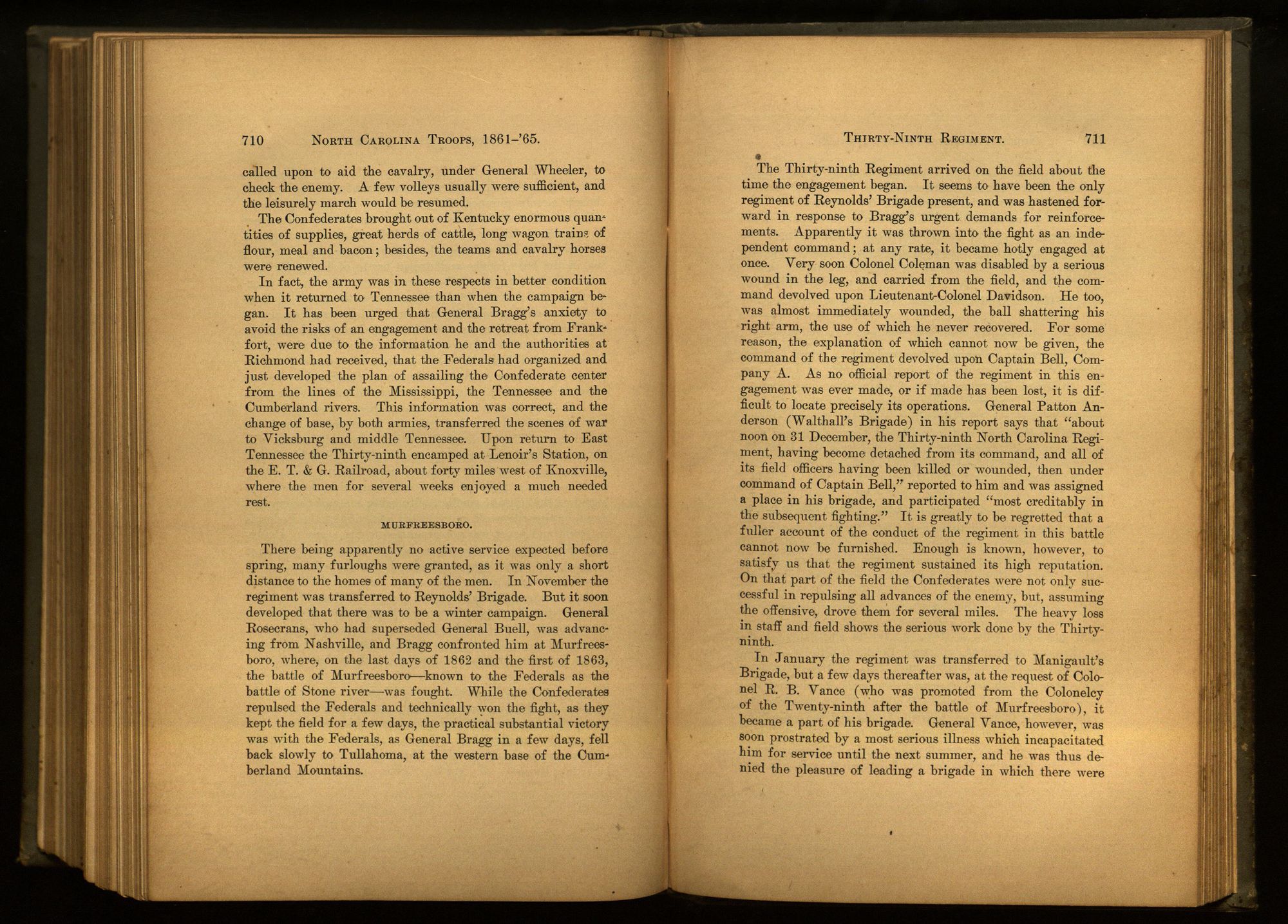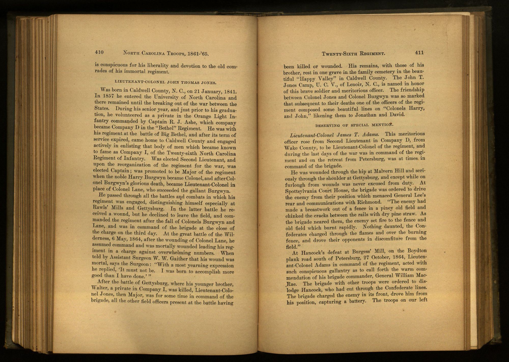 Histories of the several regiments and battalions from North Carolina, in the great war 1861-'65. Written by members of the respective commands. Ed. by Walter Clark. Pub. by the state. Wendell, N.C. (Rte. 2, Box 28A, Wendell 27591) Broadfoot's Bookmark, 1982. 5 v., ill., ports., maps ; 24 cm. Cover title: First at Bethel, farthest to the front at Gettysburg and Chickamauga, last at Appomattox. Spine title: North Carolina regiments, 1861-'65. Reprint. Originally published: [Raleigh, N.C.] : E.M. Uzzell, 1901. Includes indexes.