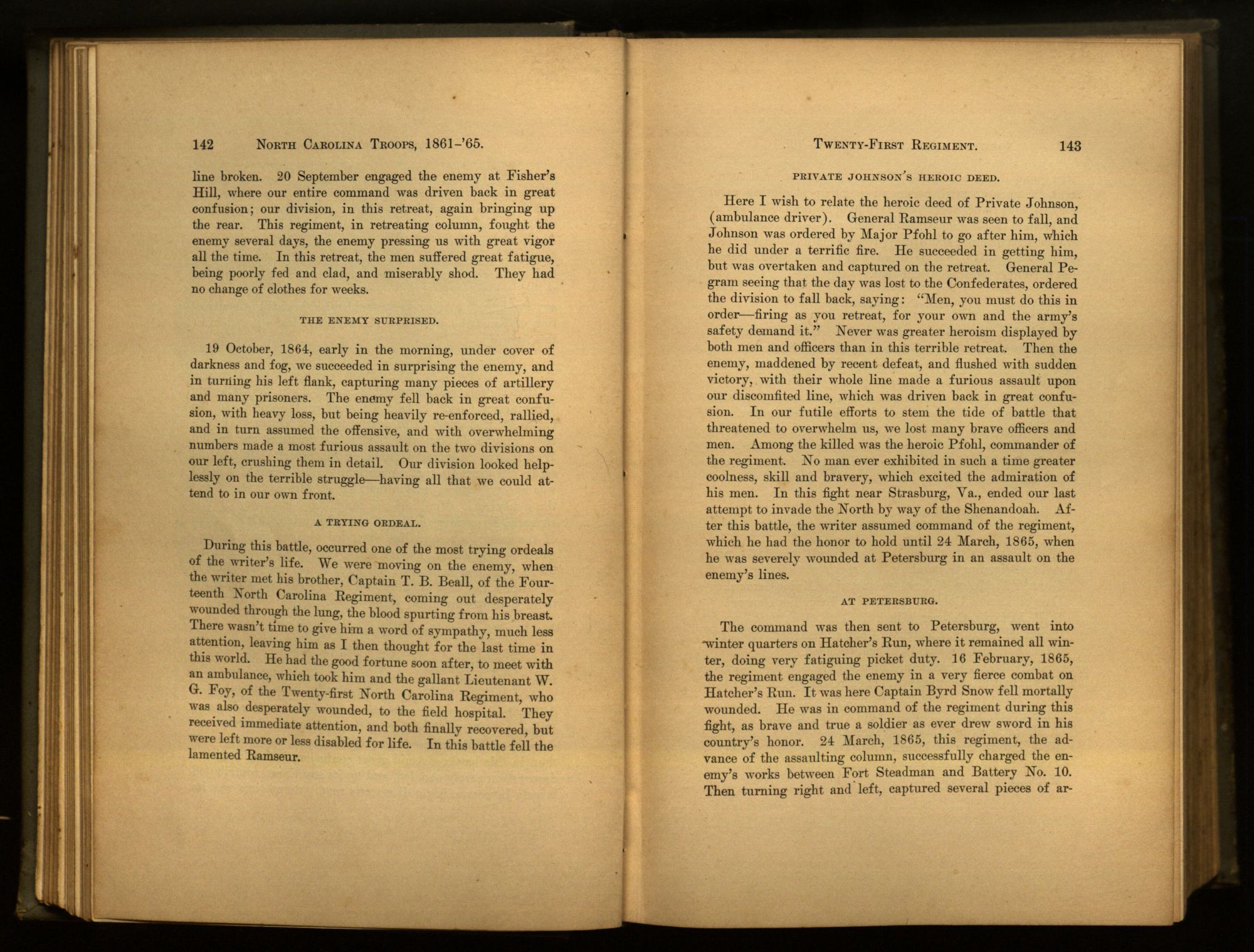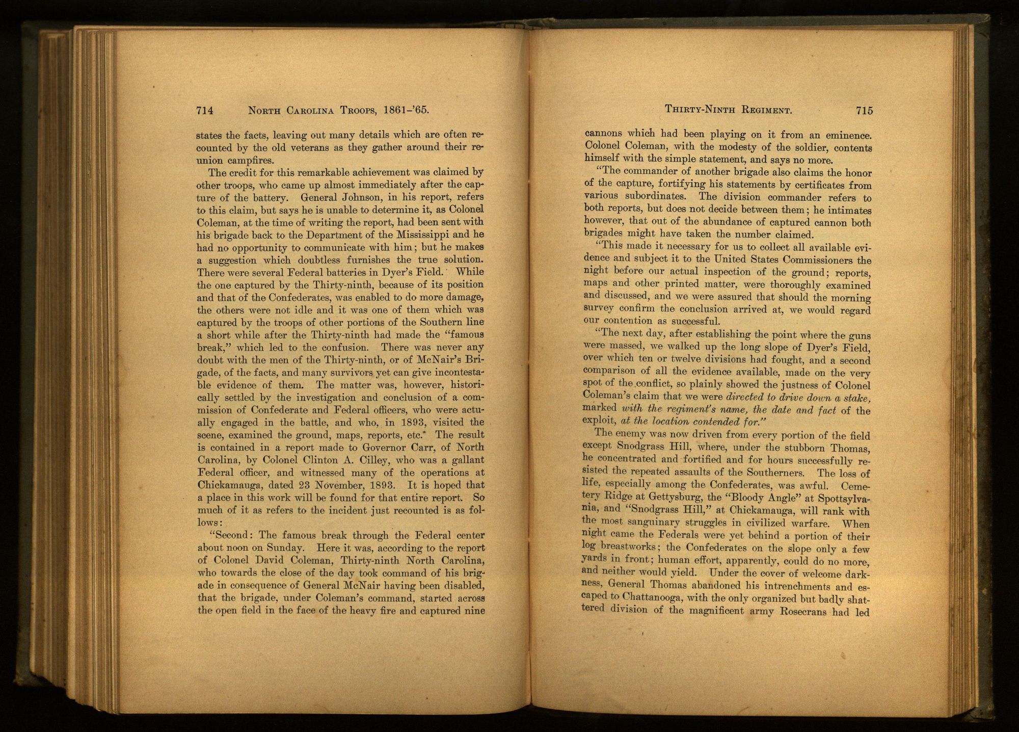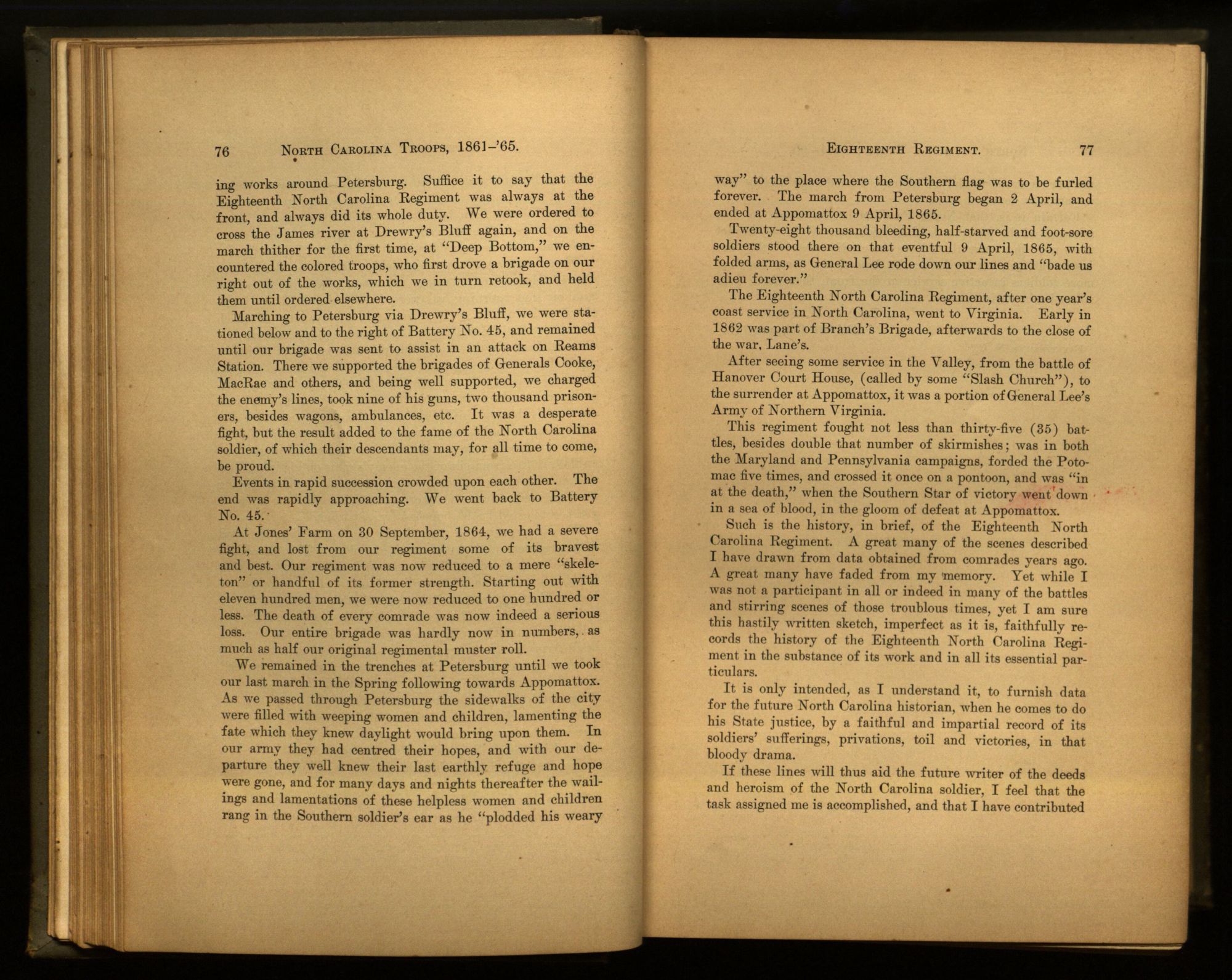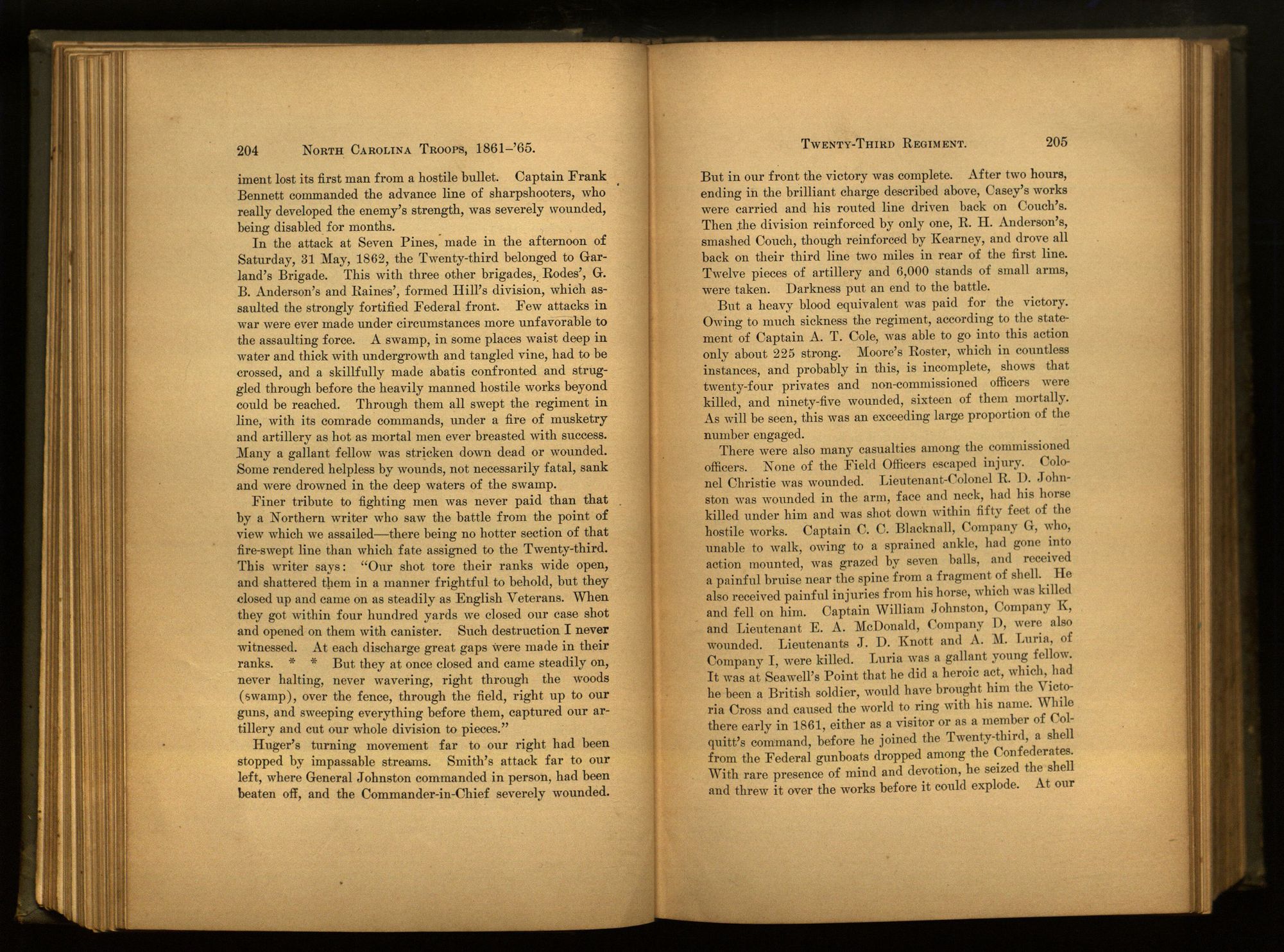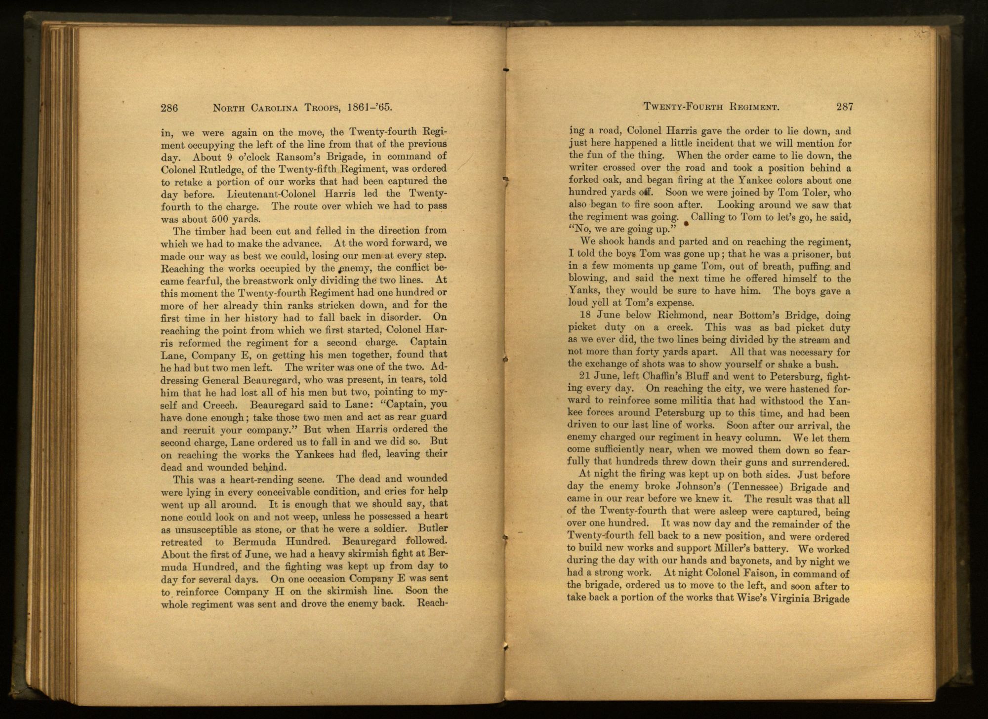 Histories of the several regiments and battalions from North Carolina, in the great war 1861-'65. Written by members of the respective commands. Ed. by Walter Clark. Pub. by the state. Wendell, N.C. (Rte. 2, Box 28A, Wendell 27591) Broadfoot's Bookmark, 1982. 5 v., ill., ports., maps ; 24 cm. Cover title: First at Bethel, farthest to the front at Gettysburg and Chickamauga, last at Appomattox. Spine title: North Carolina regiments, 1861-'65. Reprint. Originally published: [Raleigh, N.C.] : E.M. Uzzell, 1901. Includes indexes.