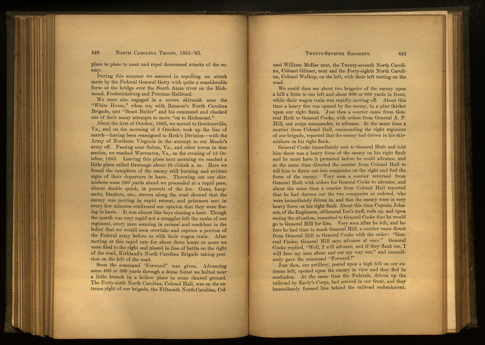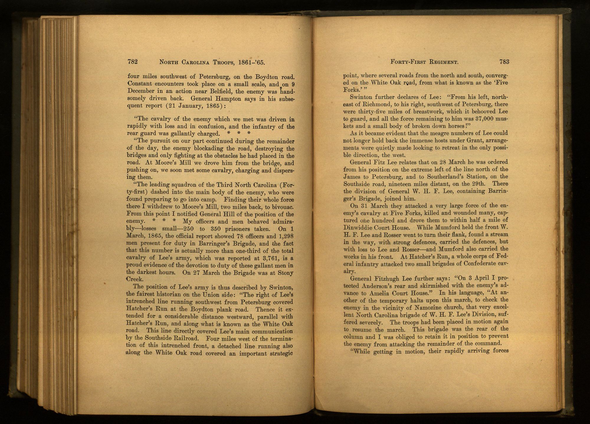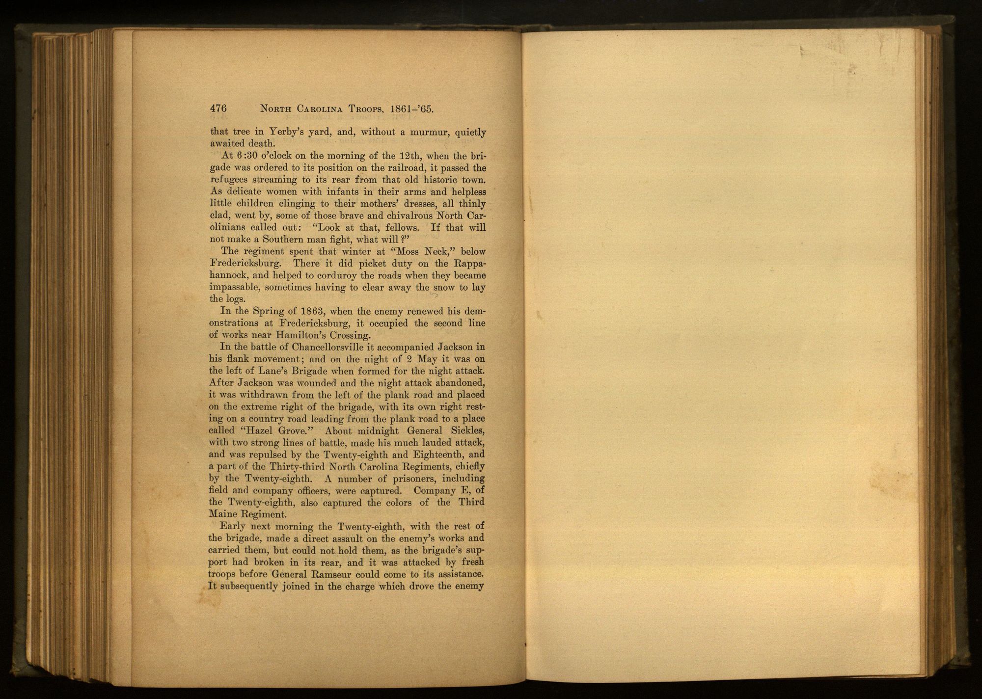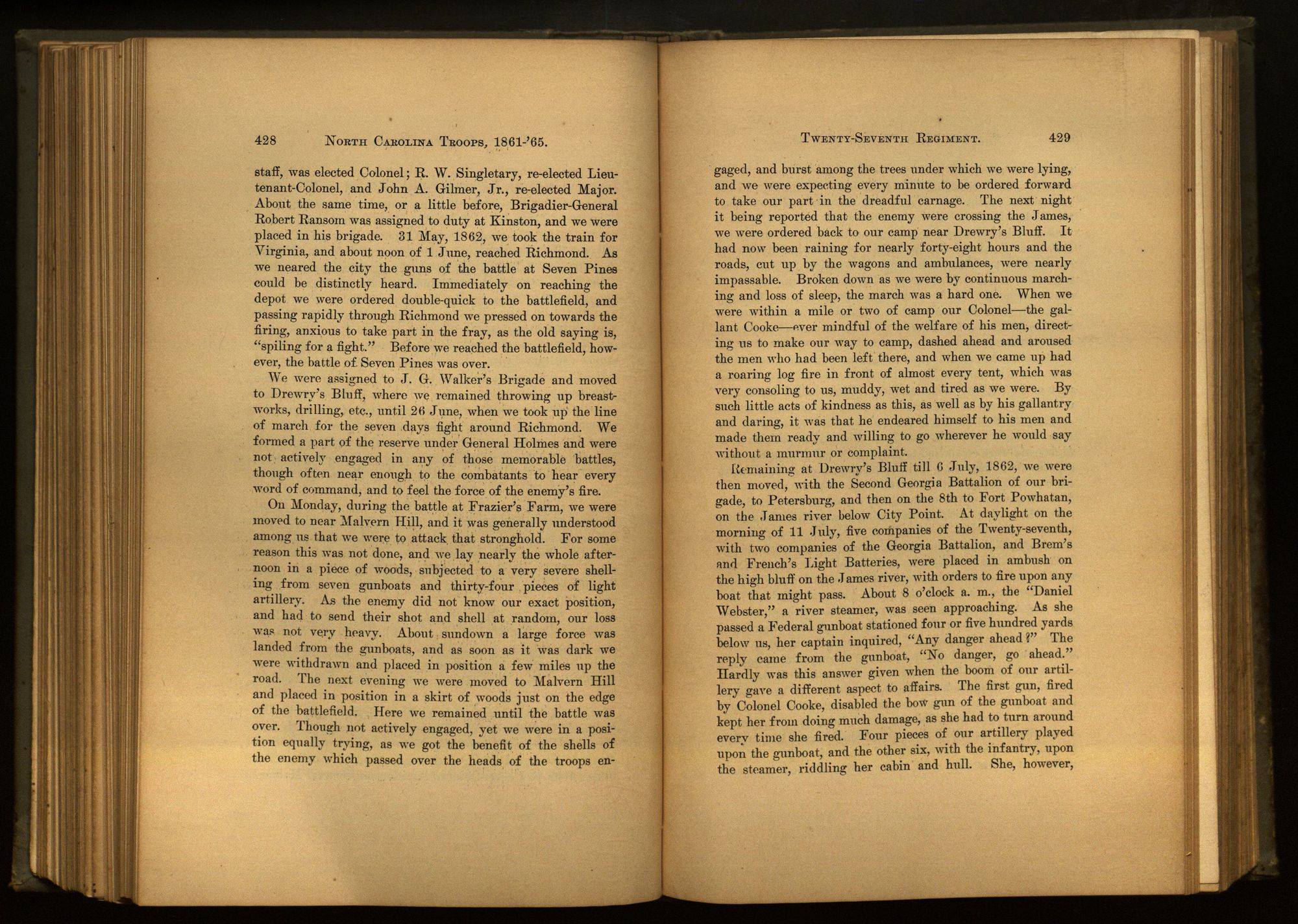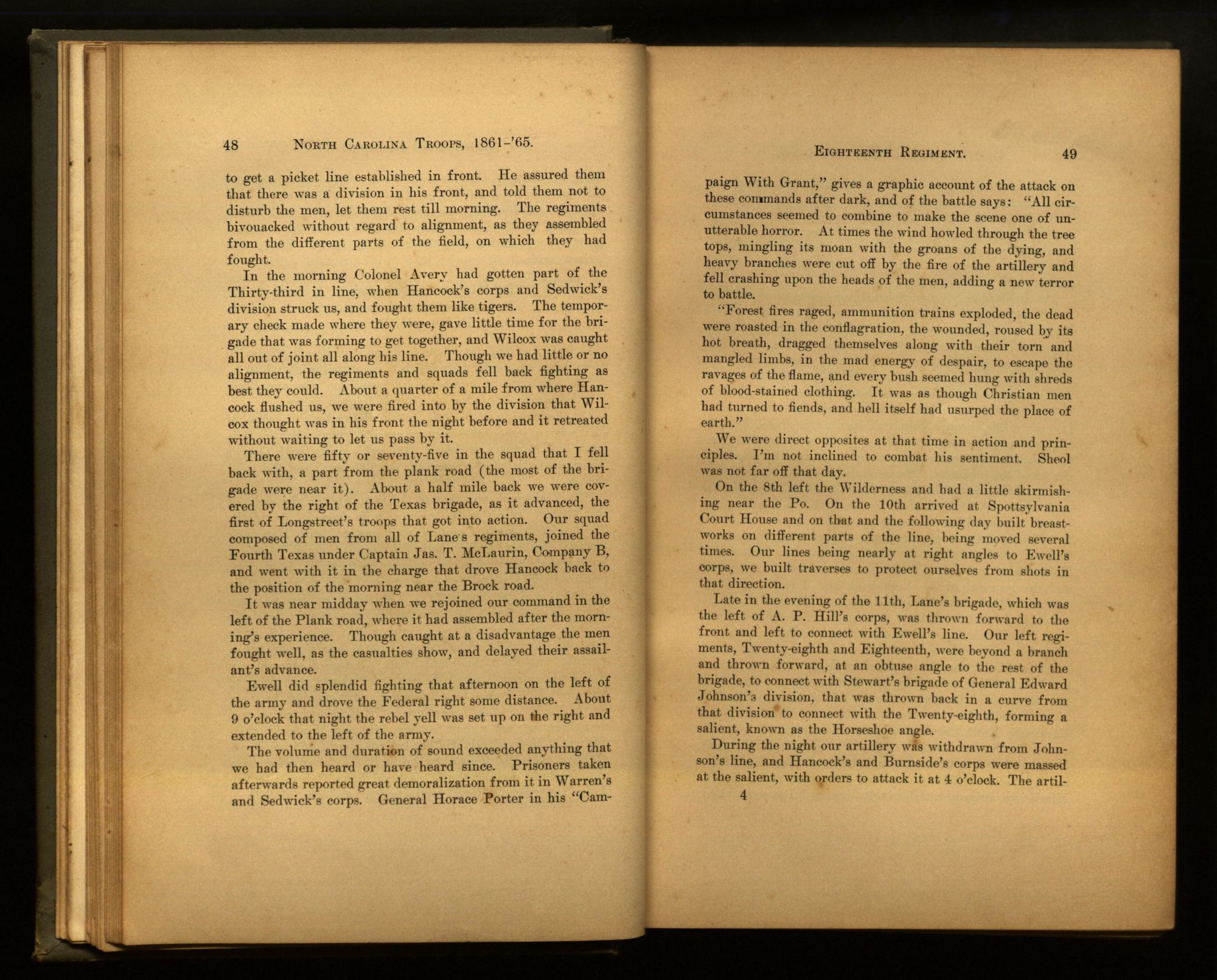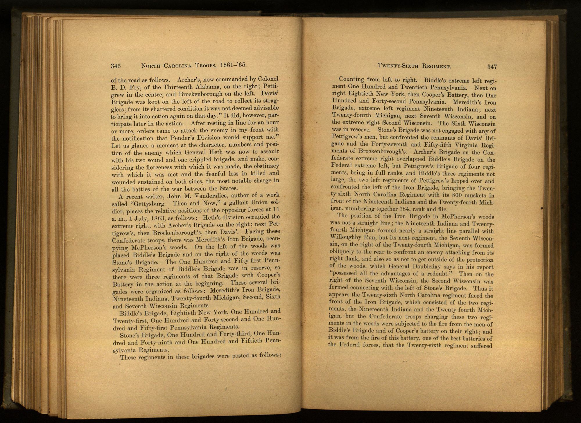 Histories of the several regiments and battalions from North Carolina, in the great war 1861-'65. Written by members of the respective commands. Ed. by Walter Clark. Pub. by the state. Wendell, N.C. (Rte. 2, Box 28A, Wendell 27591) Broadfoot's Bookmark, 1982. 5 v., ill., ports., maps ; 24 cm. Cover title: First at Bethel, farthest to the front at Gettysburg and Chickamauga, last at Appomattox. Spine title: North Carolina regiments, 1861-'65. Reprint. Originally published: [Raleigh, N.C.] : E.M. Uzzell, 1901. Includes indexes.