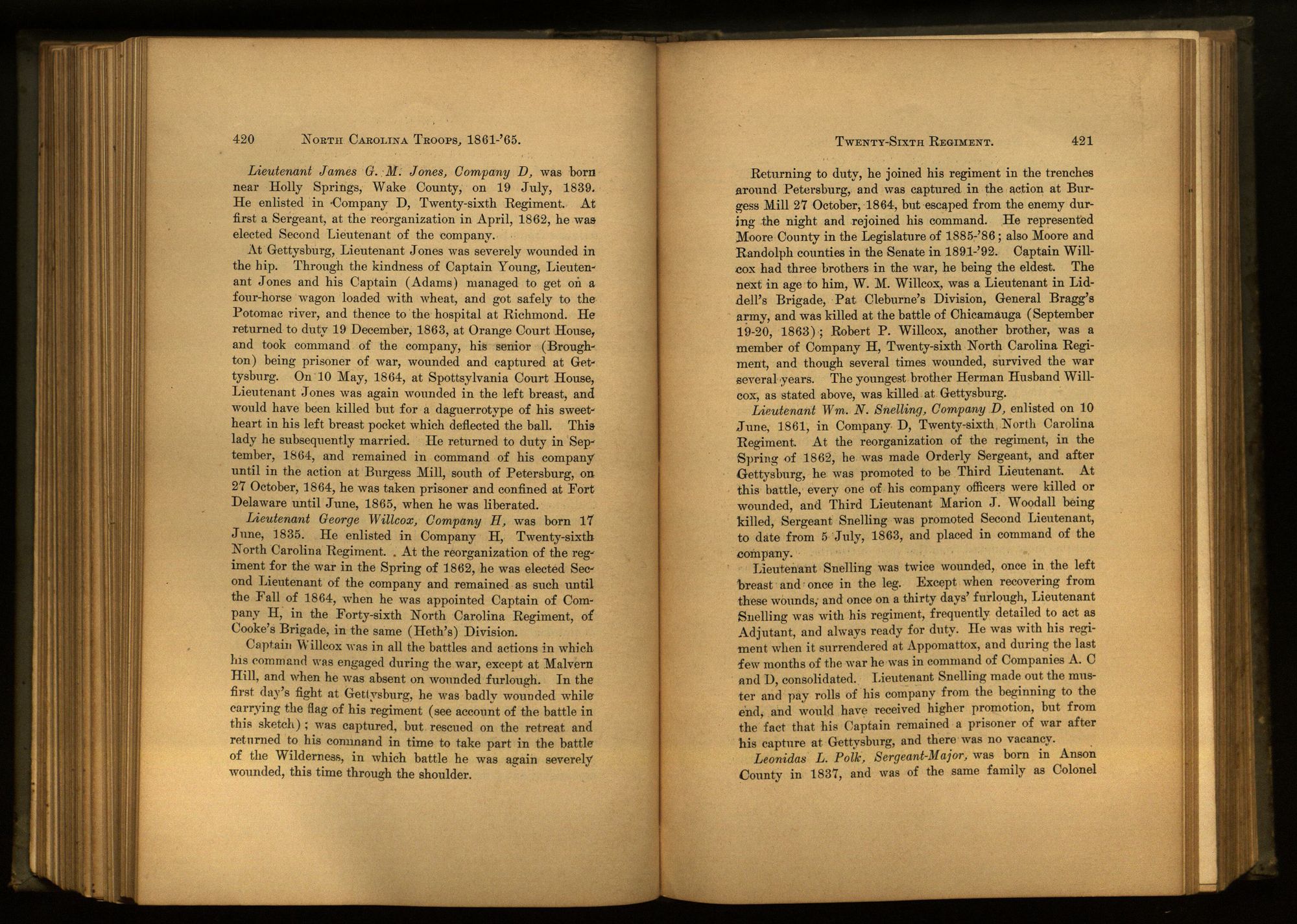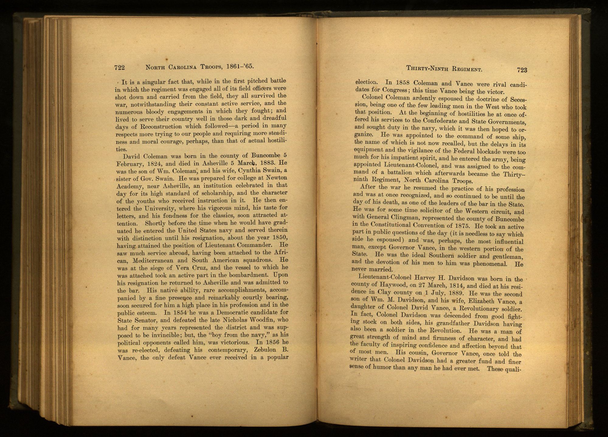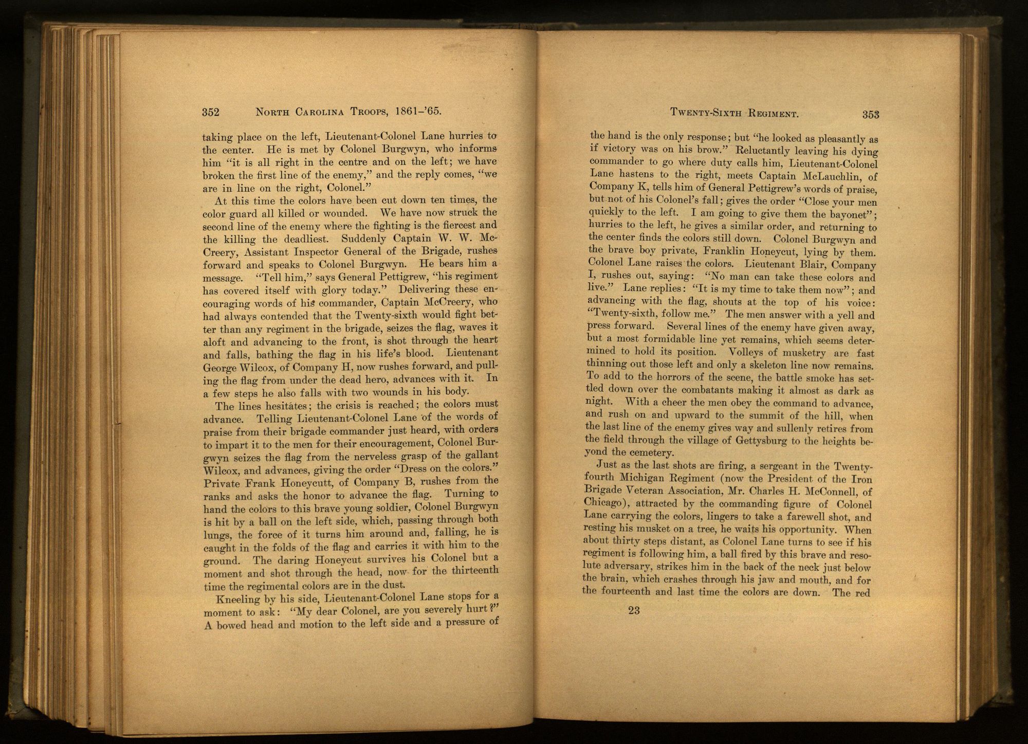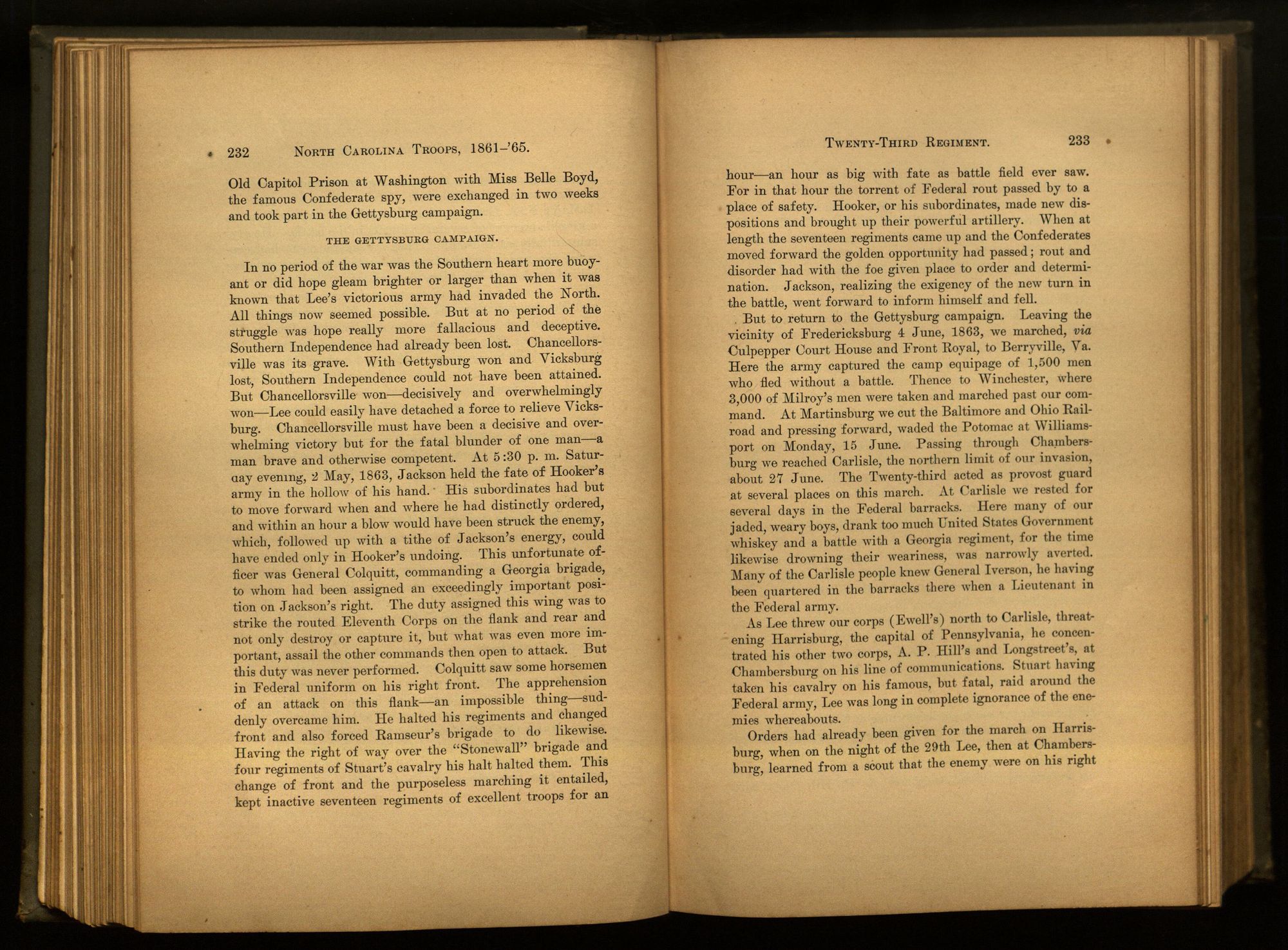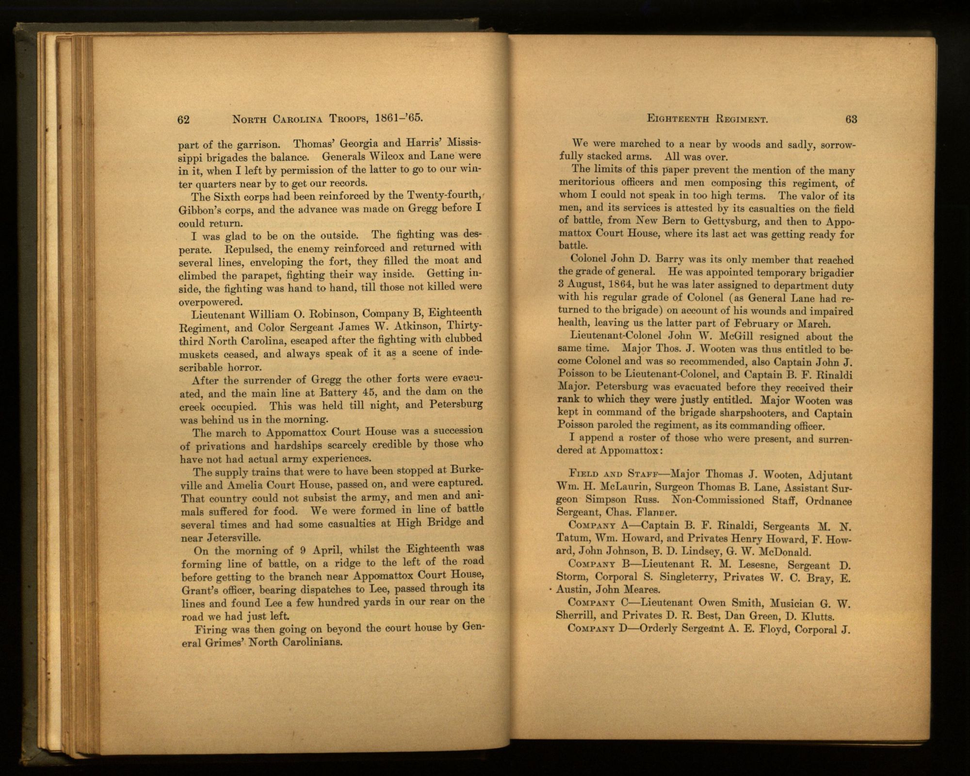 Histories of the several regiments and battalions from North Carolina, in the great war 1861-'65. Written by members of the respective commands. Ed. by Walter Clark. Pub. by the state. Wendell, N.C. (Rte. 2, Box 28A, Wendell 27591) Broadfoot's Bookmark, 1982. 5 v., ill., ports., maps ; 24 cm. Cover title: First at Bethel, farthest to the front at Gettysburg and Chickamauga, last at Appomattox. Spine title: North Carolina regiments, 1861-'65. Reprint. Originally published: [Raleigh, N.C.] : E.M. Uzzell, 1901. Includes indexes.