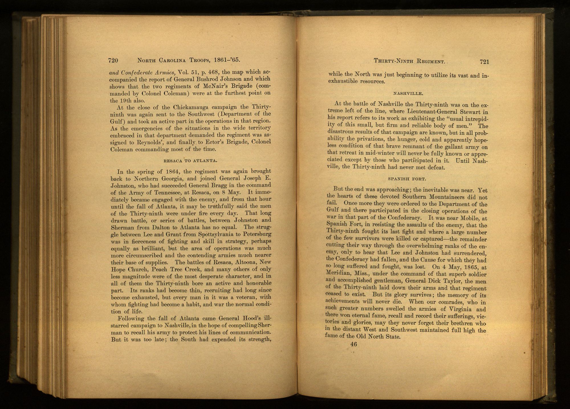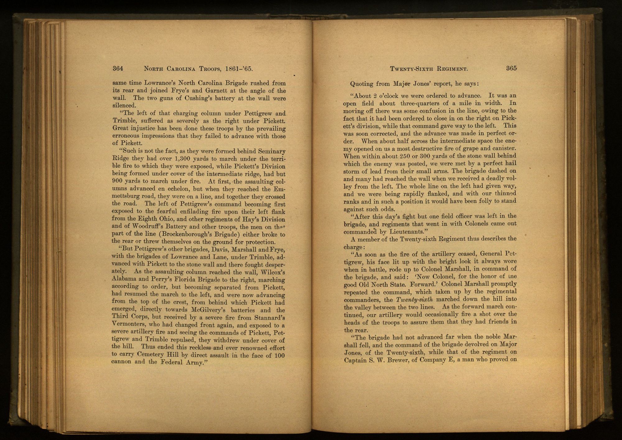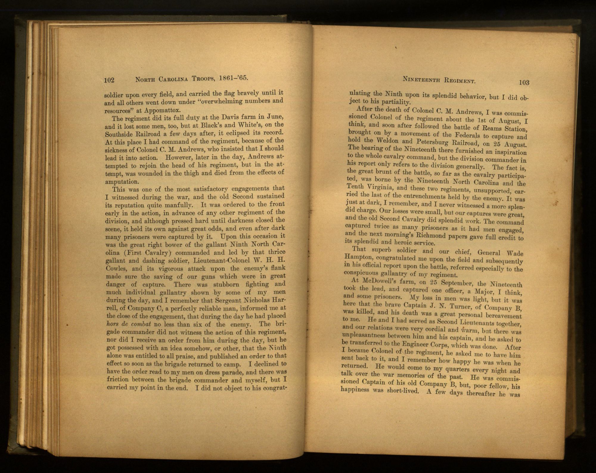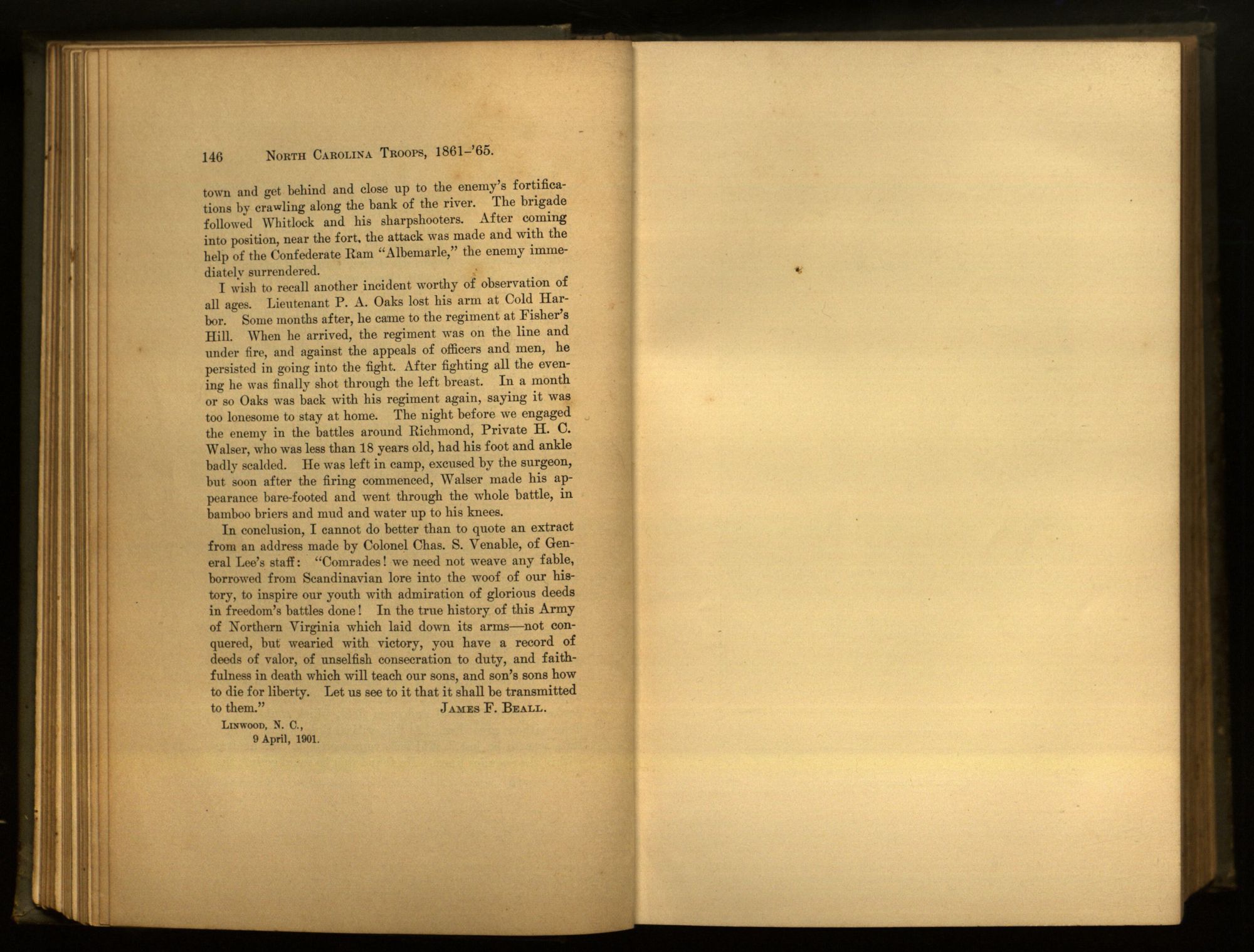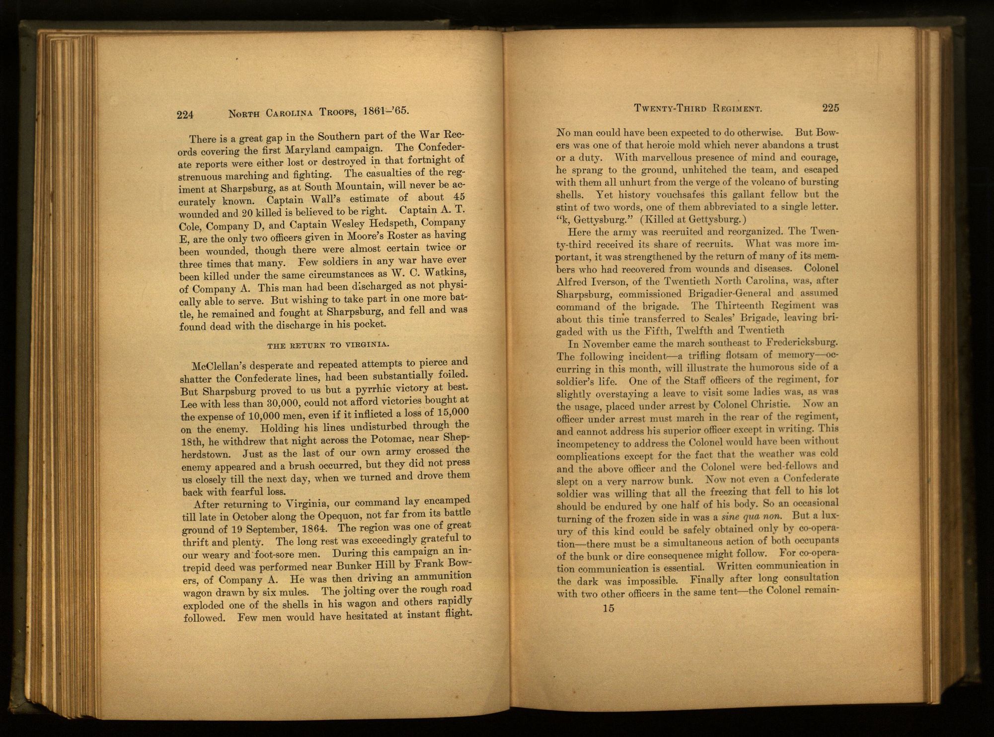 Histories of the several regiments and battalions from North Carolina, in the great war 1861-'65. Written by members of the respective commands. Ed. by Walter Clark. Pub. by the state. Wendell, N.C. (Rte. 2, Box 28A, Wendell 27591) Broadfoot's Bookmark, 1982. 5 v., ill., ports., maps ; 24 cm. Cover title: First at Bethel, farthest to the front at Gettysburg and Chickamauga, last at Appomattox. Spine title: North Carolina regiments, 1861-'65. Reprint. Originally published: [Raleigh, N.C.] : E.M. Uzzell, 1901. Includes indexes.