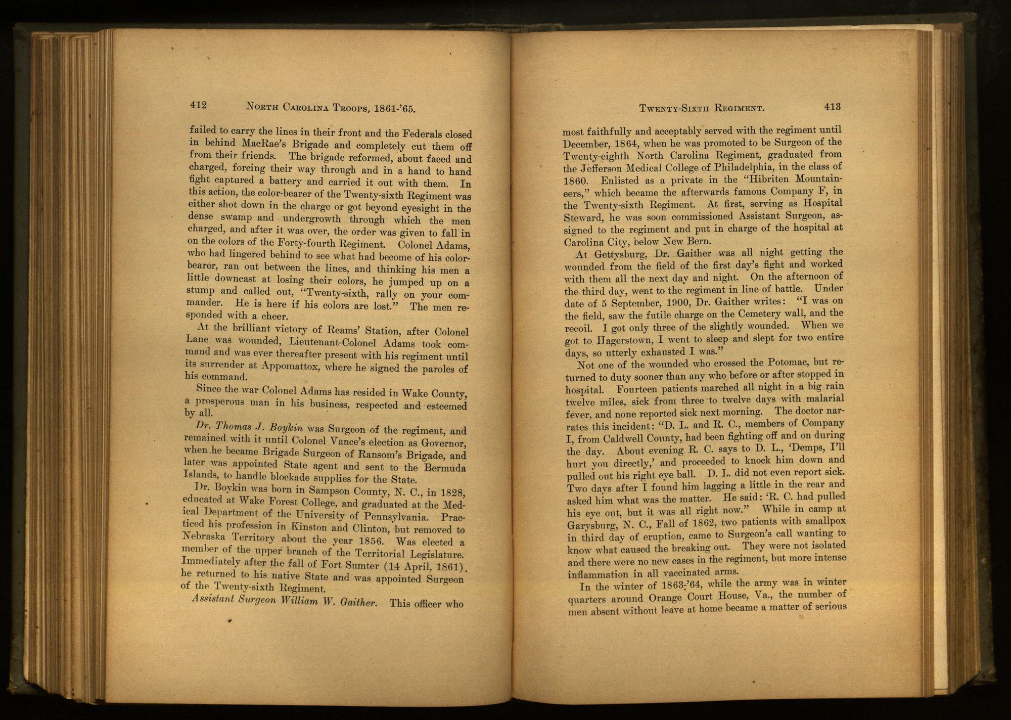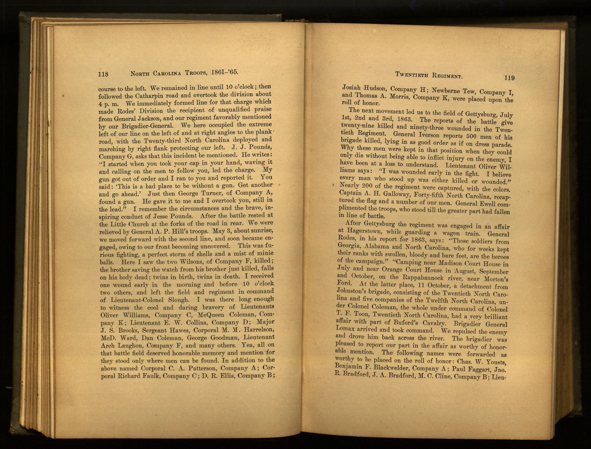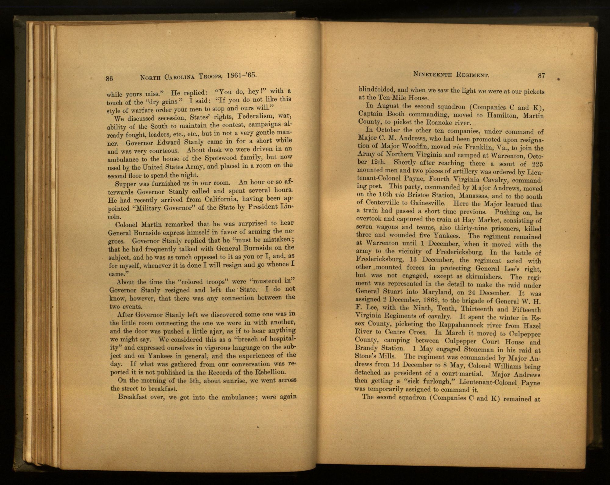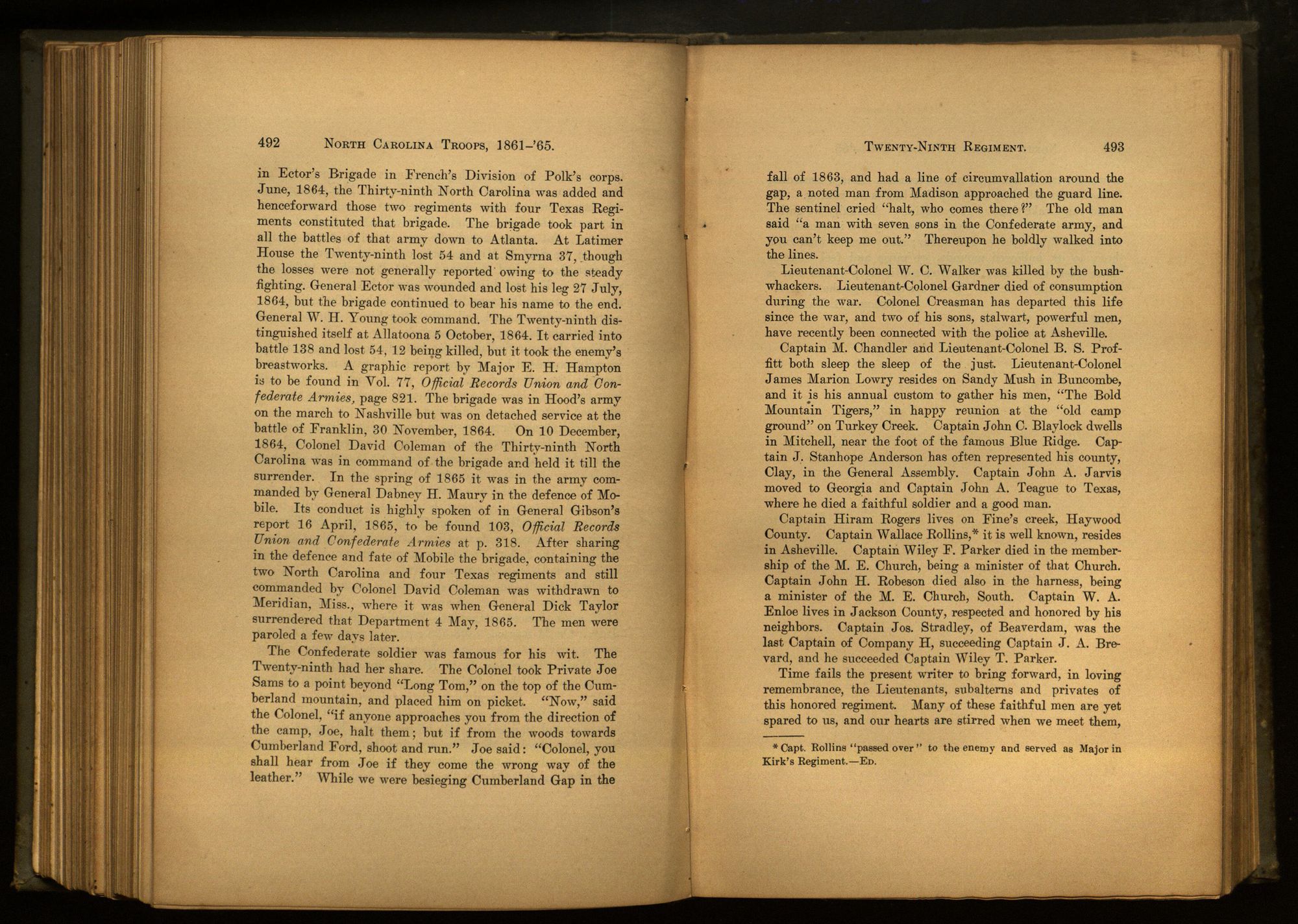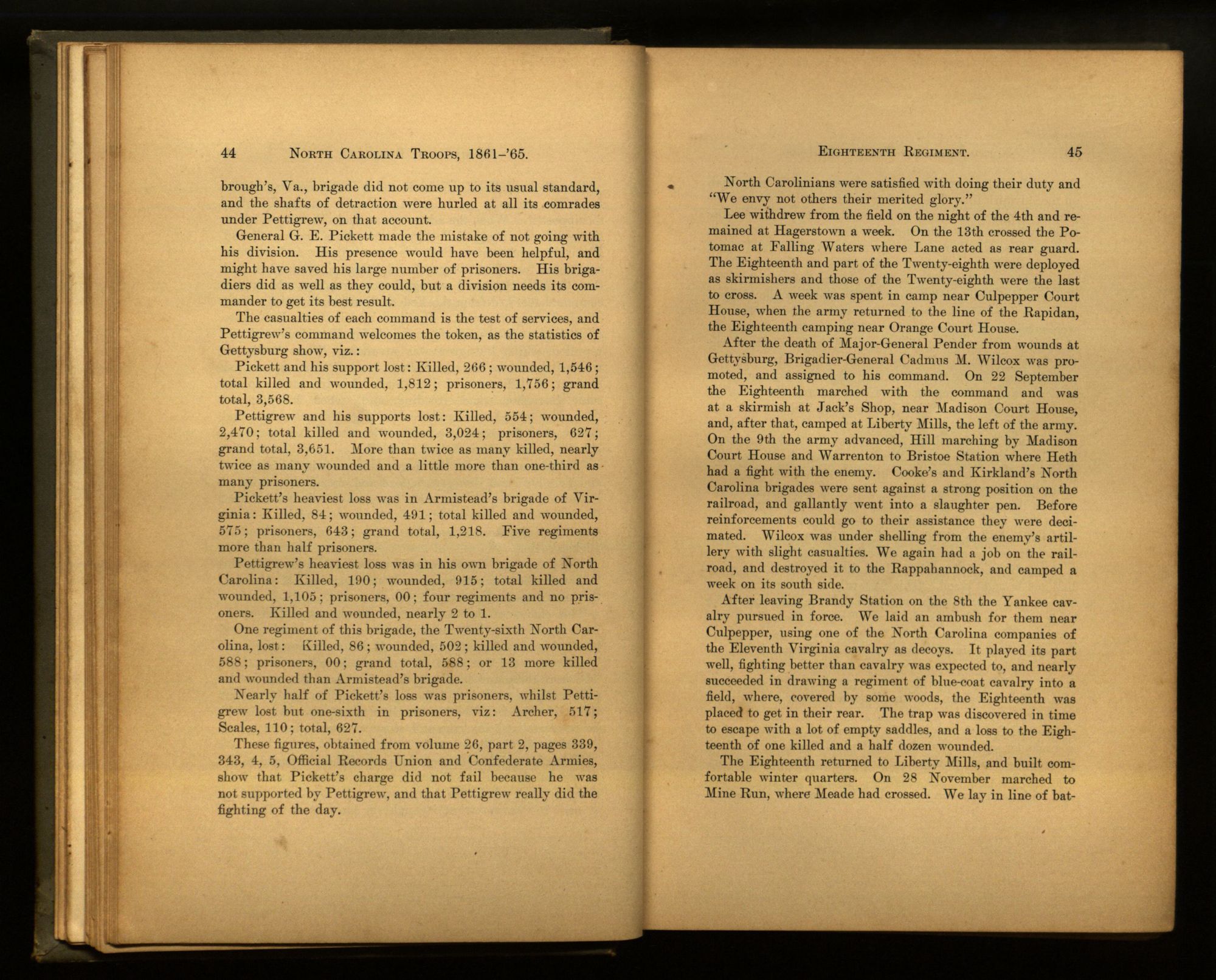 Histories of the several regiments and battalions from North Carolina, in the great war 1861-'65. Written by members of the respective commands. Ed. by Walter Clark. Pub. by the state. Wendell, N.C. (Rte. 2, Box 28A, Wendell 27591) Broadfoot's Bookmark, 1982. 5 v., ill., ports., maps ; 24 cm. Cover title: First at Bethel, farthest to the front at Gettysburg and Chickamauga, last at Appomattox. Spine title: North Carolina regiments, 1861-'65. Reprint. Originally published: [Raleigh, N.C.] : E.M. Uzzell, 1901. Includes indexes.