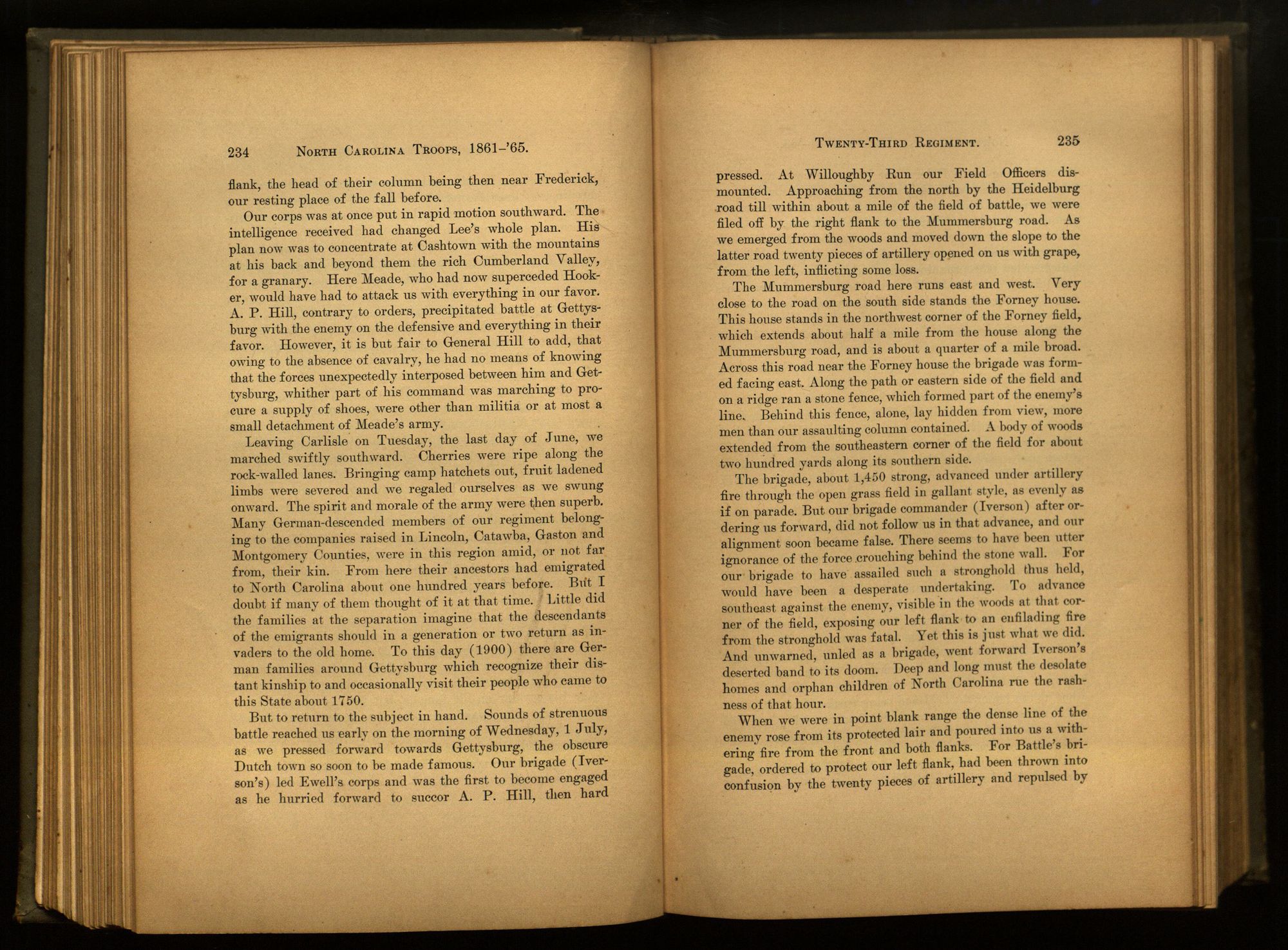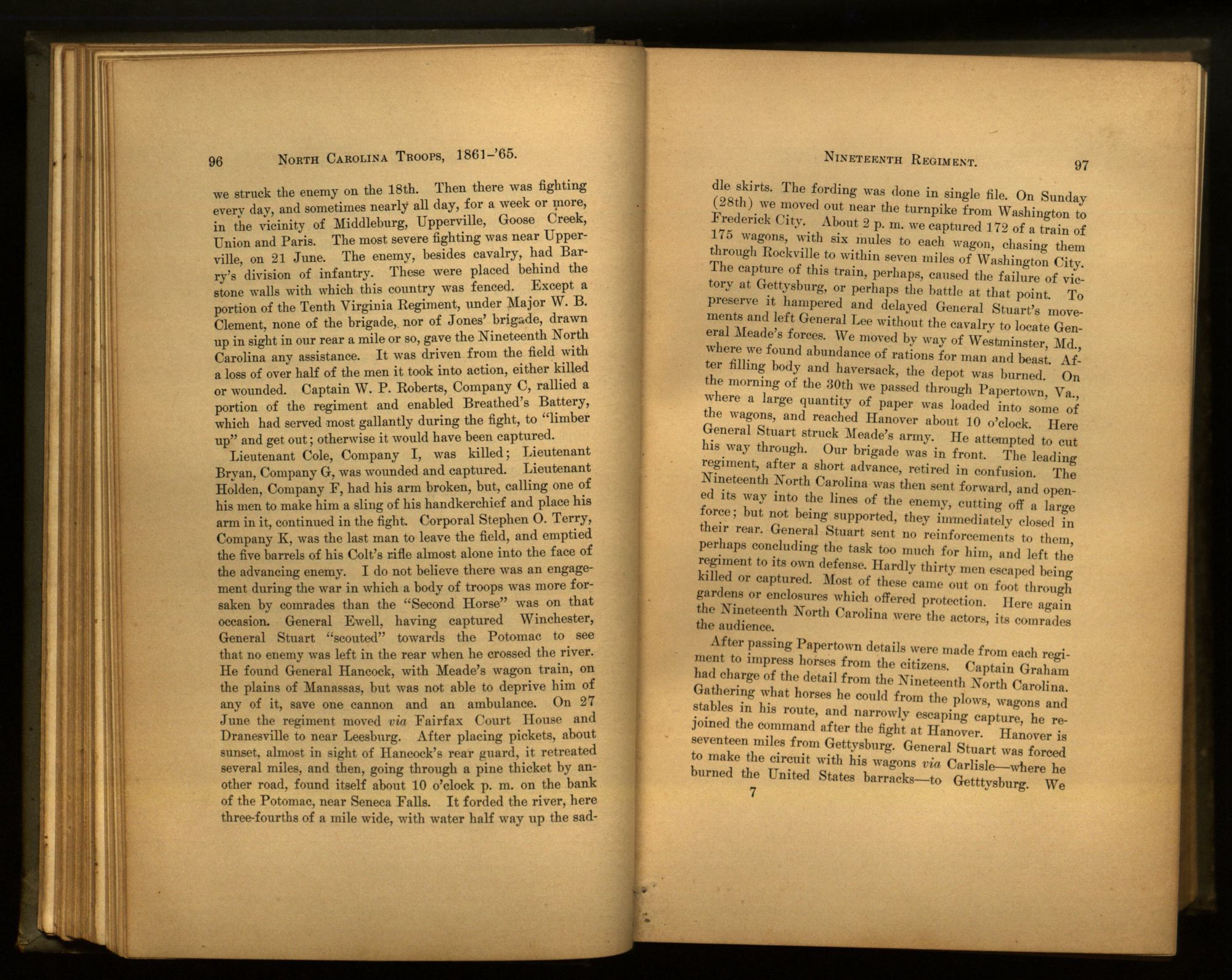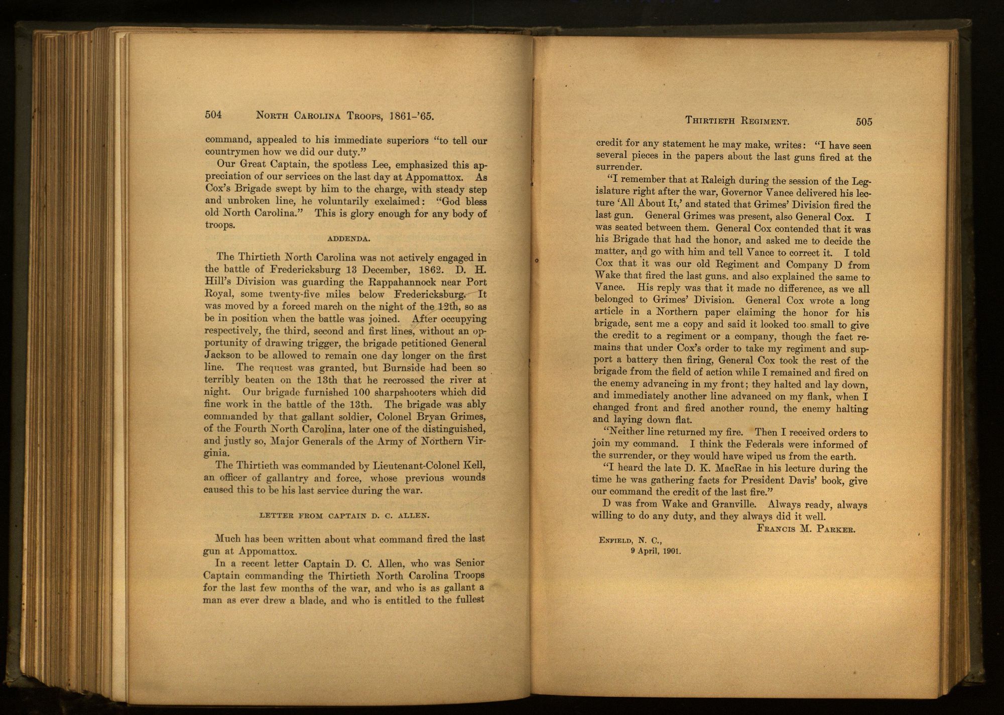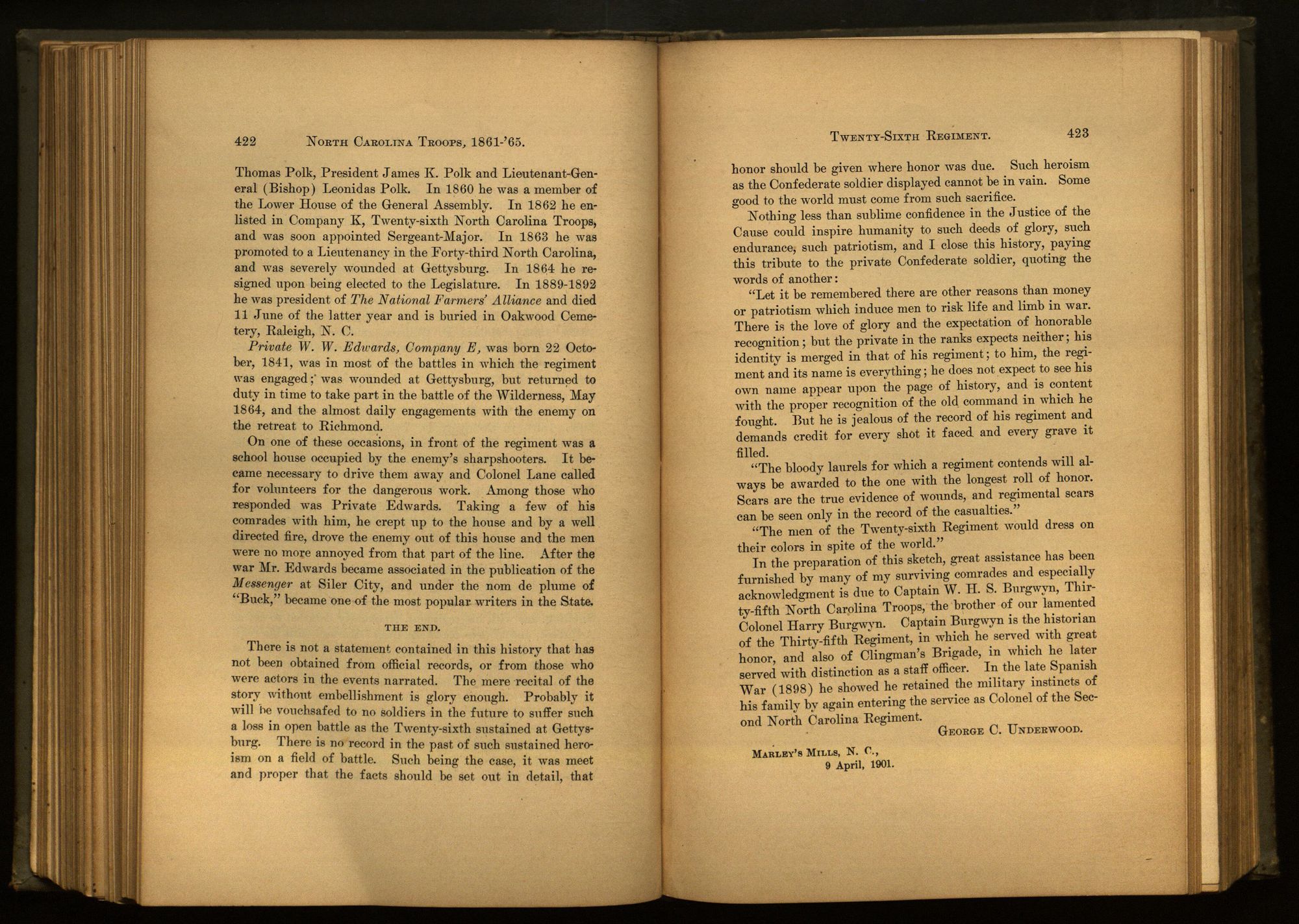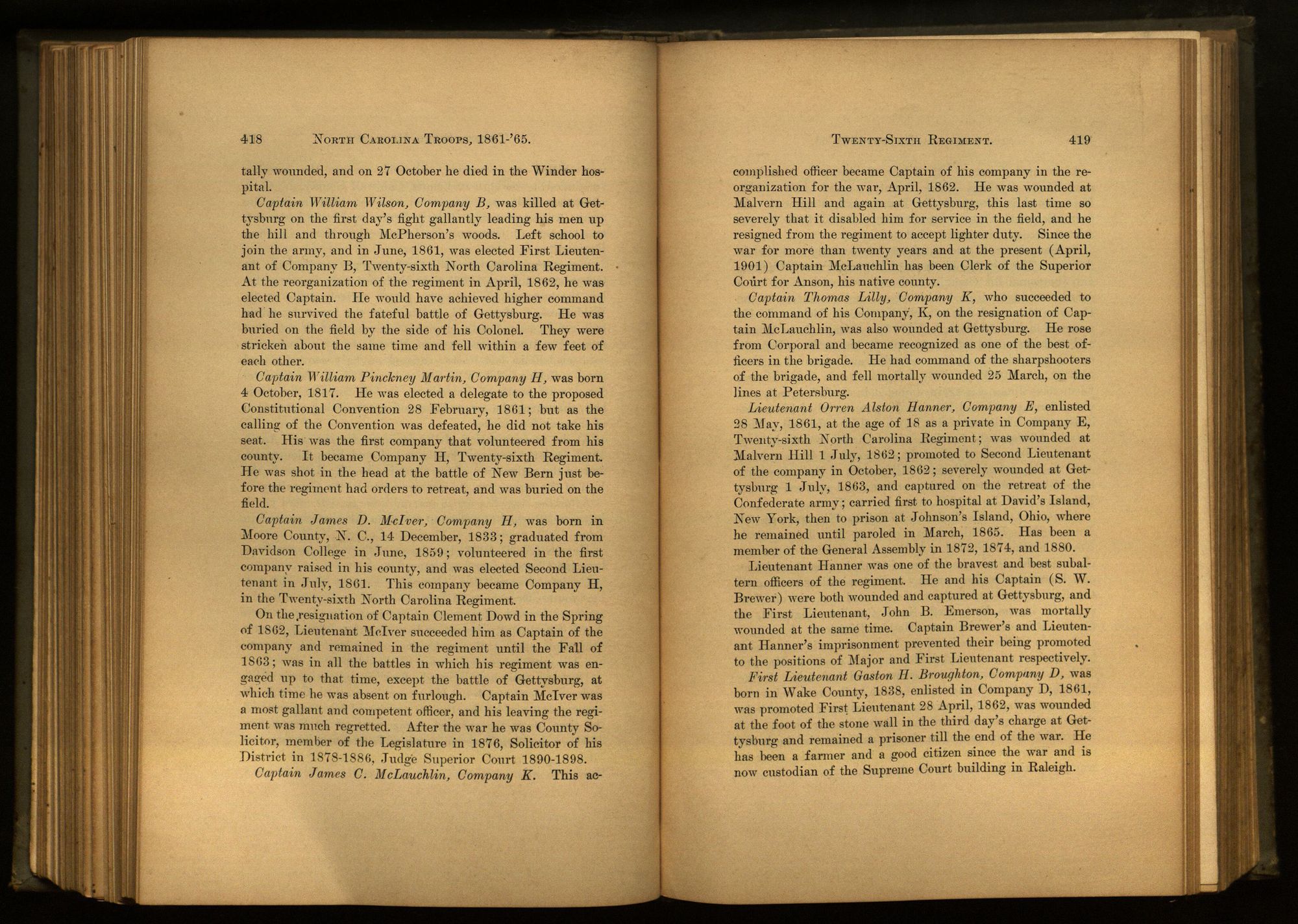 Histories of the several regiments and battalions from North Carolina, in the great war 1861-'65. Written by members of the respective commands. Ed. by Walter Clark. Pub. by the state. Wendell, N.C. (Rte. 2, Box 28A, Wendell 27591) Broadfoot's Bookmark, 1982. 5 v., ill., ports., maps ; 24 cm. Cover title: First at Bethel, farthest to the front at Gettysburg and Chickamauga, last at Appomattox. Spine title: North Carolina regiments, 1861-'65. Reprint. Originally published: [Raleigh, N.C.] : E.M. Uzzell, 1901. Includes indexes.