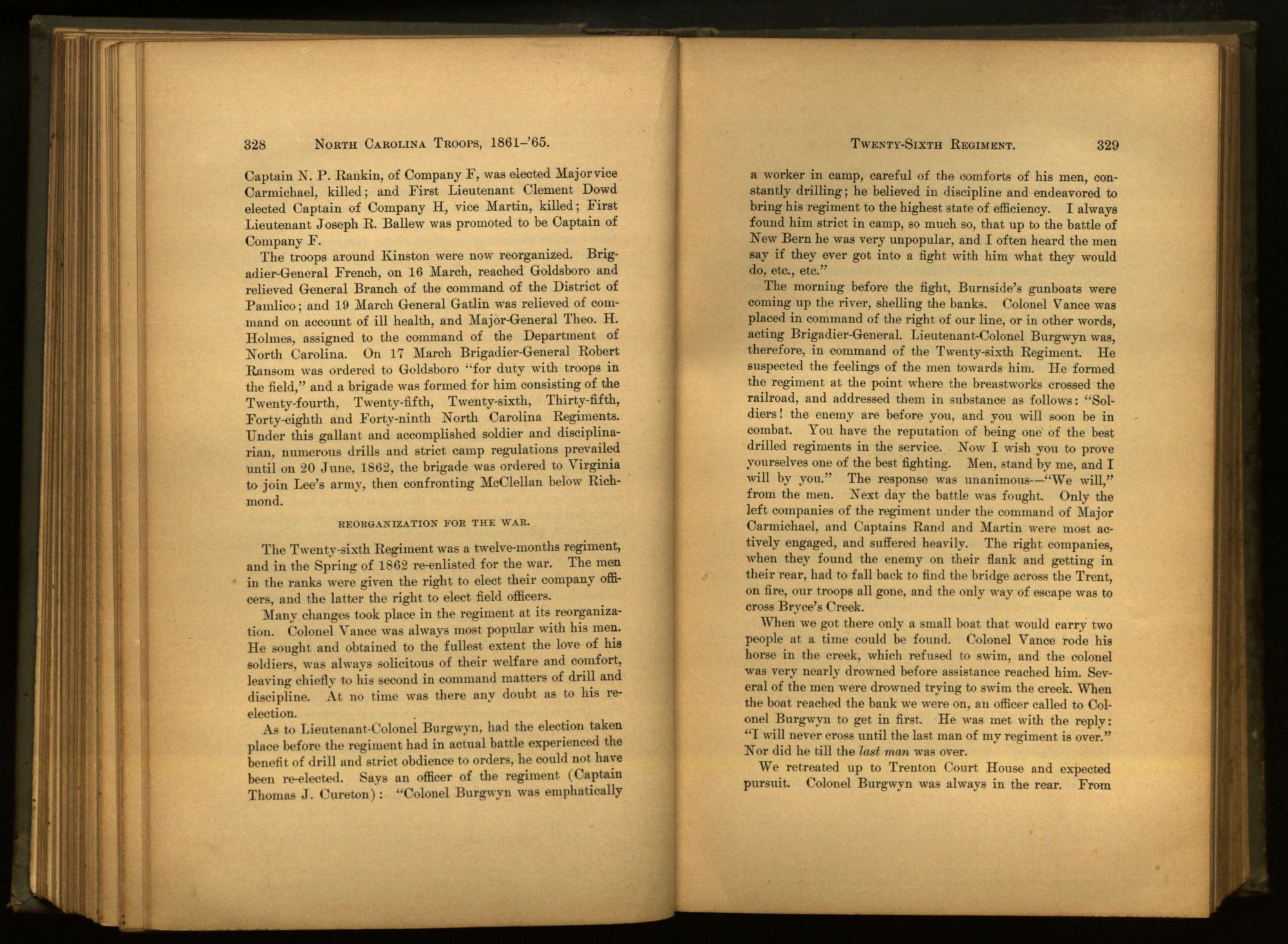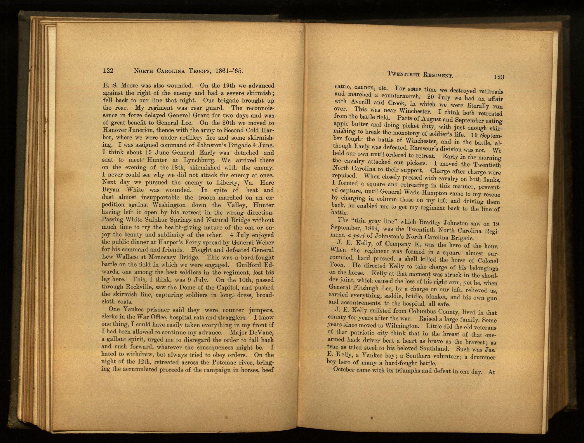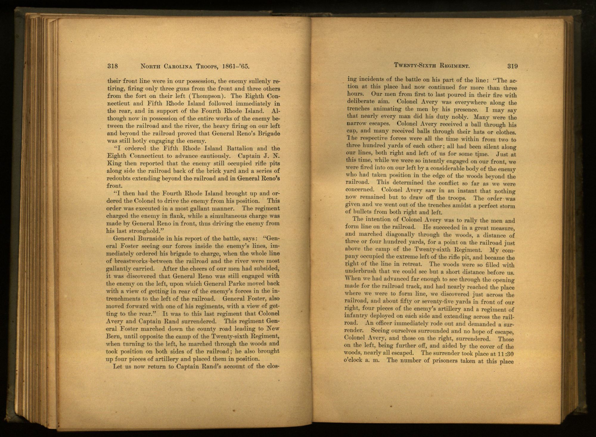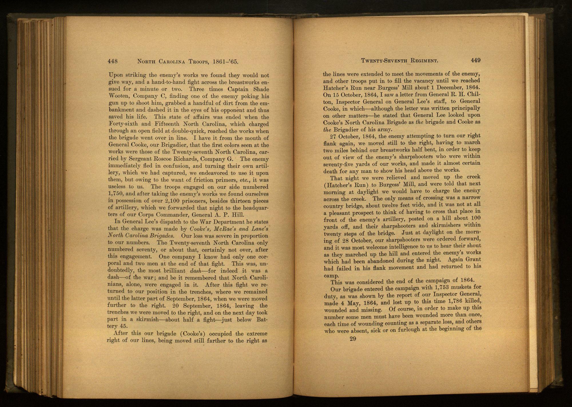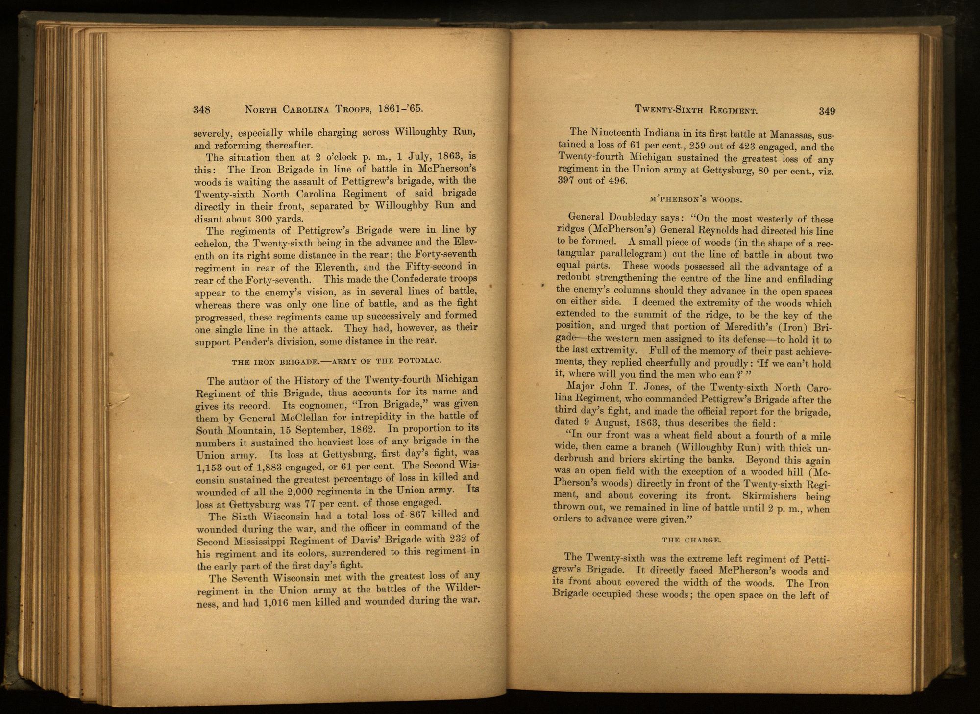 Histories of the several regiments and battalions from North Carolina, in the great war 1861-'65. Written by members of the respective commands. Ed. by Walter Clark. Pub. by the state. Wendell, N.C. (Rte. 2, Box 28A, Wendell 27591) Broadfoot's Bookmark, 1982. 5 v., ill., ports., maps ; 24 cm. Cover title: First at Bethel, farthest to the front at Gettysburg and Chickamauga, last at Appomattox. Spine title: North Carolina regiments, 1861-'65. Reprint. Originally published: [Raleigh, N.C.] : E.M. Uzzell, 1901. Includes indexes.