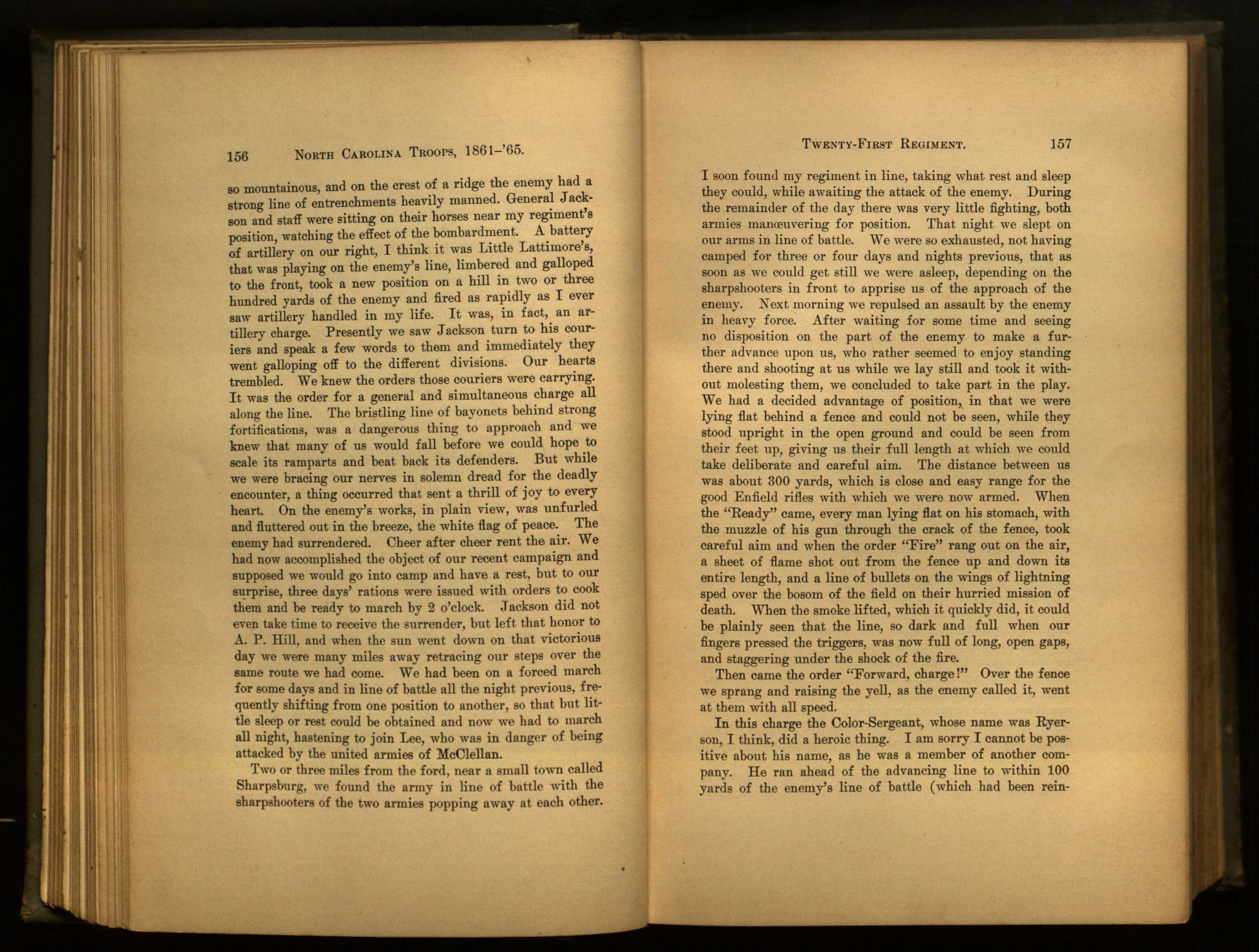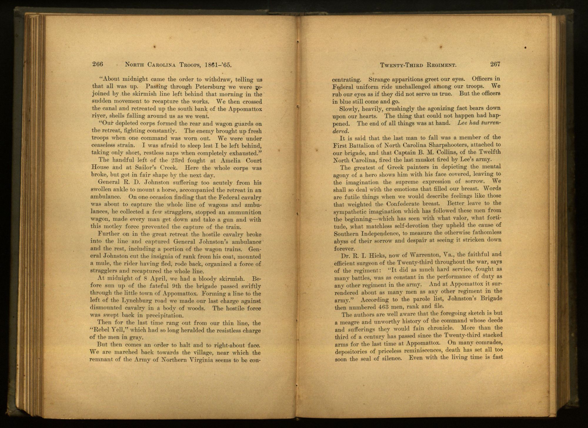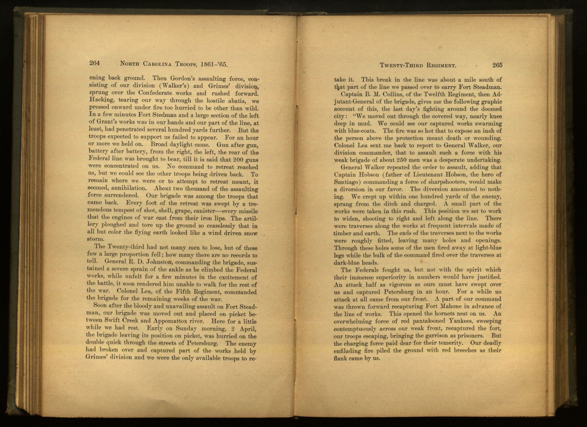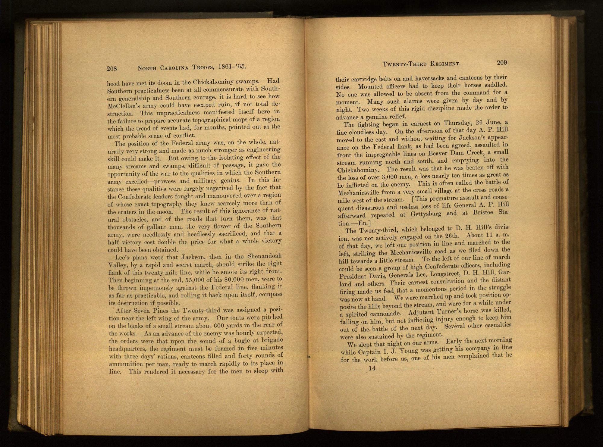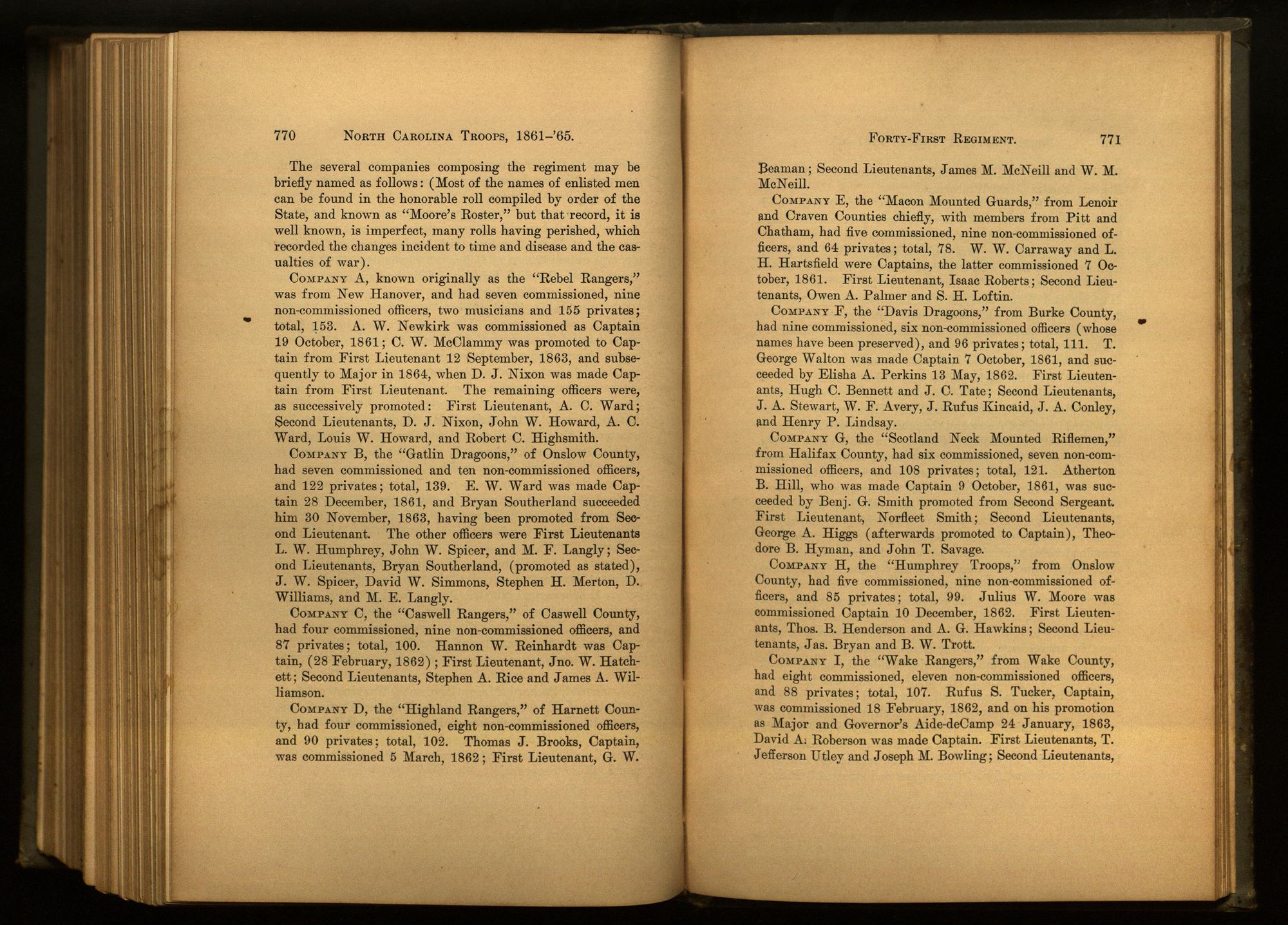 Histories of the several regiments and battalions from North Carolina, in the great war 1861-'65. Written by members of the respective commands. Ed. by Walter Clark. Pub. by the state. Wendell, N.C. (Rte. 2, Box 28A, Wendell 27591) Broadfoot's Bookmark, 1982. 5 v., ill., ports., maps ; 24 cm. Cover title: First at Bethel, farthest to the front at Gettysburg and Chickamauga, last at Appomattox. Spine title: North Carolina regiments, 1861-'65. Reprint. Originally published: [Raleigh, N.C.] : E.M. Uzzell, 1901. Includes indexes.