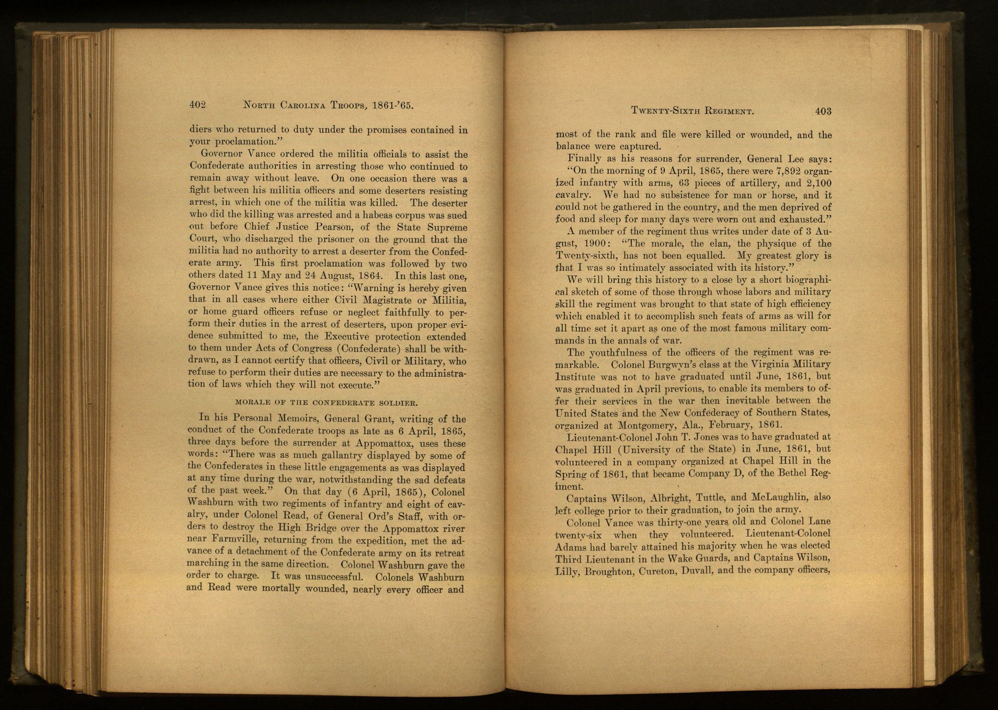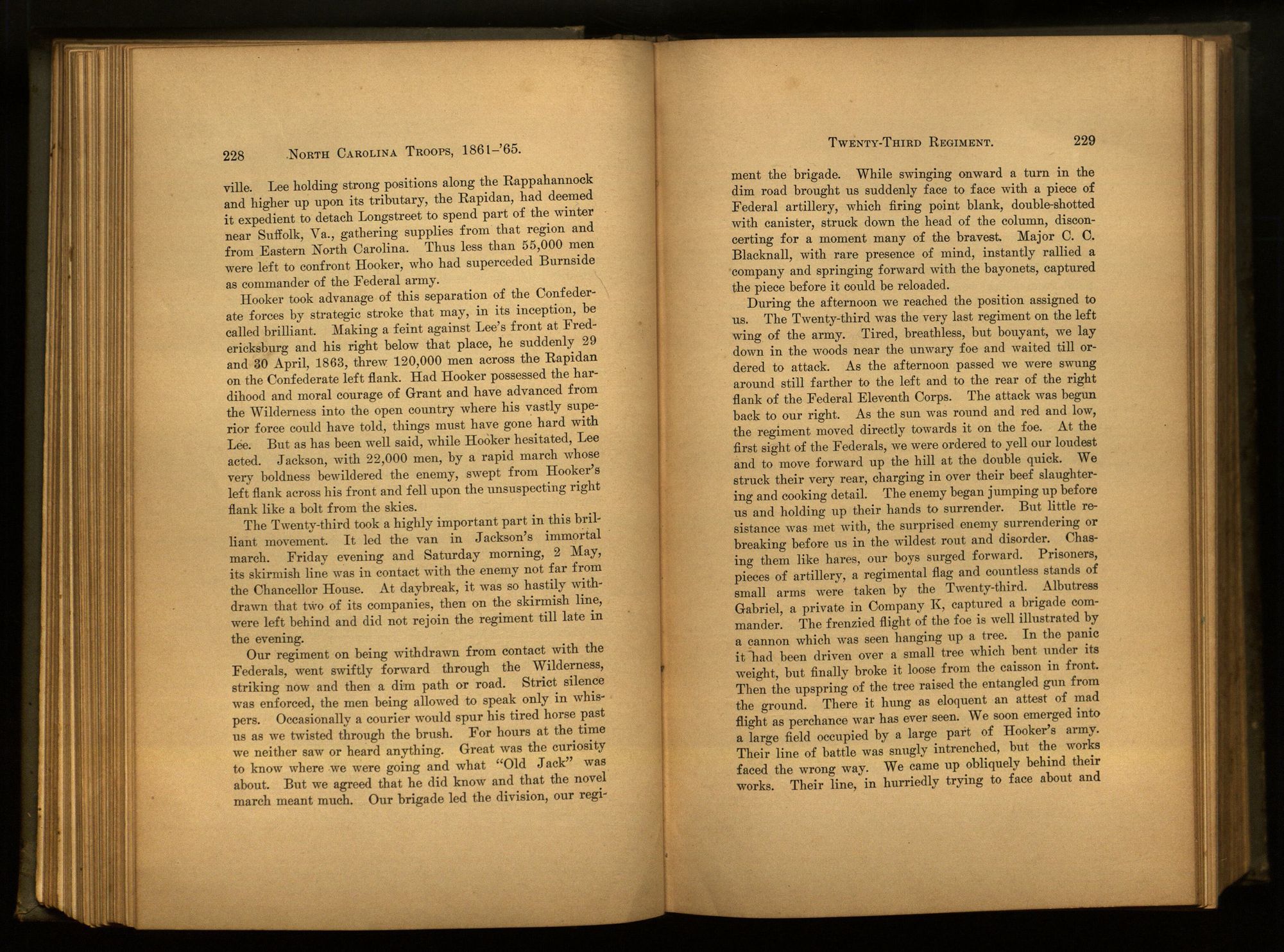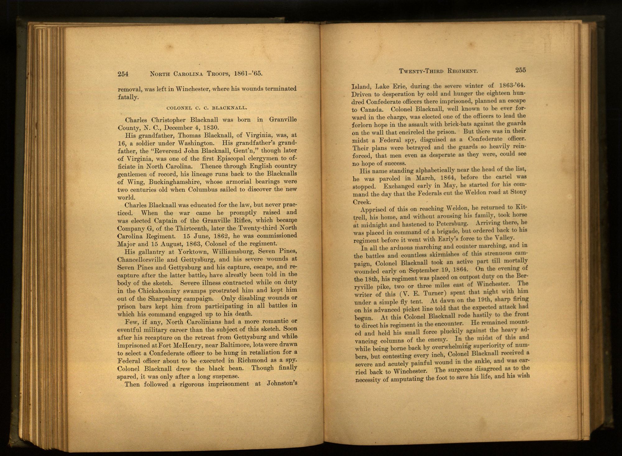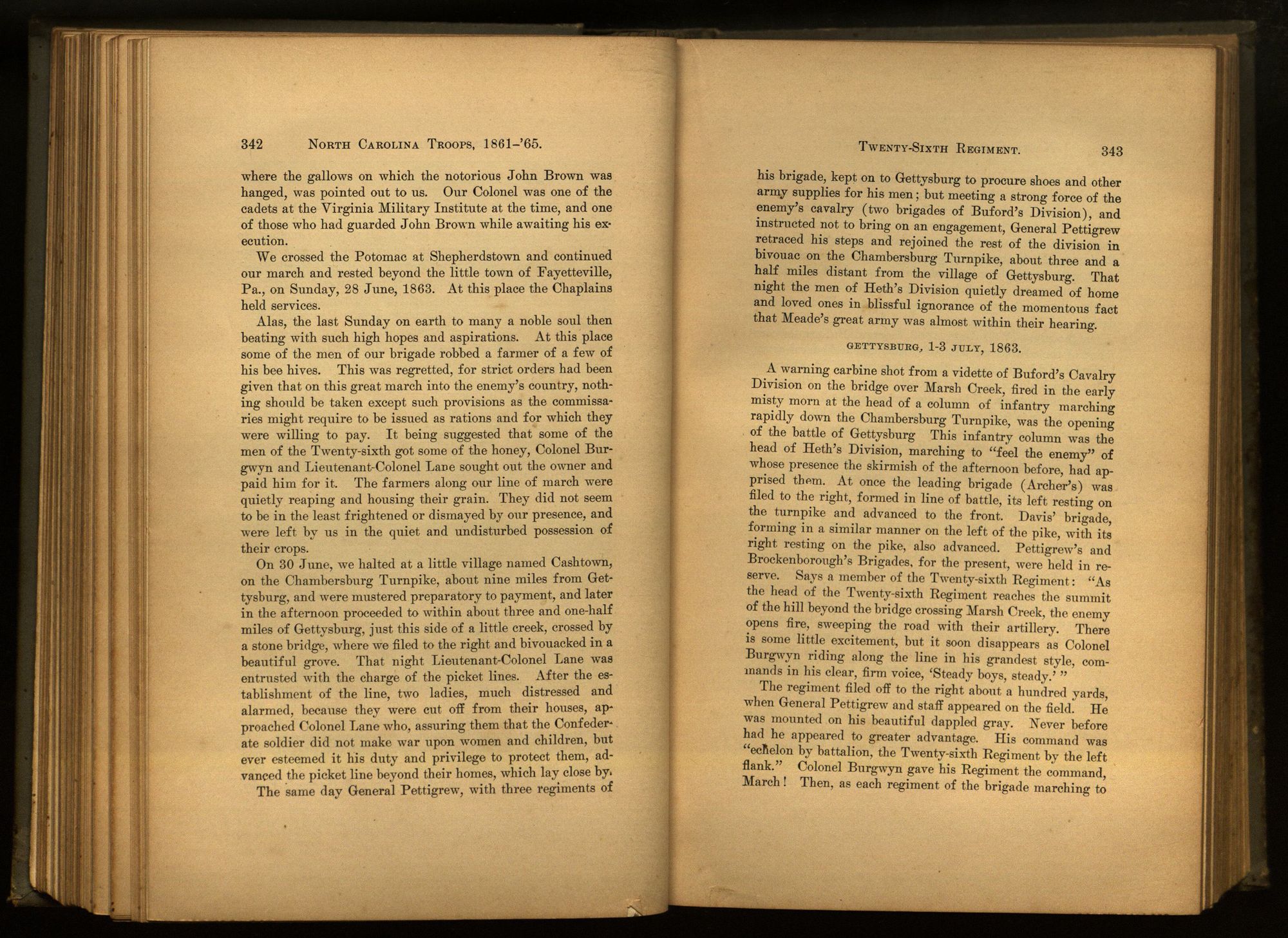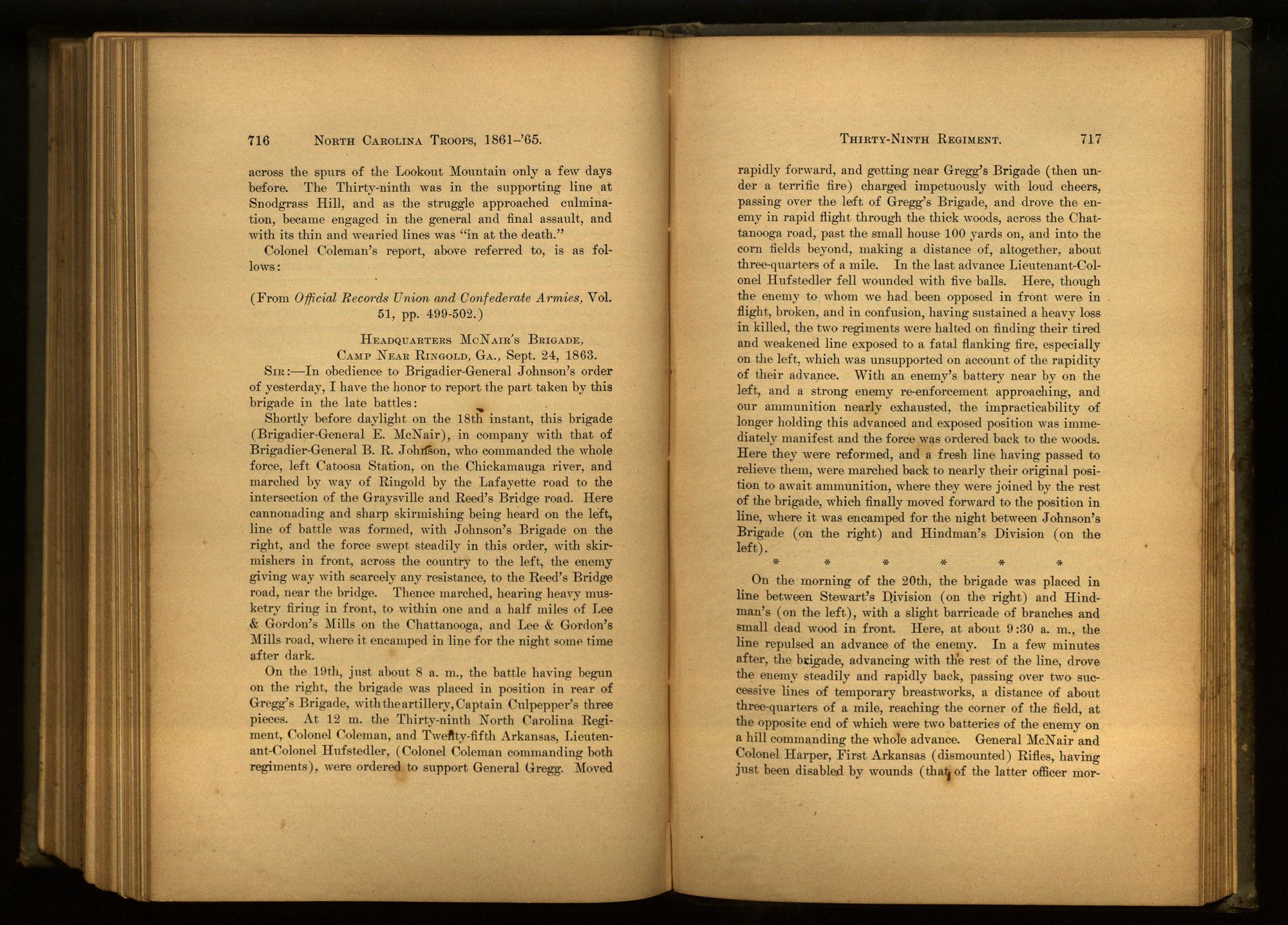 Histories of the several regiments and battalions from North Carolina, in the great war 1861-'65. Written by members of the respective commands. Ed. by Walter Clark. Pub. by the state. Wendell, N.C. (Rte. 2, Box 28A, Wendell 27591) Broadfoot's Bookmark, 1982. 5 v., ill., ports., maps ; 24 cm. Cover title: First at Bethel, farthest to the front at Gettysburg and Chickamauga, last at Appomattox. Spine title: North Carolina regiments, 1861-'65. Reprint. Originally published: [Raleigh, N.C.] : E.M. Uzzell, 1901. Includes indexes.
