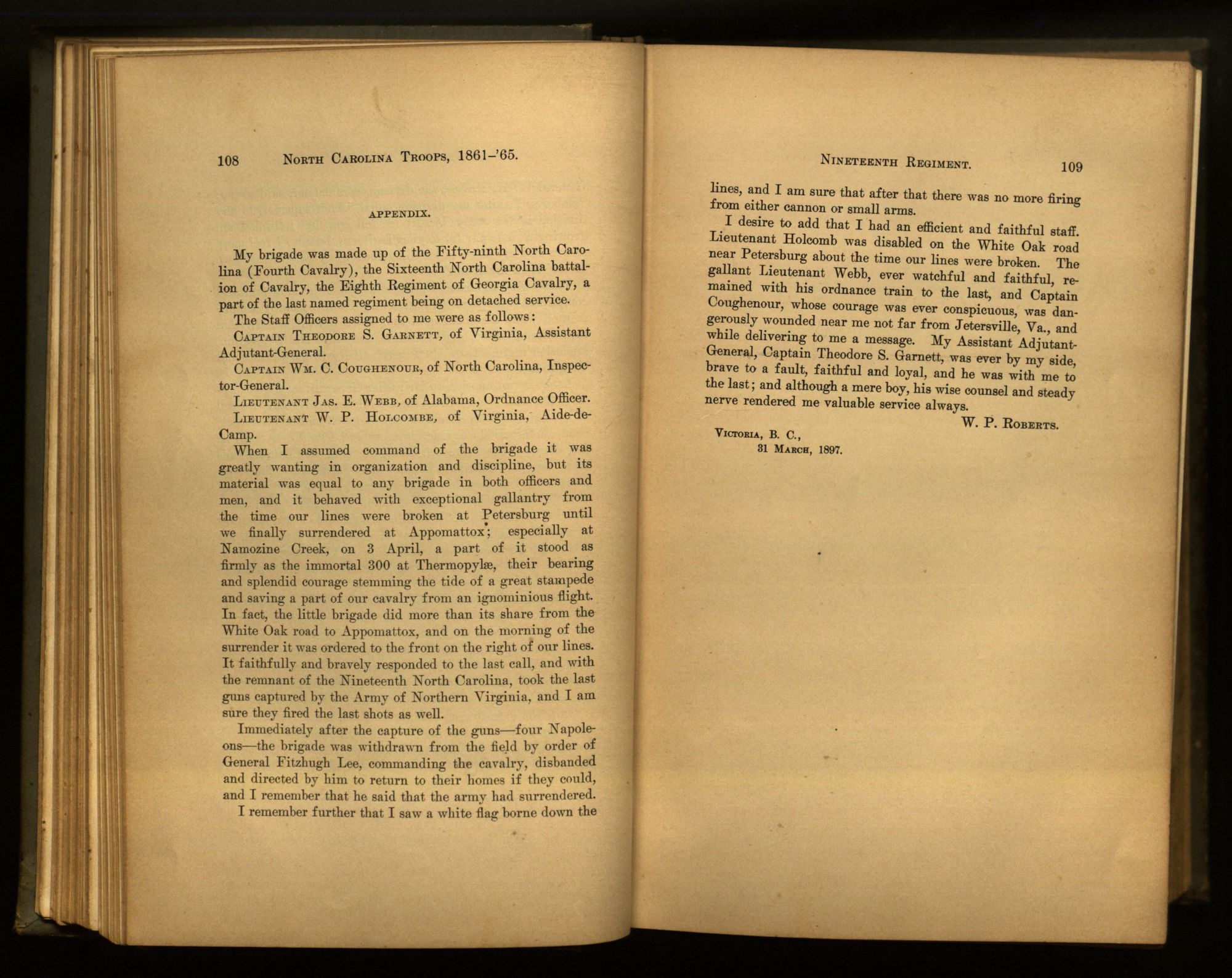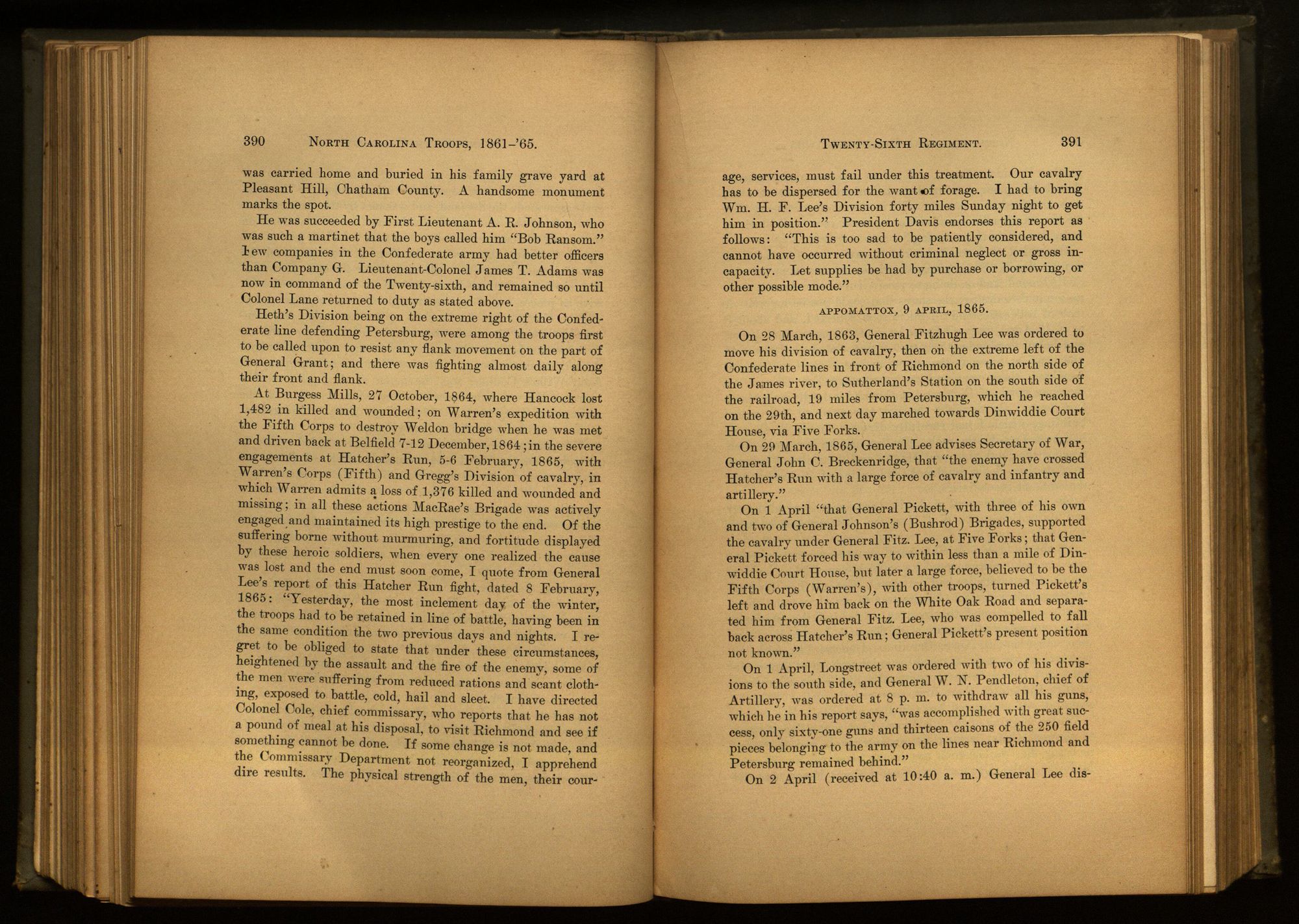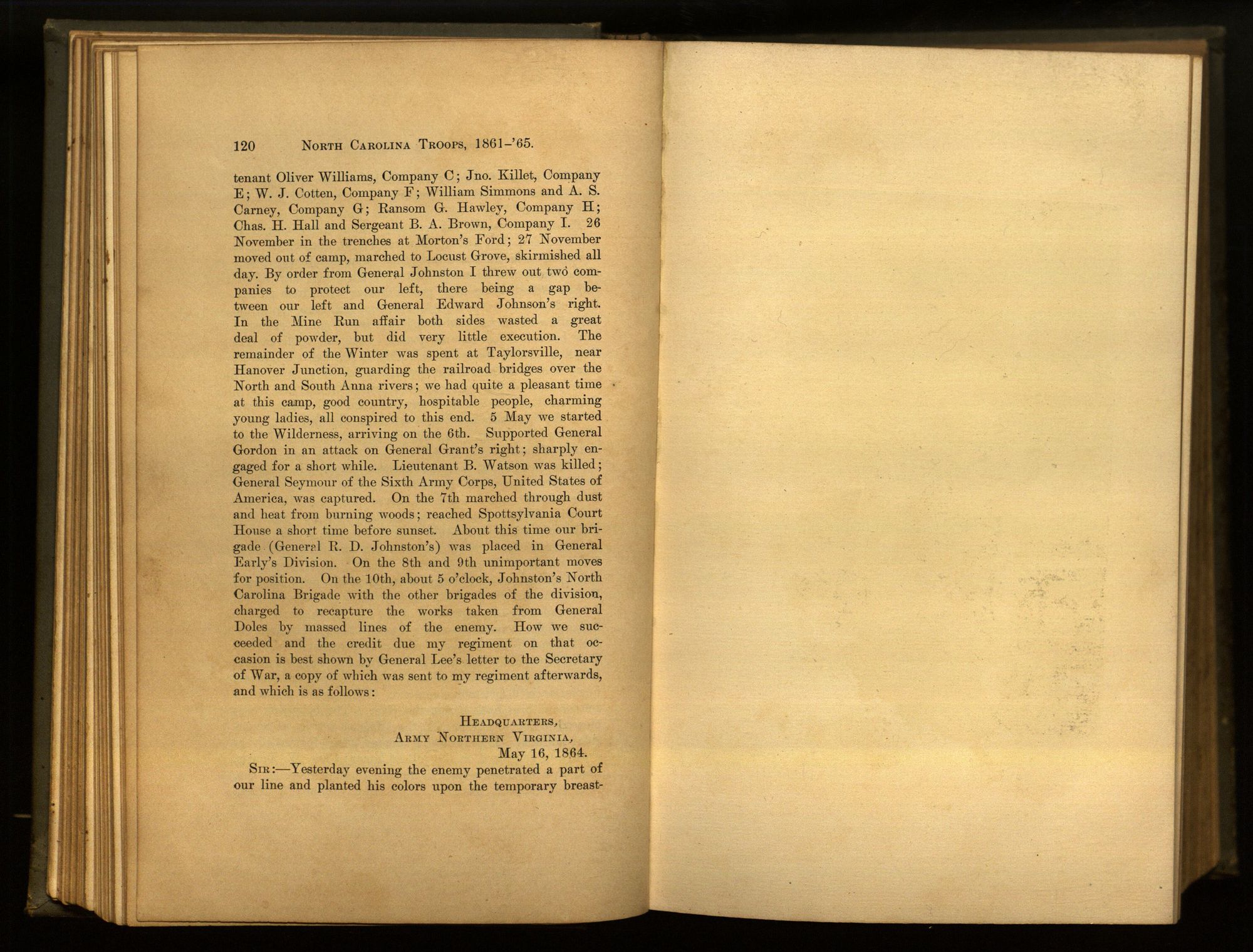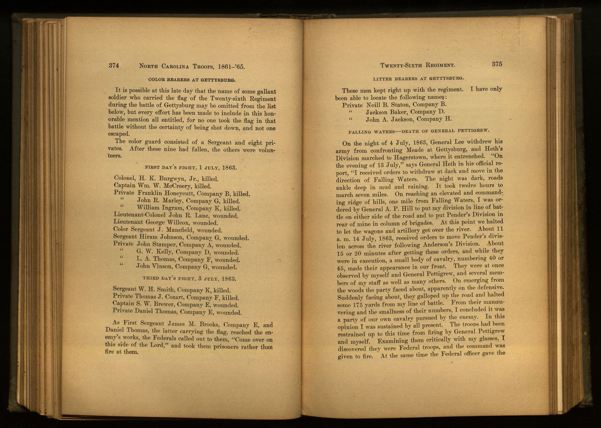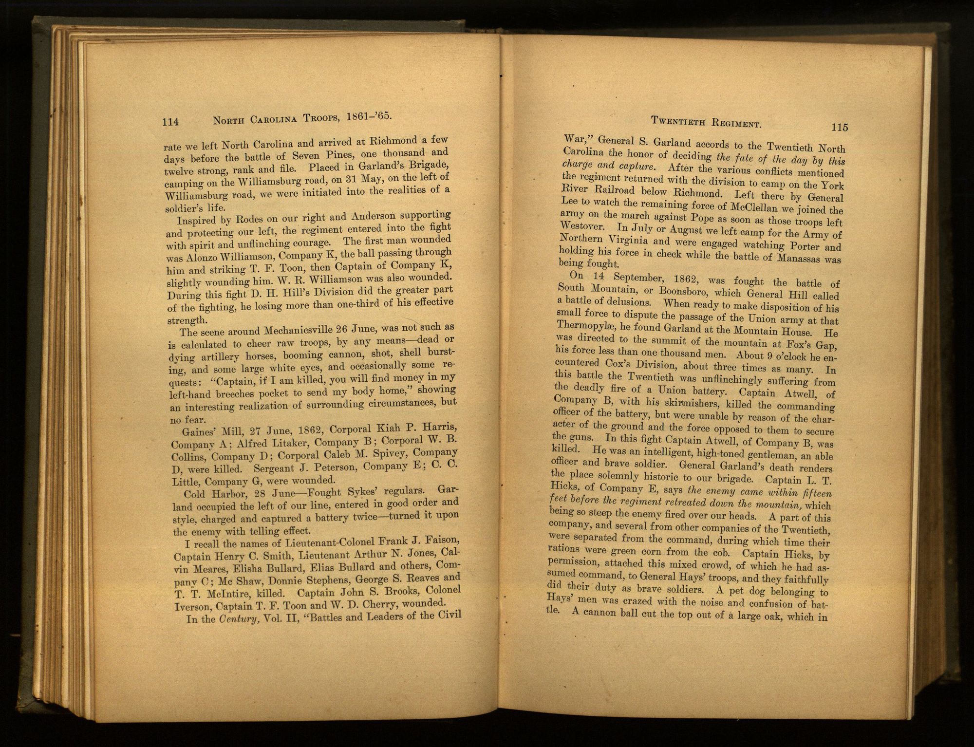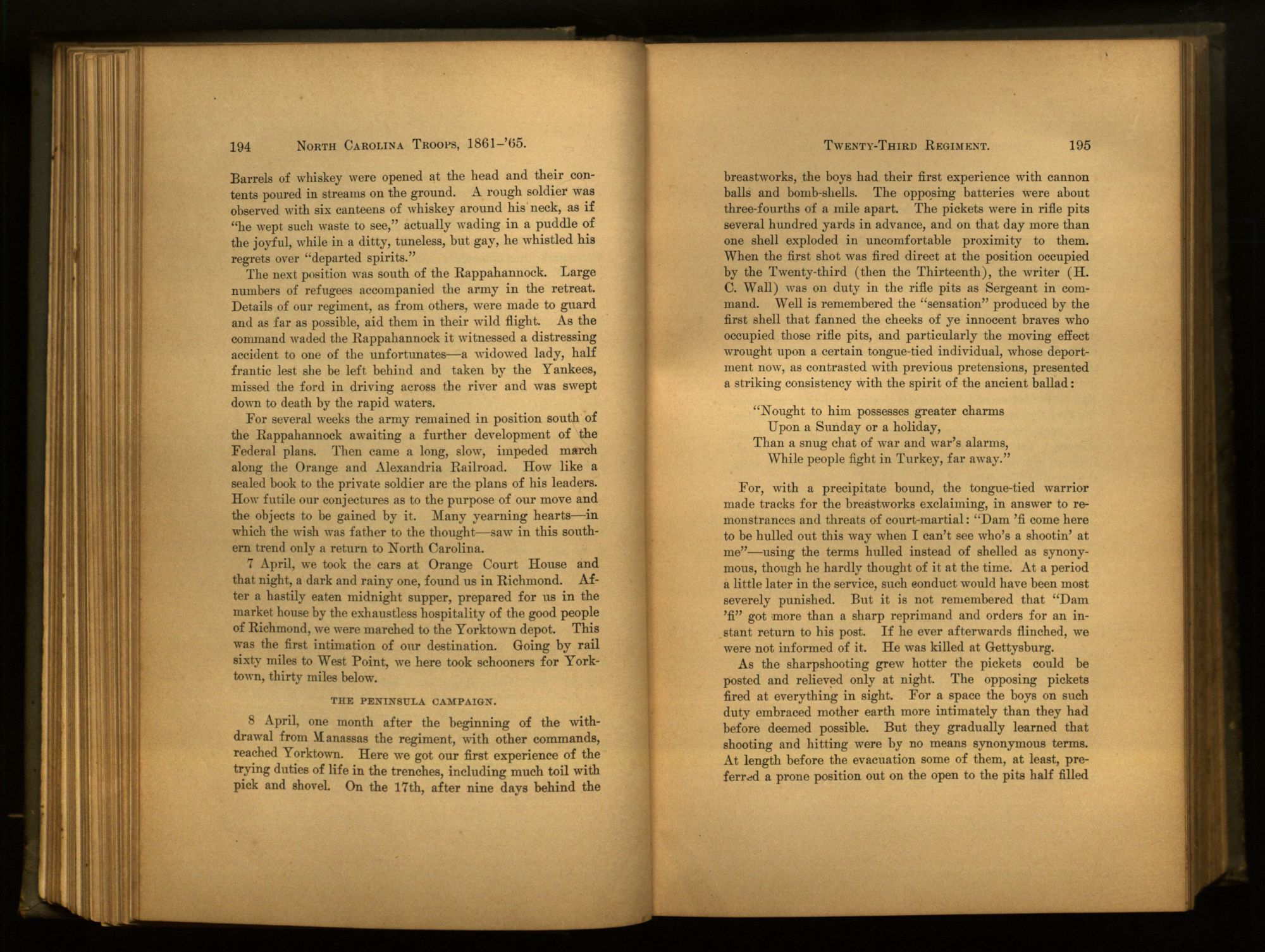 Histories of the several regiments and battalions from North Carolina, in the great war 1861-'65. Written by members of the respective commands. Ed. by Walter Clark. Pub. by the state. Wendell, N.C. (Rte. 2, Box 28A, Wendell 27591) Broadfoot's Bookmark, 1982. 5 v., ill., ports., maps ; 24 cm. Cover title: First at Bethel, farthest to the front at Gettysburg and Chickamauga, last at Appomattox. Spine title: North Carolina regiments, 1861-'65. Reprint. Originally published: [Raleigh, N.C.] : E.M. Uzzell, 1901. Includes indexes.