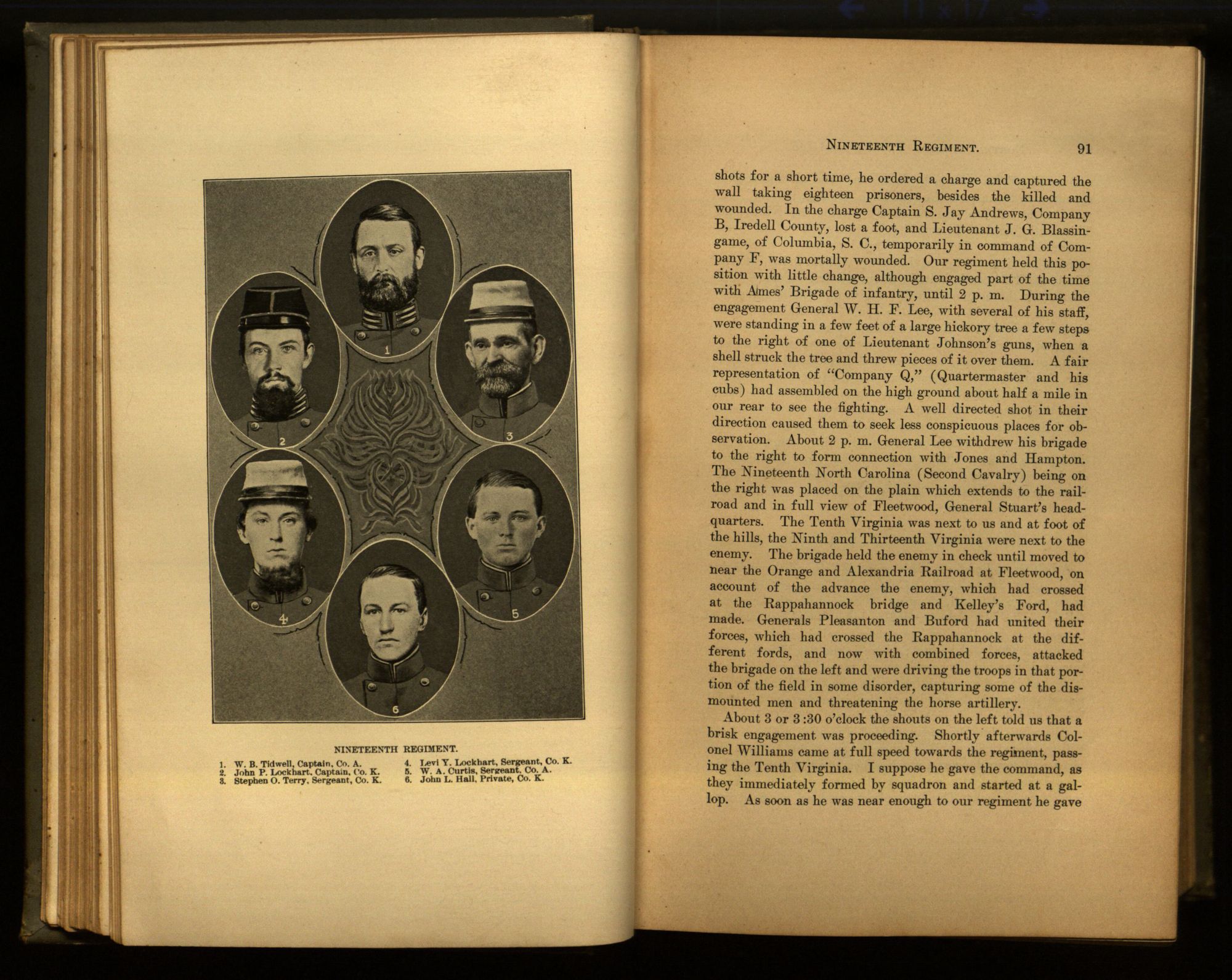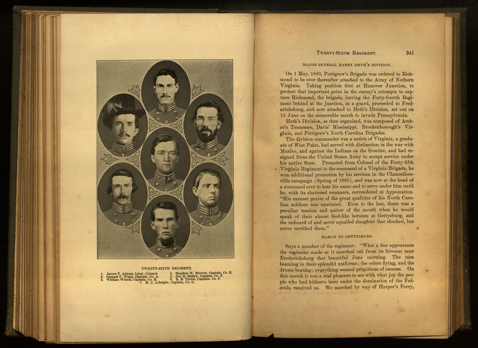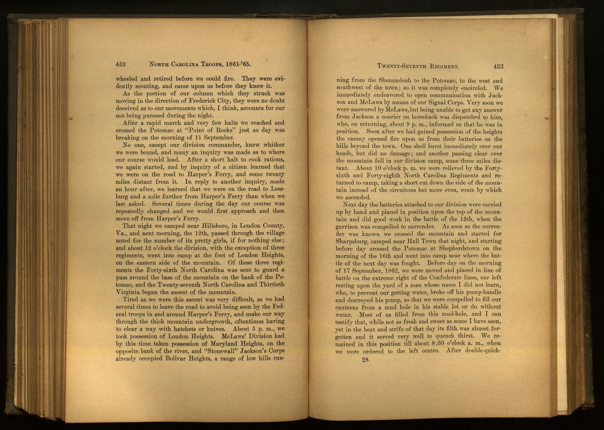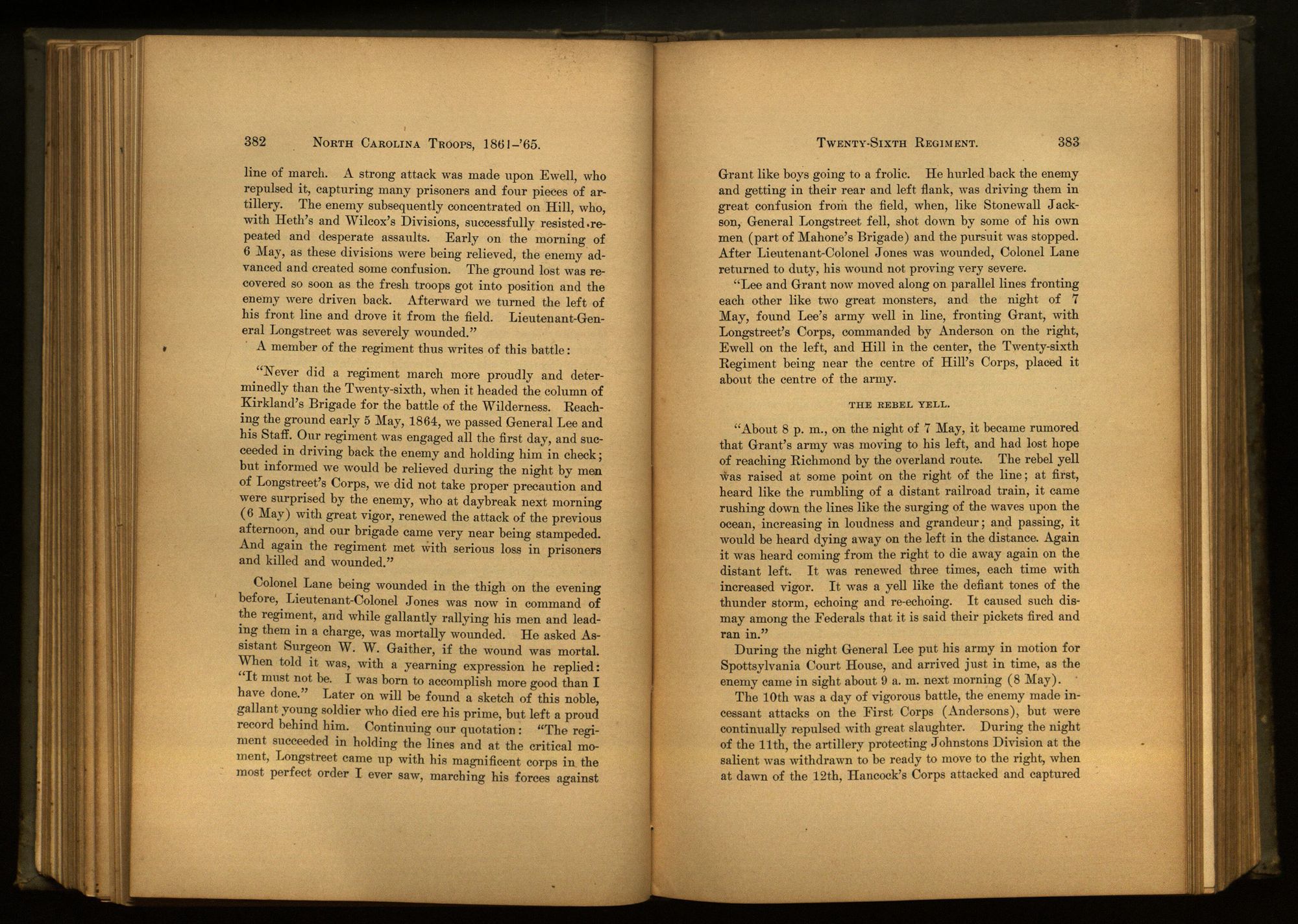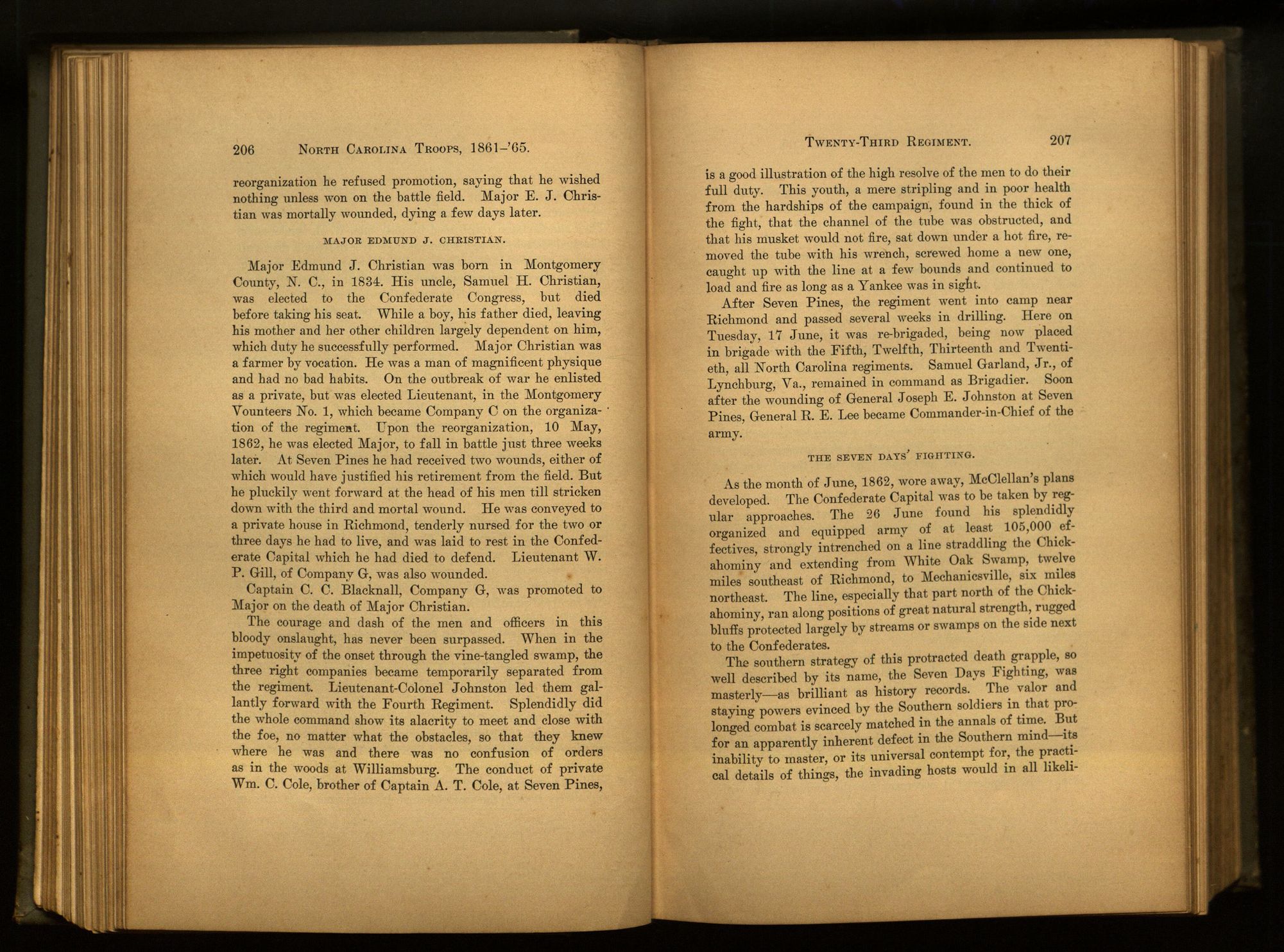 Histories of the several regiments and battalions from North Carolina, in the great war 1861-'65. Written by members of the respective commands. Ed. by Walter Clark. Pub. by the state. Wendell, N.C. (Rte. 2, Box 28A, Wendell 27591) Broadfoot's Bookmark, 1982. 5 v., ill., ports., maps ; 24 cm. Cover title: First at Bethel, farthest to the front at Gettysburg and Chickamauga, last at Appomattox. Spine title: North Carolina regiments, 1861-'65. Reprint. Originally published: [Raleigh, N.C.] : E.M. Uzzell, 1901. Includes indexes.